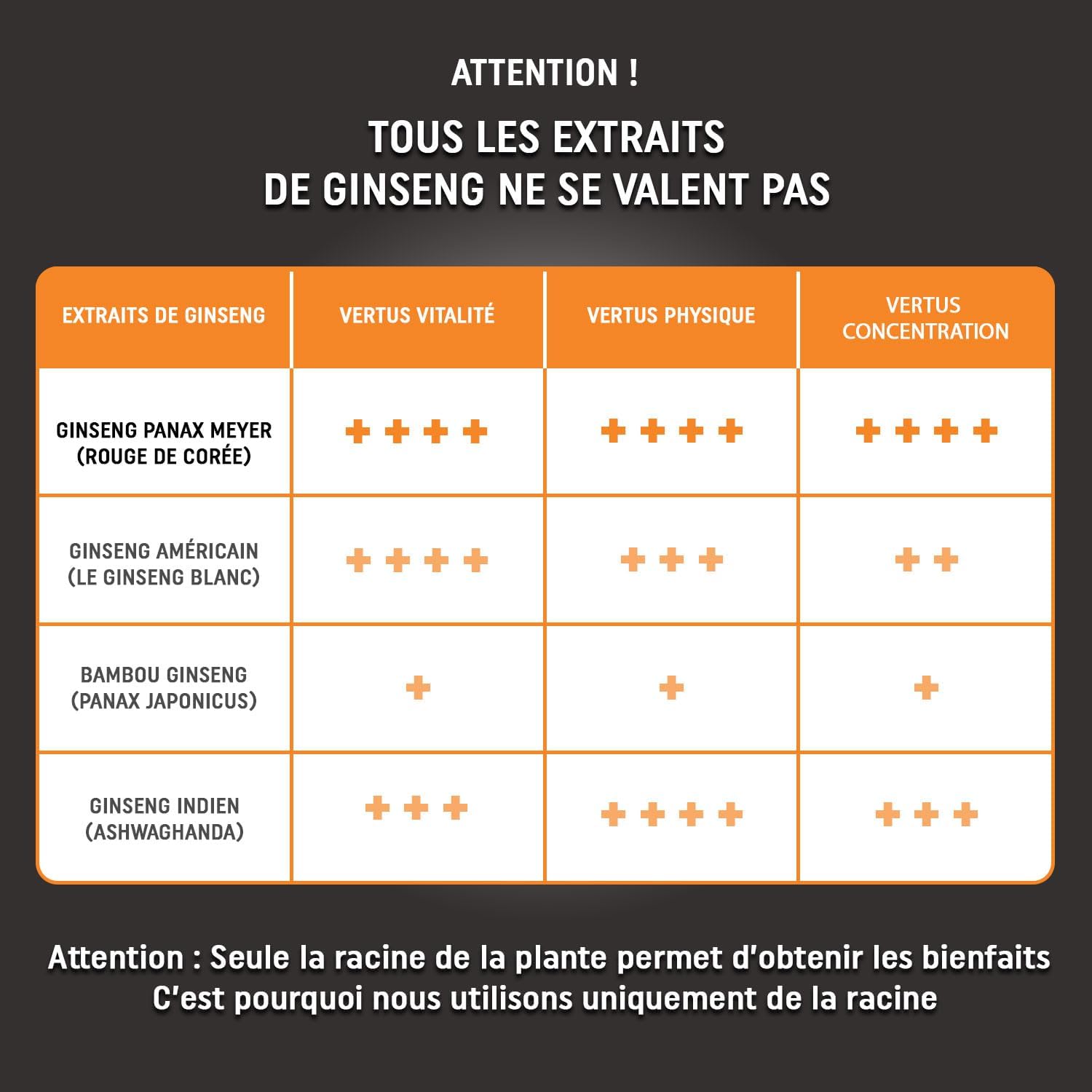 Avantages : 100% Ginseng Rouge de Corée Dosage élevé : 1000mg/j testé Uniquement de la Racine de Ginseng Fortement titré en Ginsénosides : 12,5mg 2 gélules par jour – 2 mois de cure Formule et gélules végans Emballage bio-végétal Façonnage et contrôle qualité en France