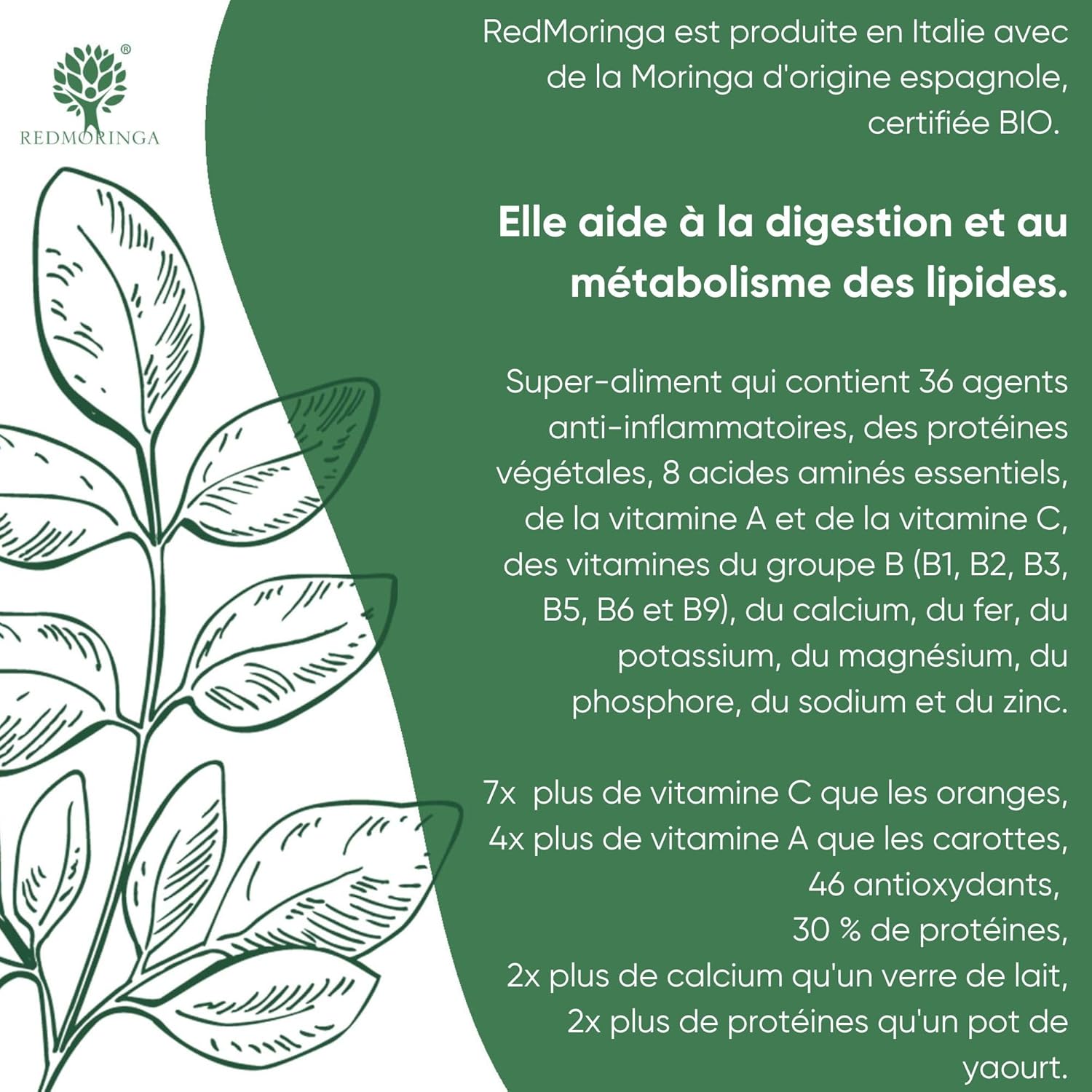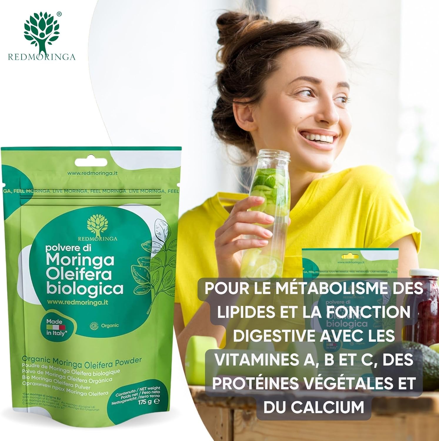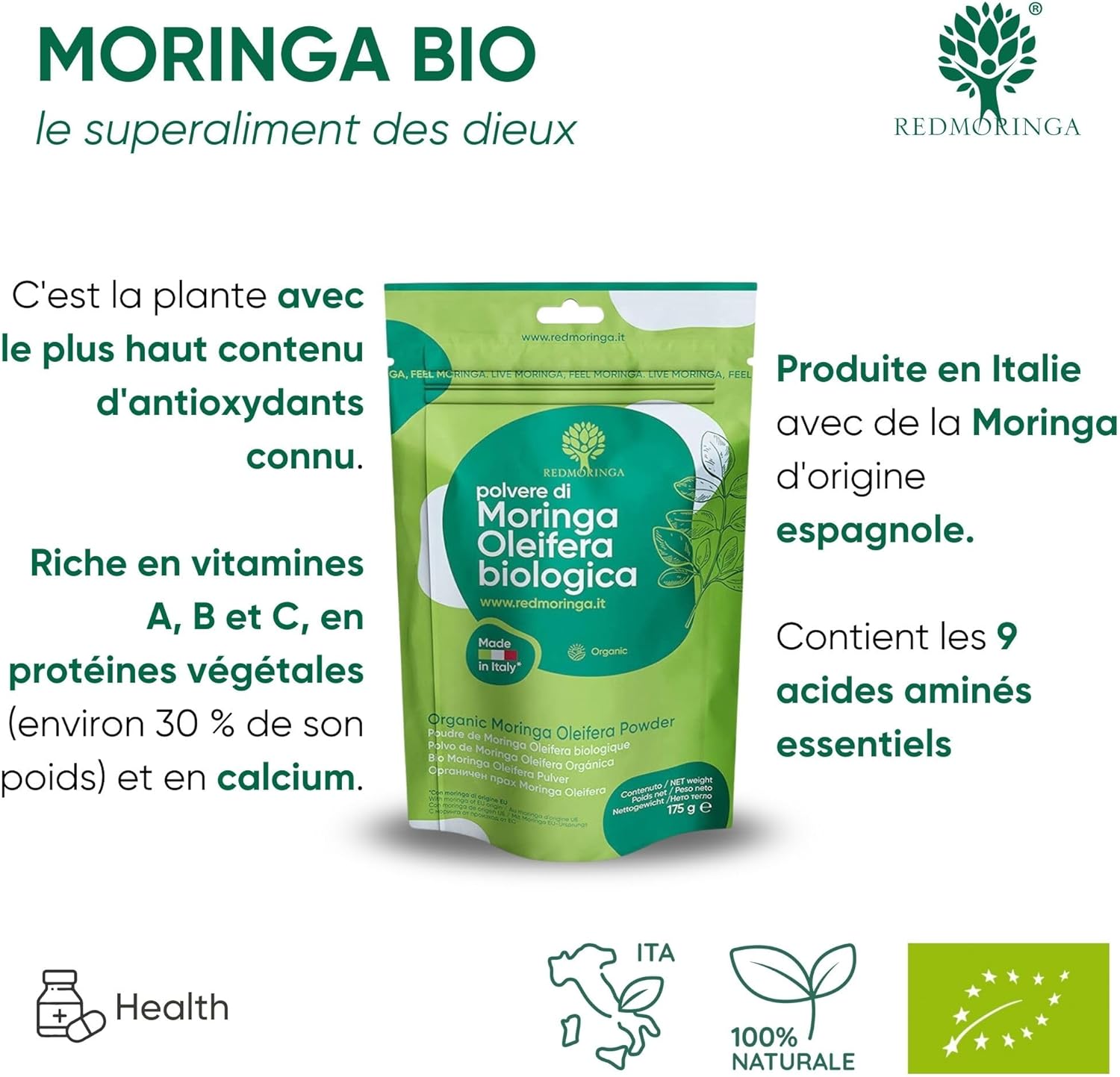 Moringa oleifera organic powder – 175 g of Moringa, a superfood rich in vitamins, minerals and amino acids essential for the proper functioning of the body. Its antioxidant properties help prevent cell aging.