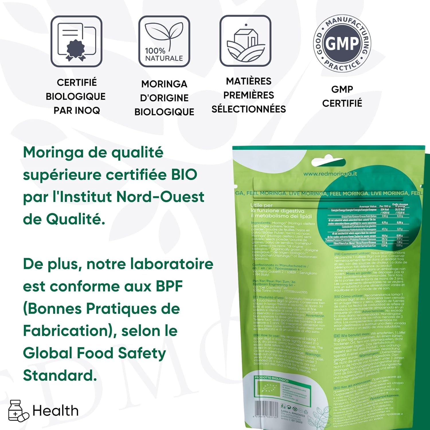 Certified Organic Moringa – Our Moringa, grown and packaged in Italy, comes from certified organic farming. Product notified to the Ministry of Health.
