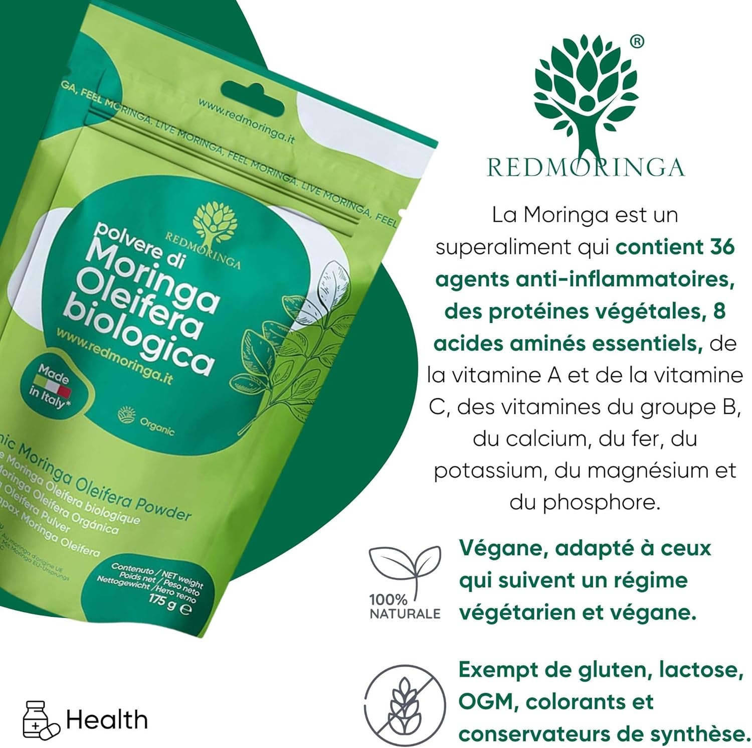 RedMoringa Moringa Oleifera Organic Powder – Plant Protein 30% – Source of Vitamins, Minerals and Amino Acids – Made in Italy 175g