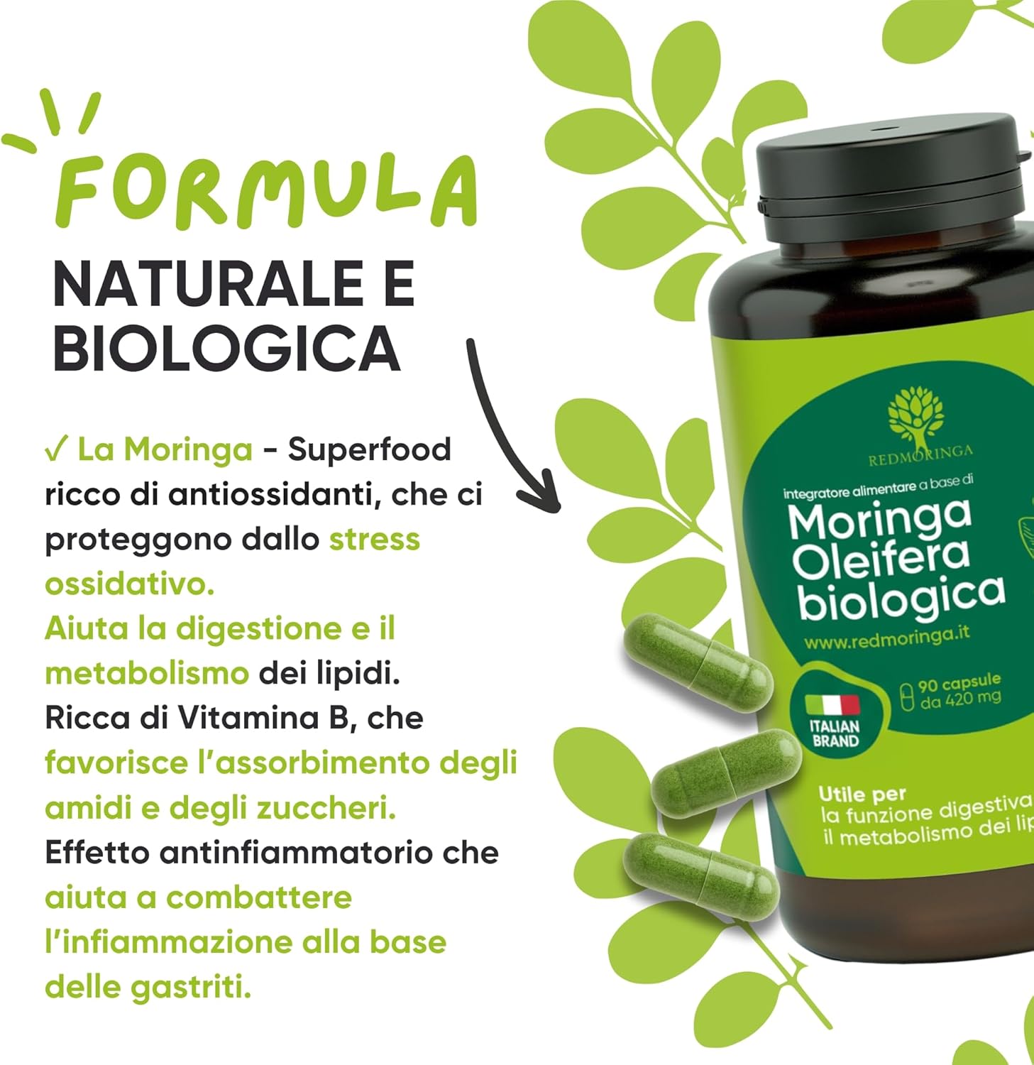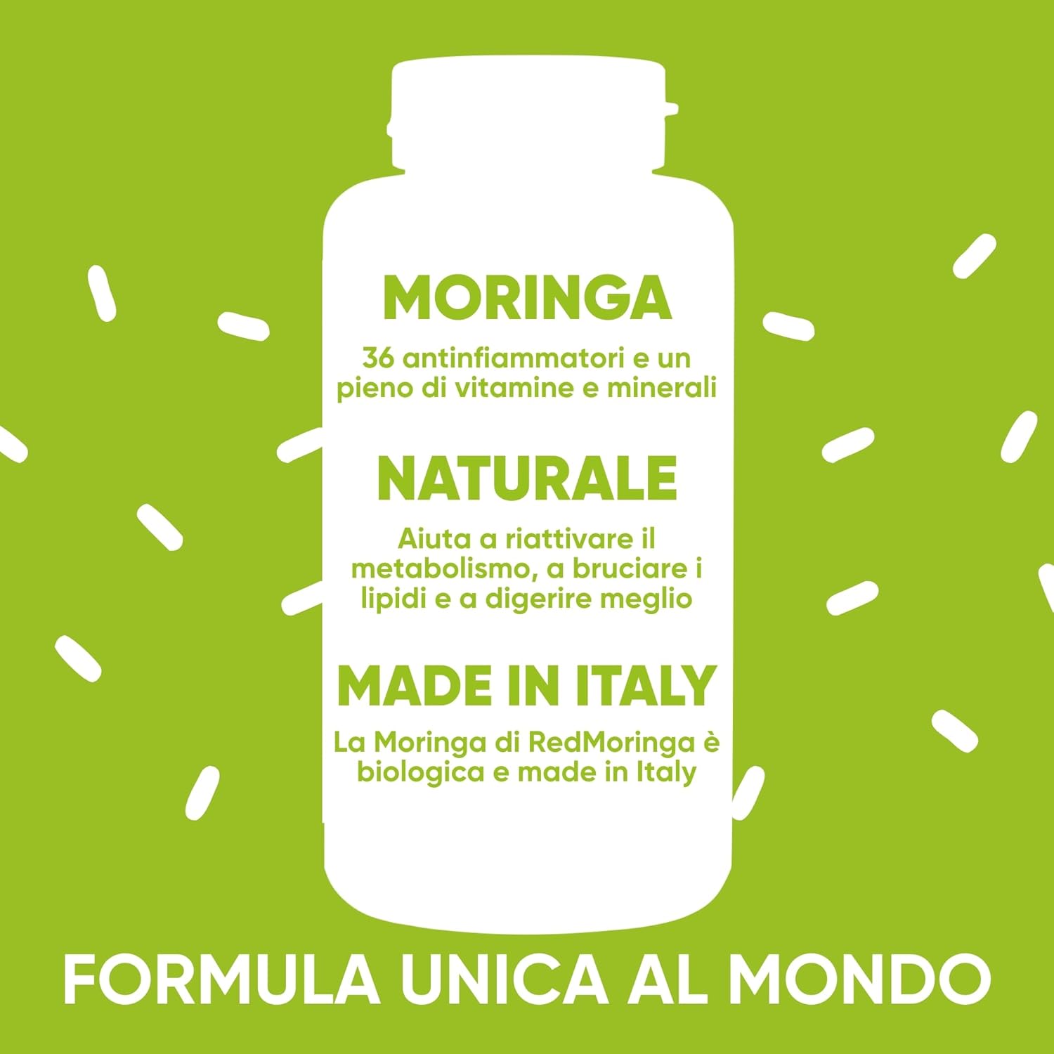 La Moringa è un superfood che contiene 36 agenti antinfiammatori, proteine vegetali, 8 amminoacidi essenziali, Vitamina A e Vitamina C, Vitamine del gruppo B, Calcio, Ferro, Potassio, Magnesio, Fosforo, Sodio, Zinco.