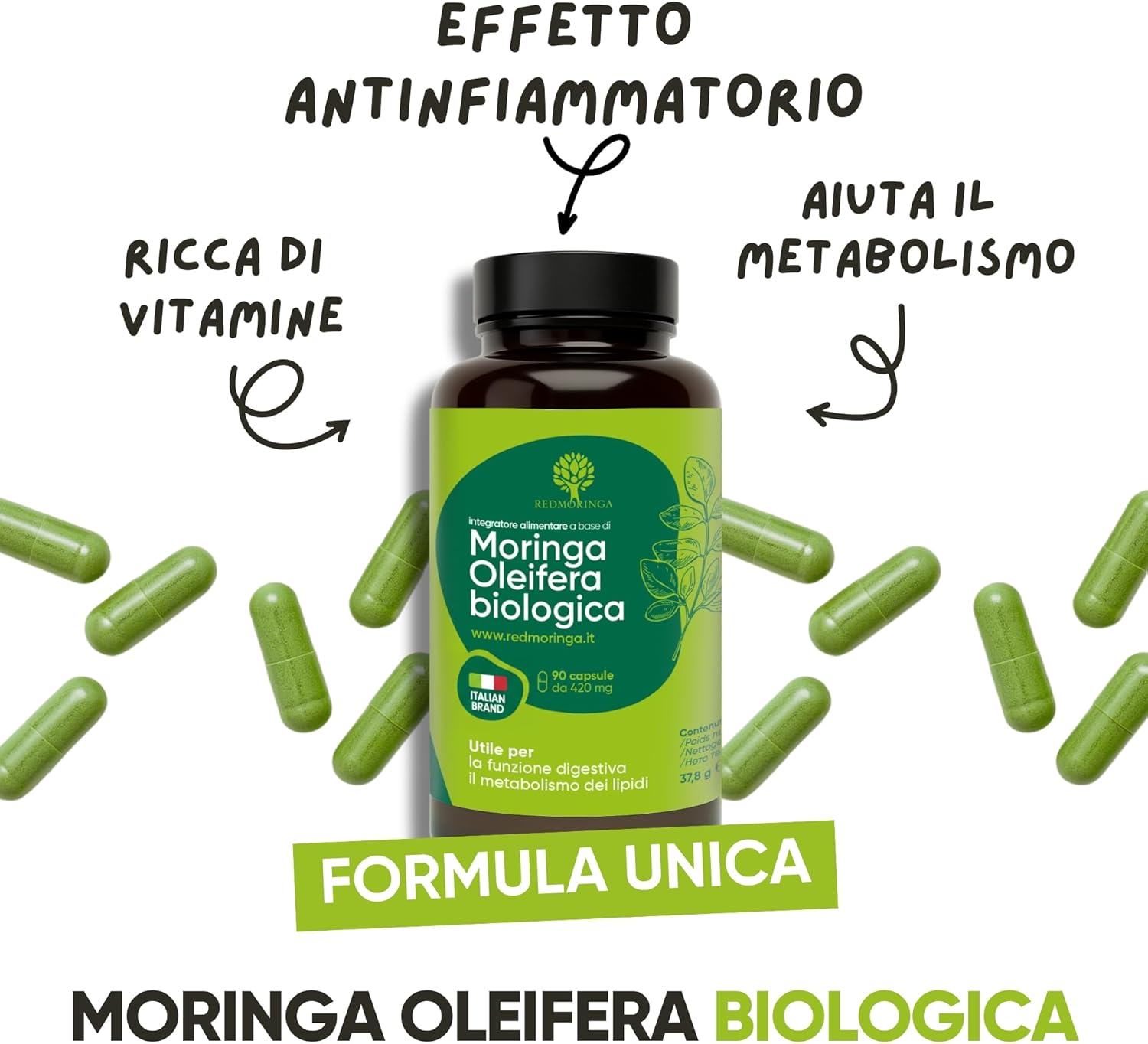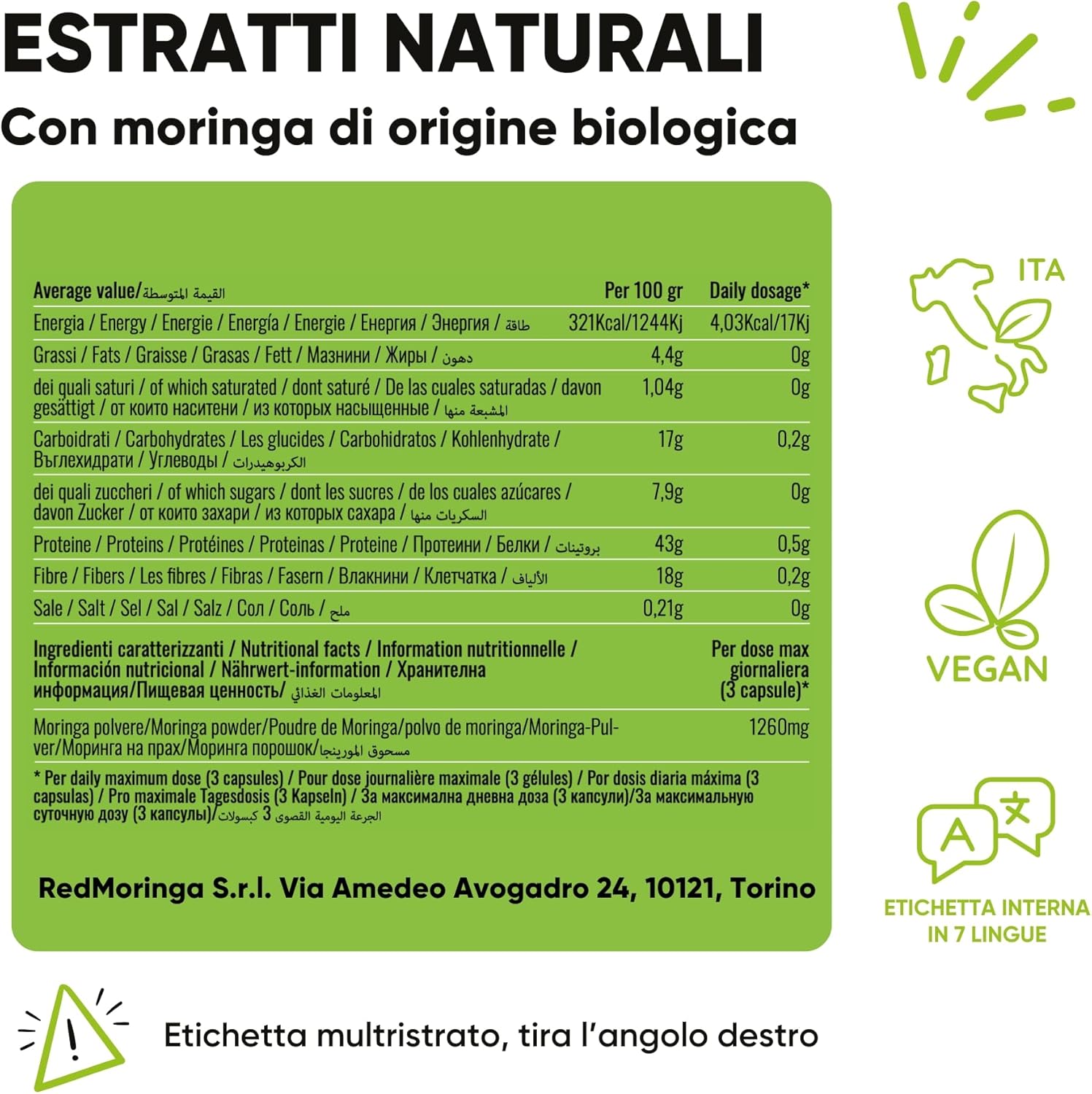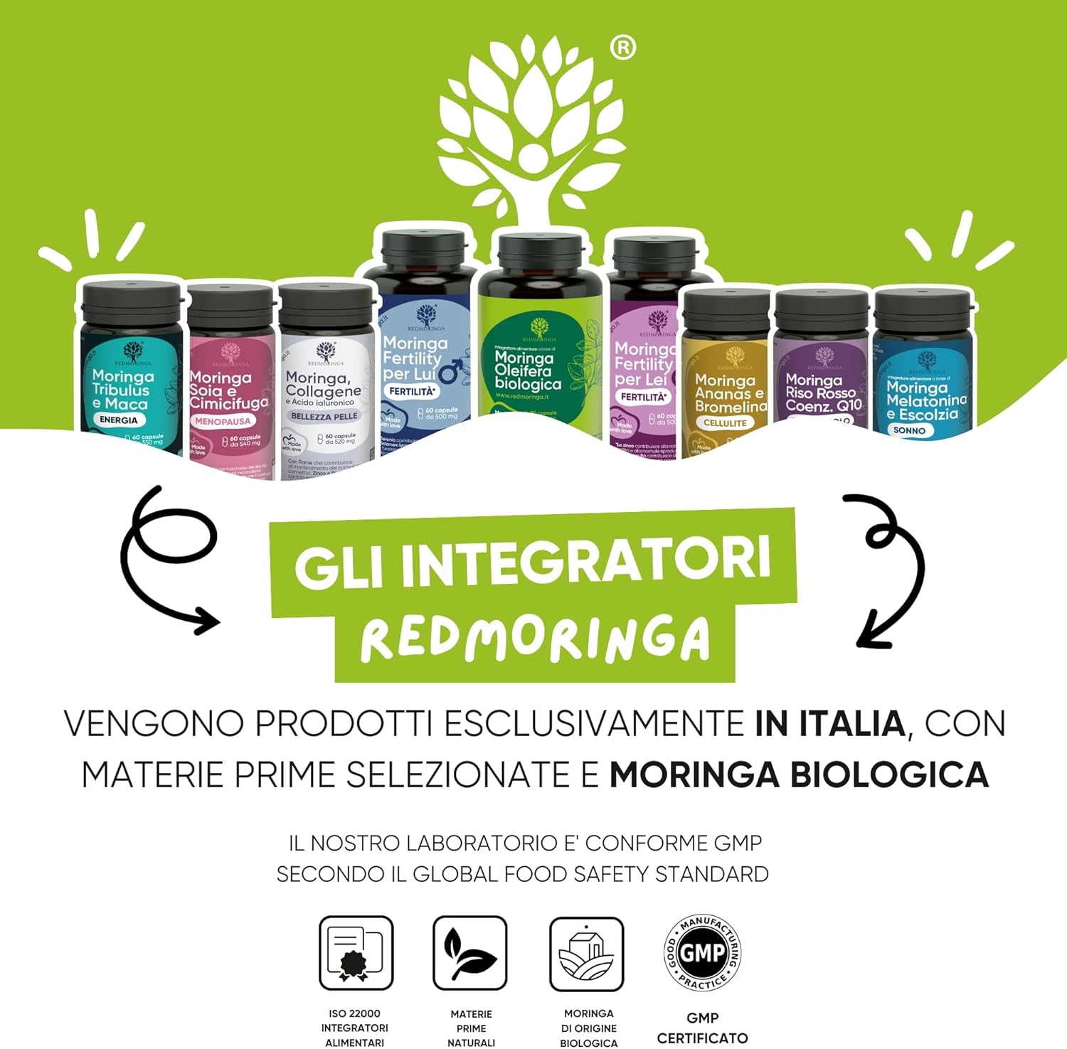 RedMoringa ha creato un integratore con 100% polvere di foglie di Moringa biologica, coltivata e lavorata in Italia.