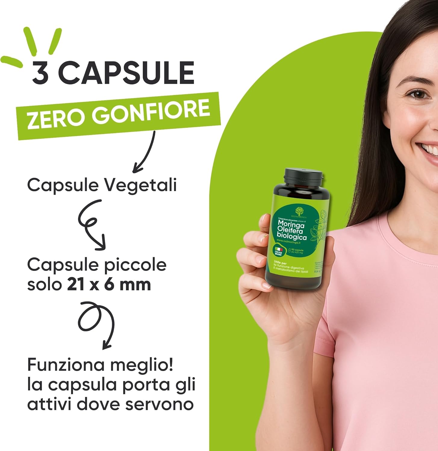 Semplice da deglutire – capsule di piccole dimensioni Modo d’uso: assumere 3 capsule al giorno Prodotto in Italia Biologico Ingredienti 100% naturali