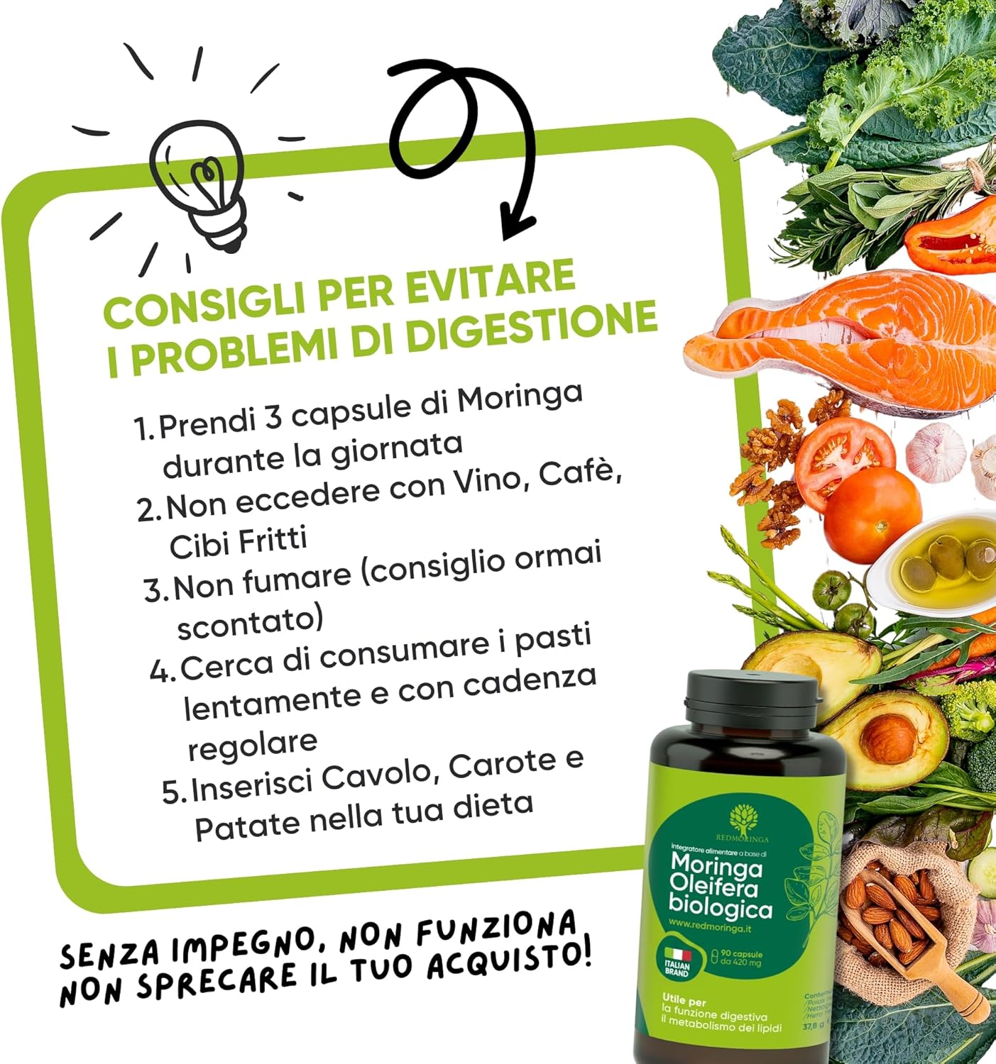How to use: we recommend taking 3 capsules of Moringa daily. One before each meal. In the delivery you will find 180 capsules, sufficient for 2 months of natural well-being.