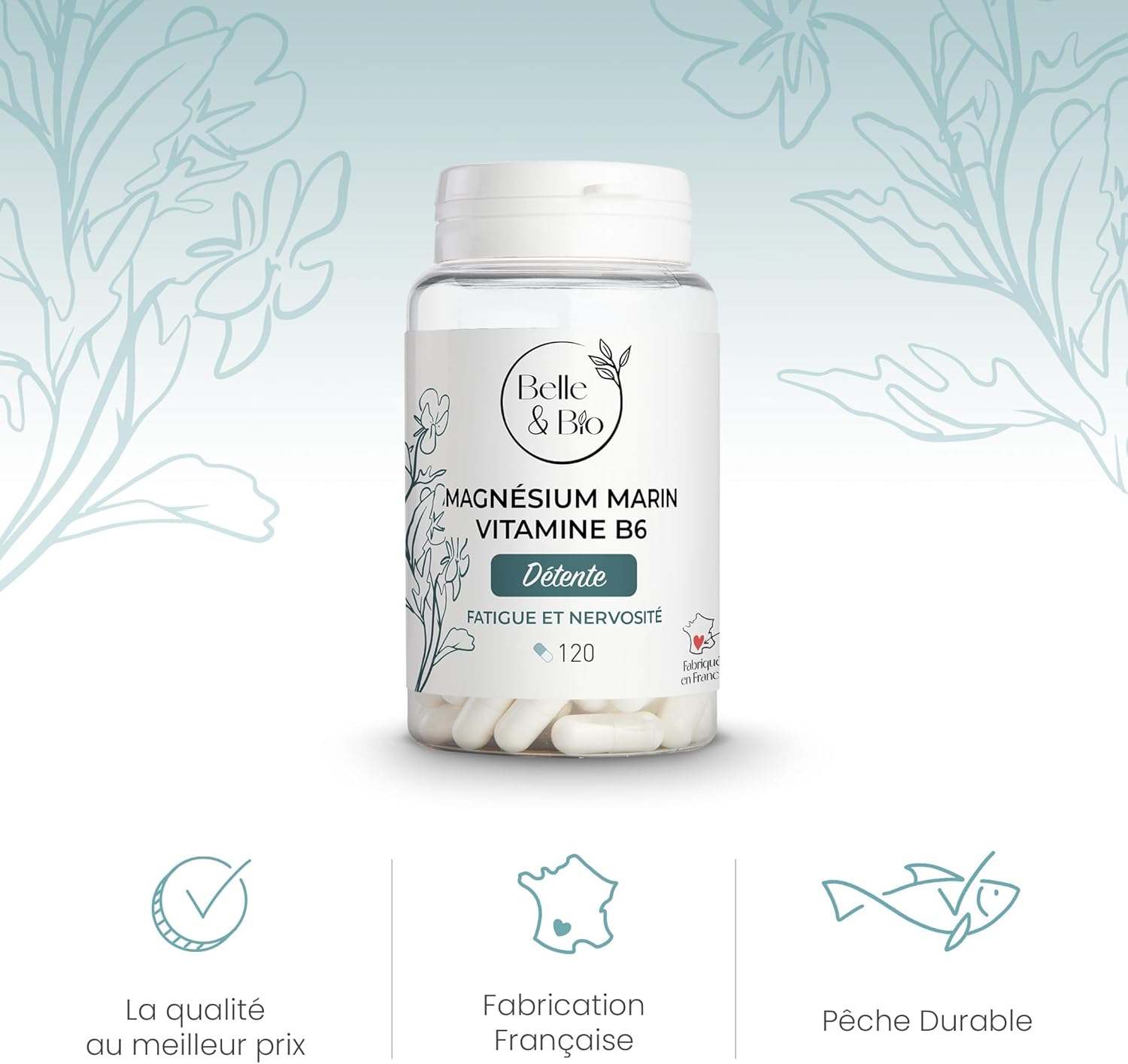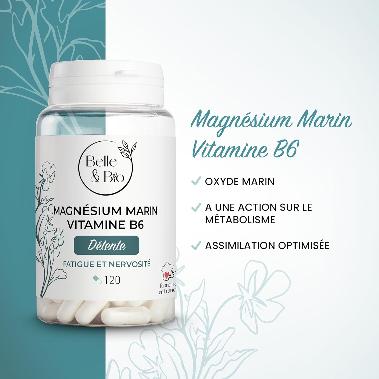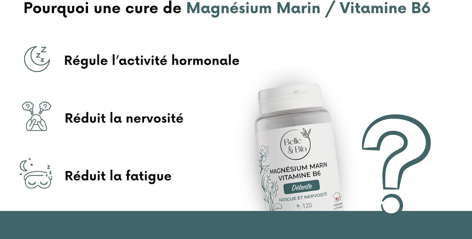 REDUCTION FATIGUE & RELAXATION – Marine Magnesium & Vitamin B6-120 capsules – 1 month cure – Belle & Bio Food Supplement – Made in France