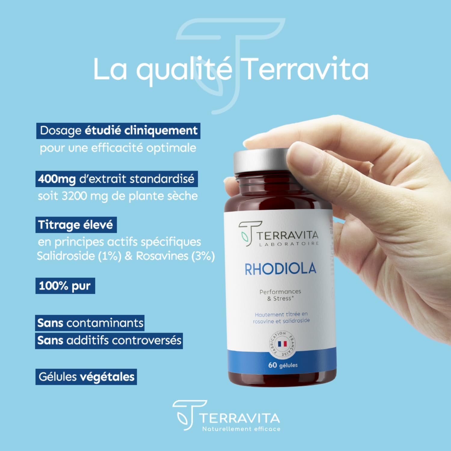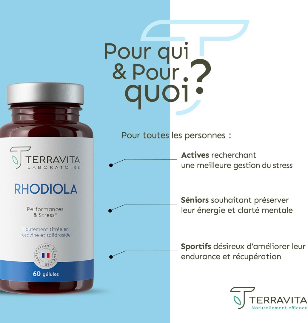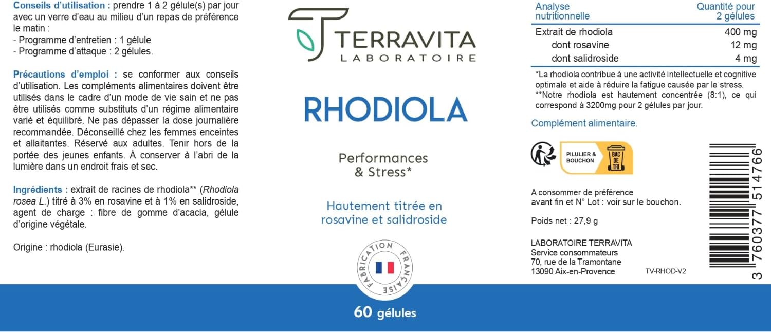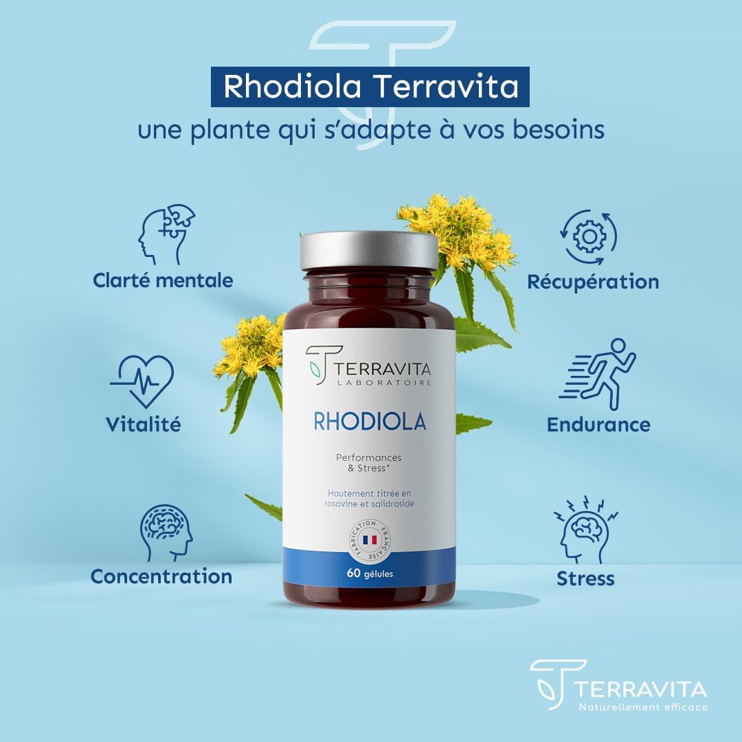 RHODIOLA ROSEA | 1600 mg (Extract 8:1) | 2 Month Cure | Titled in Rosavines 3% & Salidroside 1% | Adaptogen – Anti-Stress & Fatigue – Stable Mood | 60 Vegan Capsules | Made in France | Terravita