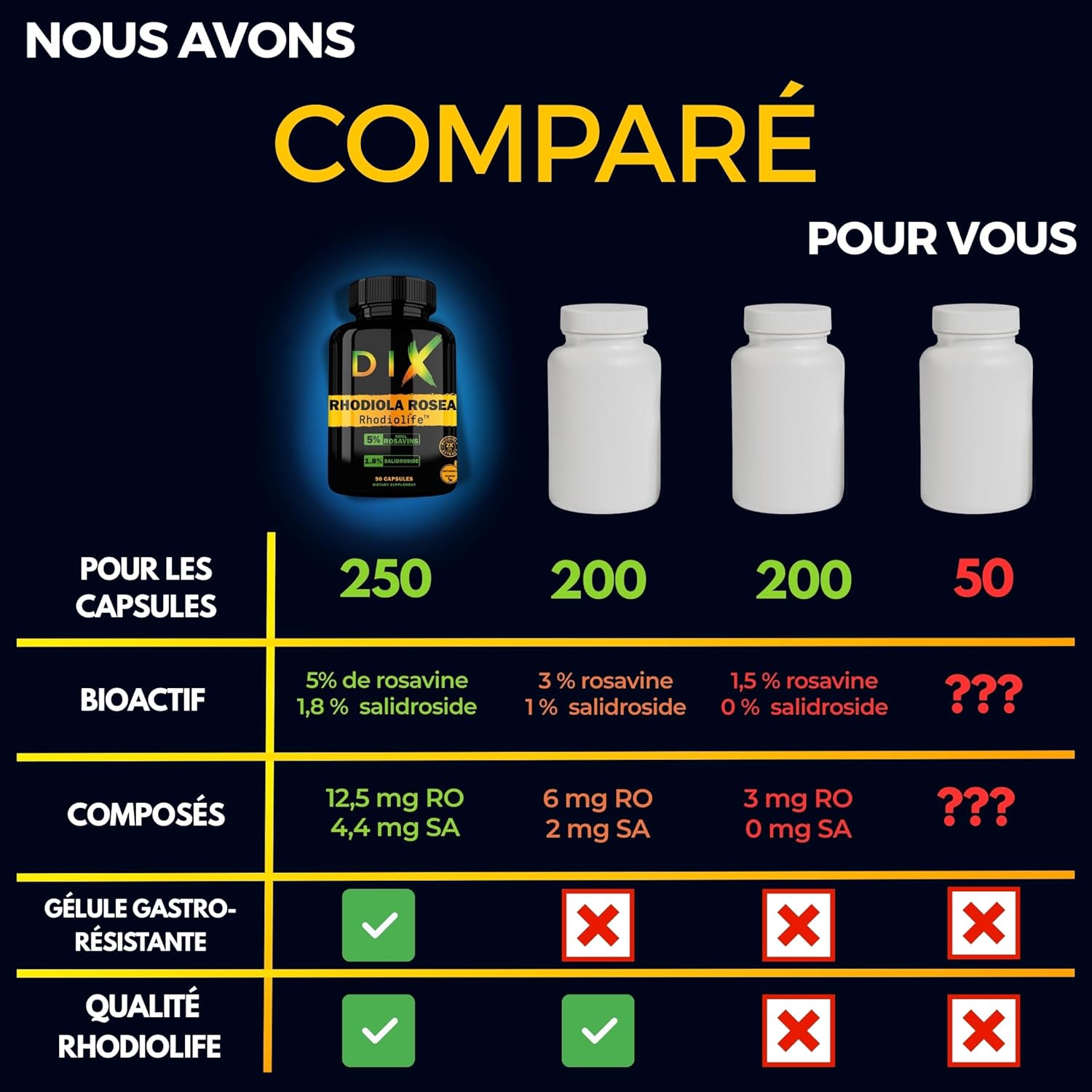 🥇The top of the top🥇 In addition to having high-quality raw materials, we also have the highest purity on the market with 5% rosavins and 1.8% salidroside. An optimal dosage of 250mg per capsule. No heavy metals, there are other additives that could harm your health. Gluten and lactose free, vegetable capsules, this product corresponds to Vegan.