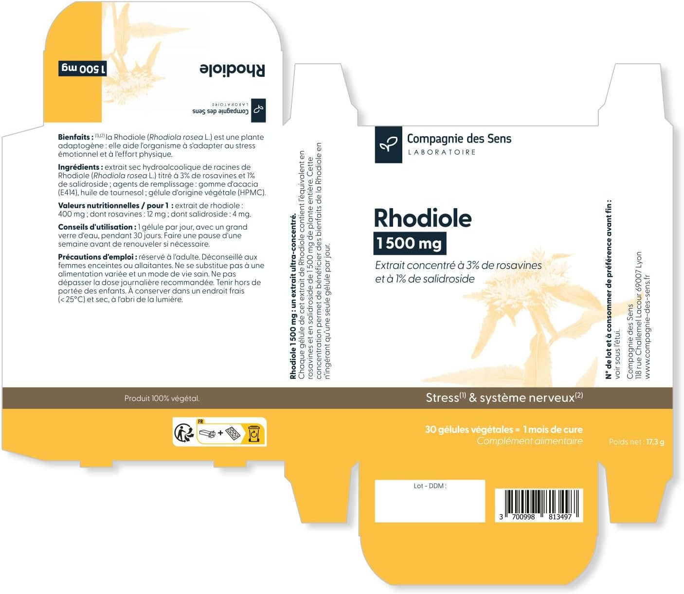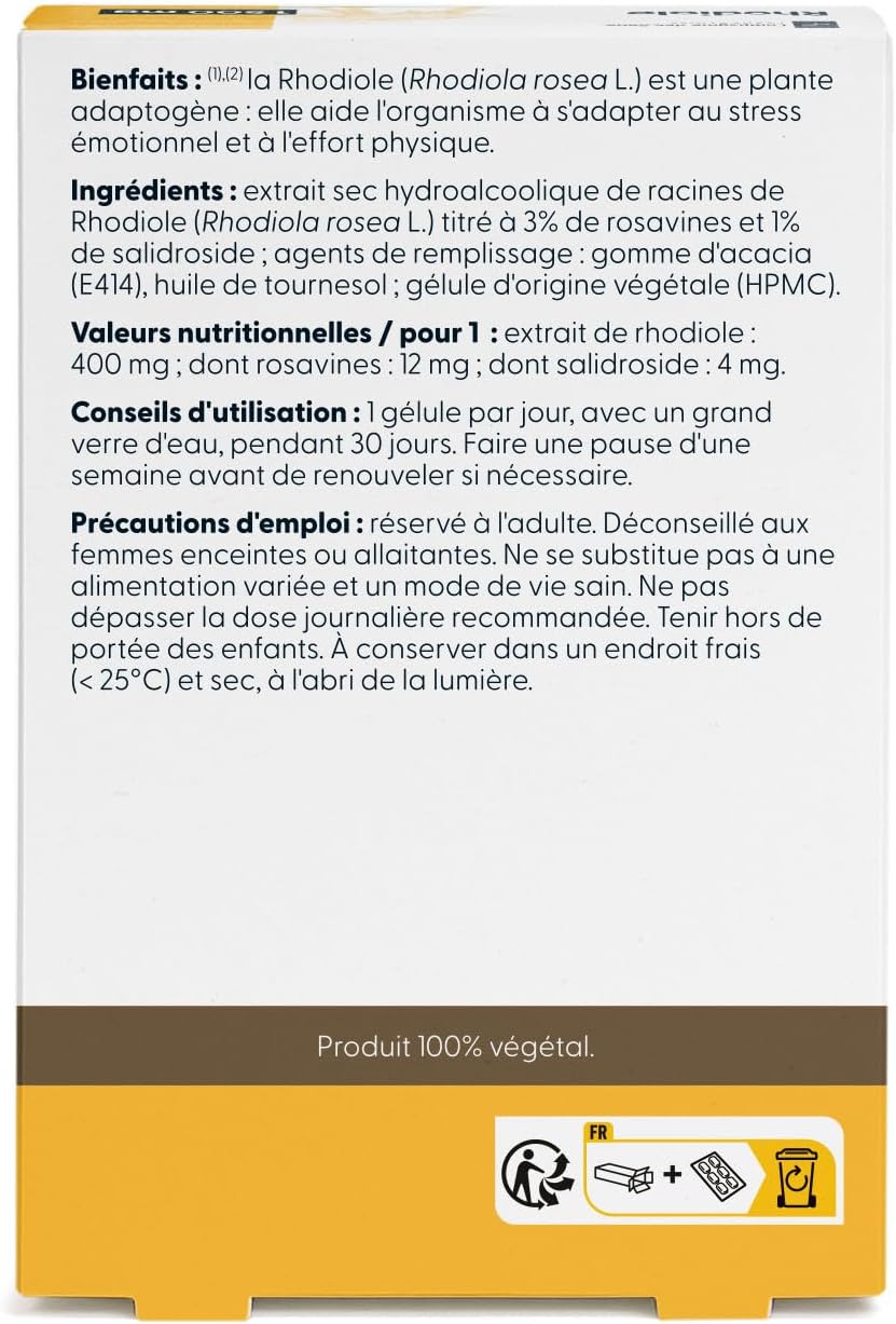Our ultra-concentrated extract offers you all the benefits of Rhodiola (Rhodiola rosea L.) with only one capsule per day. Standardized to 3% Rosavins and 1% Salidroside, each capsule equals 1,500 mg of standard Rhodiole powder. This ratio is the most clinically studied for its adaptogenic and cognitive effects, with an efficacy demonstrated as early as 200 mg per day. Rhodiola is an adaptogenic plant: it helps the body adapt to emotional stress and physical exertion.