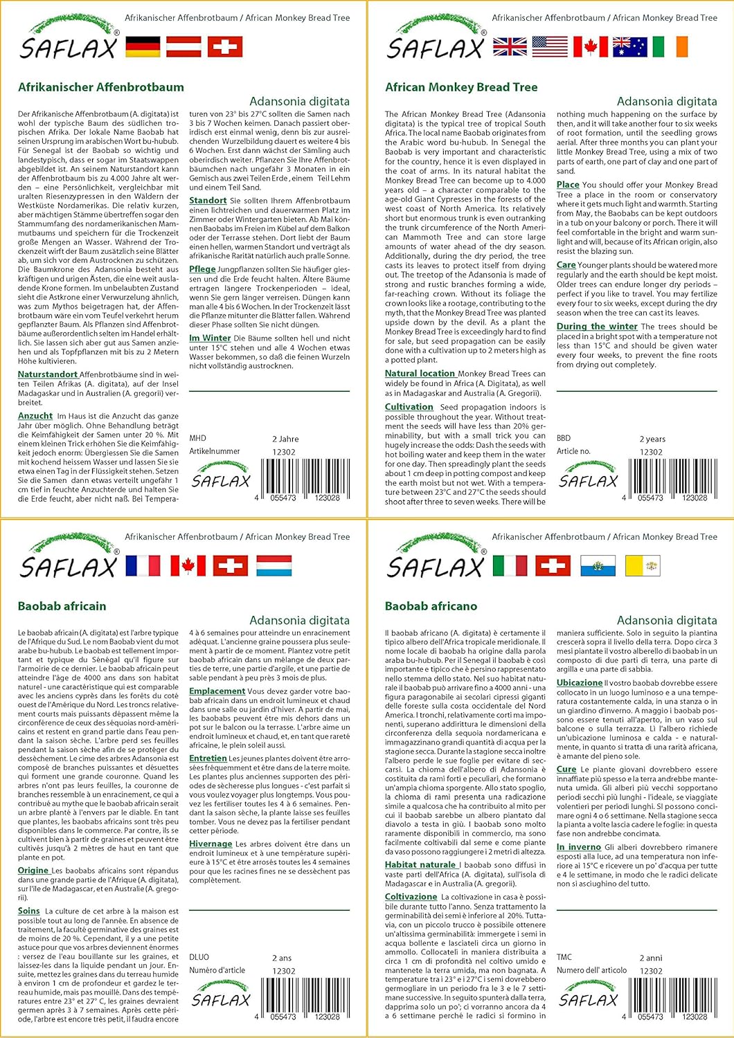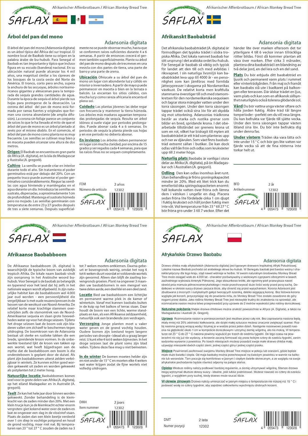 The African baobab (A. digitata) is the typical tree of South Africa. The name Baobab comes from the Arabic word bu-hubub. The baobab is so important and typical of Senegal that it appears on the latter’s coat of arms. The African baobab can reach the age of 4000 years in its natural habitat – a characteristic that is comparable with the ….. (In the photos you can find a photo of the back of our seed map with the full sowing and care instructions)