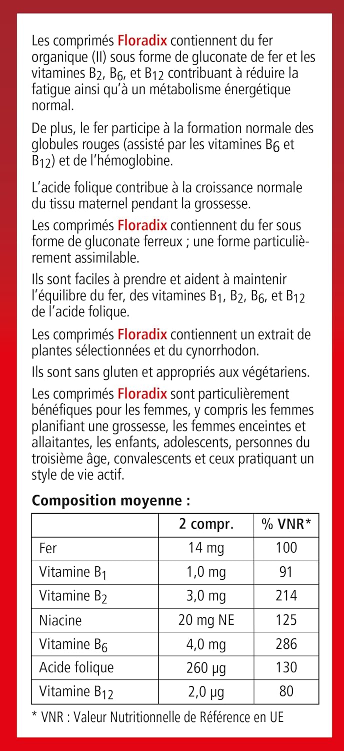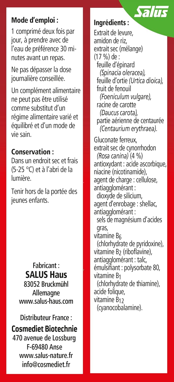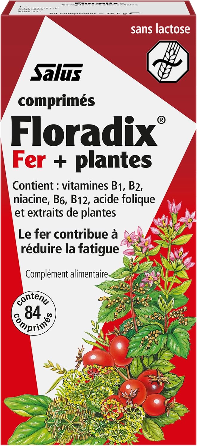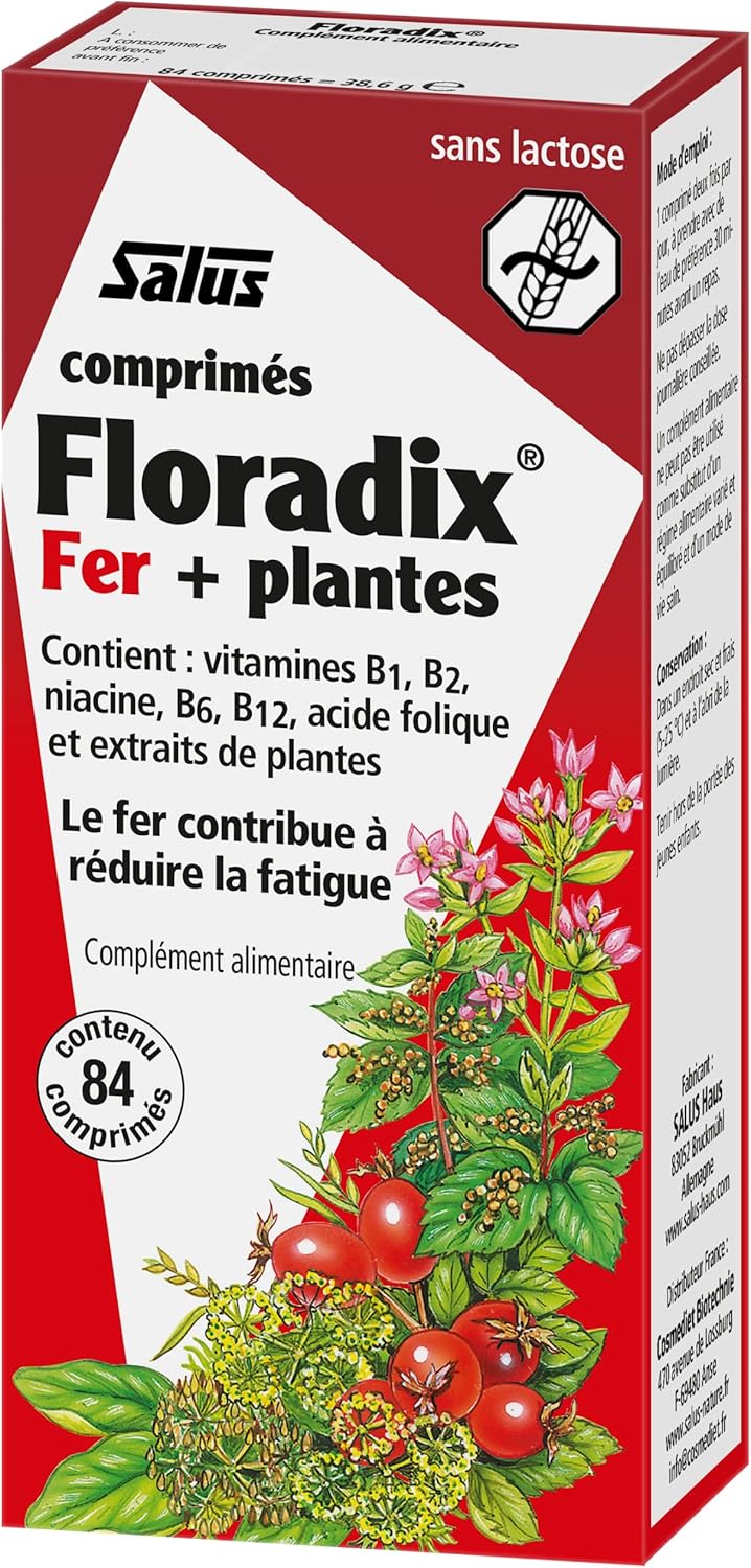 Salus Floradix Fer + Plantes – 84 tablets Iron deficiency is the most common deficiency in France and results in stubborn fatigue, pale complexion or brittle hair. Floradix Fer + Plantes is an anti-fatigue cocktail composed of iron extract, plants, vitamins B1, B2, B3, B6, B9, B12 and yeast extract grown on iron. The use of Iron Gluconate for better bioavailability, combined with fruit and plant extracts, makes it a highly assimilable formula that allows you to regain tone and vitality. Recommended use 2 tablets per day or more on the recommendation of a therapist. 1/2 hour before a meal or in the middle of the meal. Coffee, tea, tetracyclines, antacids, dairy products, or vitamin E can inhibit iron absorption. It is therefore recommended to wait 2 hours before ingesting Floradix Iron + Plants after taking one of these substances. Read the list of ingredients carefully. Product benefits: preservative-free, lactose-free, artificial Salus colouring. Well-being by plants since 1916. For over 90 years, products from the Salus brand – whose name means in Latin (happiness, well-being, prosperity) – have been dedicated to well-being and health by the natural way. The ranges of syrups, tablets, fresh plant juices, infusions and herbal teas are made from plants from organic farming. Salus is also part of a very small group of manufacturers that brings together all the stages of production – from raw material to bagging, ensuring the quality of its food supplements.
