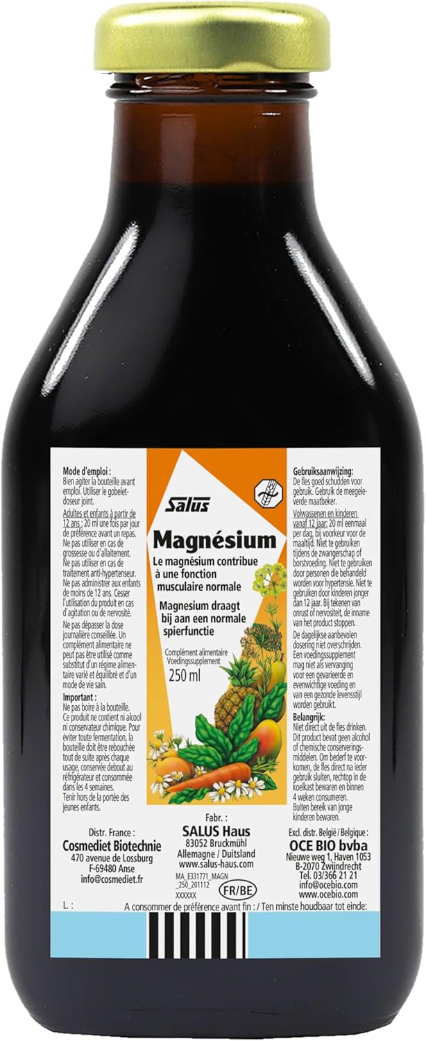 Salus Magnesium – Liquid Formula – 250 ml Magnesium is an essential mineral for the proper functioning of the body. Modern life often rhymes with excessive or even chronic stress. The latter can cause deficiencies, which result in nervousness and irritability, as well as muscle weakness. Magnesium contributes to many functions of the body, ranging from proper psychological functioning, to the functioning of the nervous system, to the health of the bones and dentition. Salus Magnesium presents a liquid formula that is easy to assimilate by the body. It contains no gluten or lactose and is suitable for vegetarians. Instructions for use Adults and children from 12 years: 20 ml once a day preferably before a meal. Read the list of ingredients carefully. Product Benefits + Alcohol Free + Preservatives Free + Lactose Free + Gluten Free Salus Well-being by plants since 1916 For over 90 years, Salus brand products whose name in Latin means happiness, well-being and prosperity have been dedicated to well-being and health by the natural way. The ranges of syrups, tablets, fresh plant juices, infusions and herbal teas are made from plants from organic farming. Salus is also part of a very small group of manufacturers that groups together all the stages of production from raw material to bagging, which allows it to ensure the quality of its food supplements.