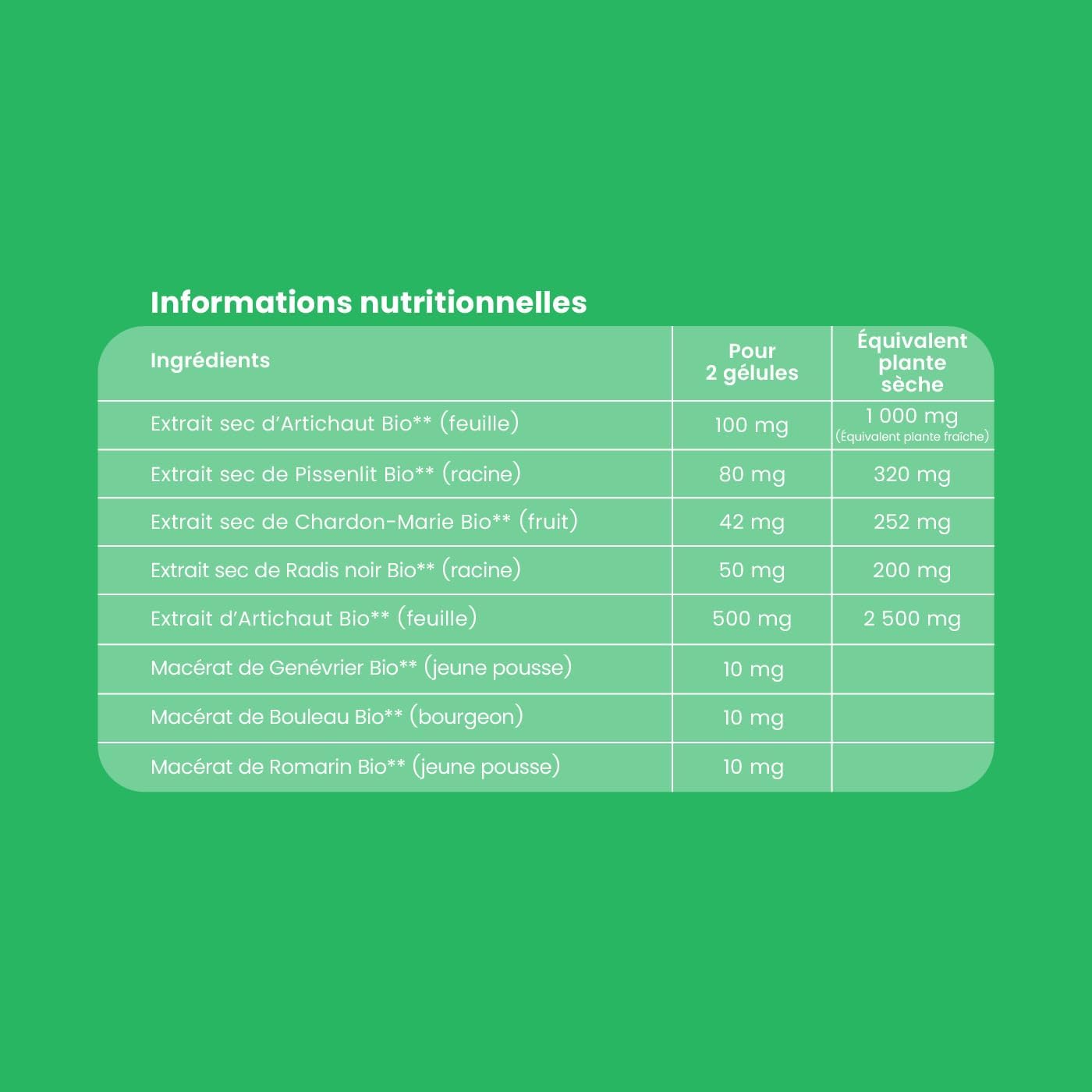 100% ORGANIC PLANT-BASED FORMULA A highly dosed formula in Organic Artichoke, which helps maintain the normal functioning of the liver and contributes to the detoxification of the body