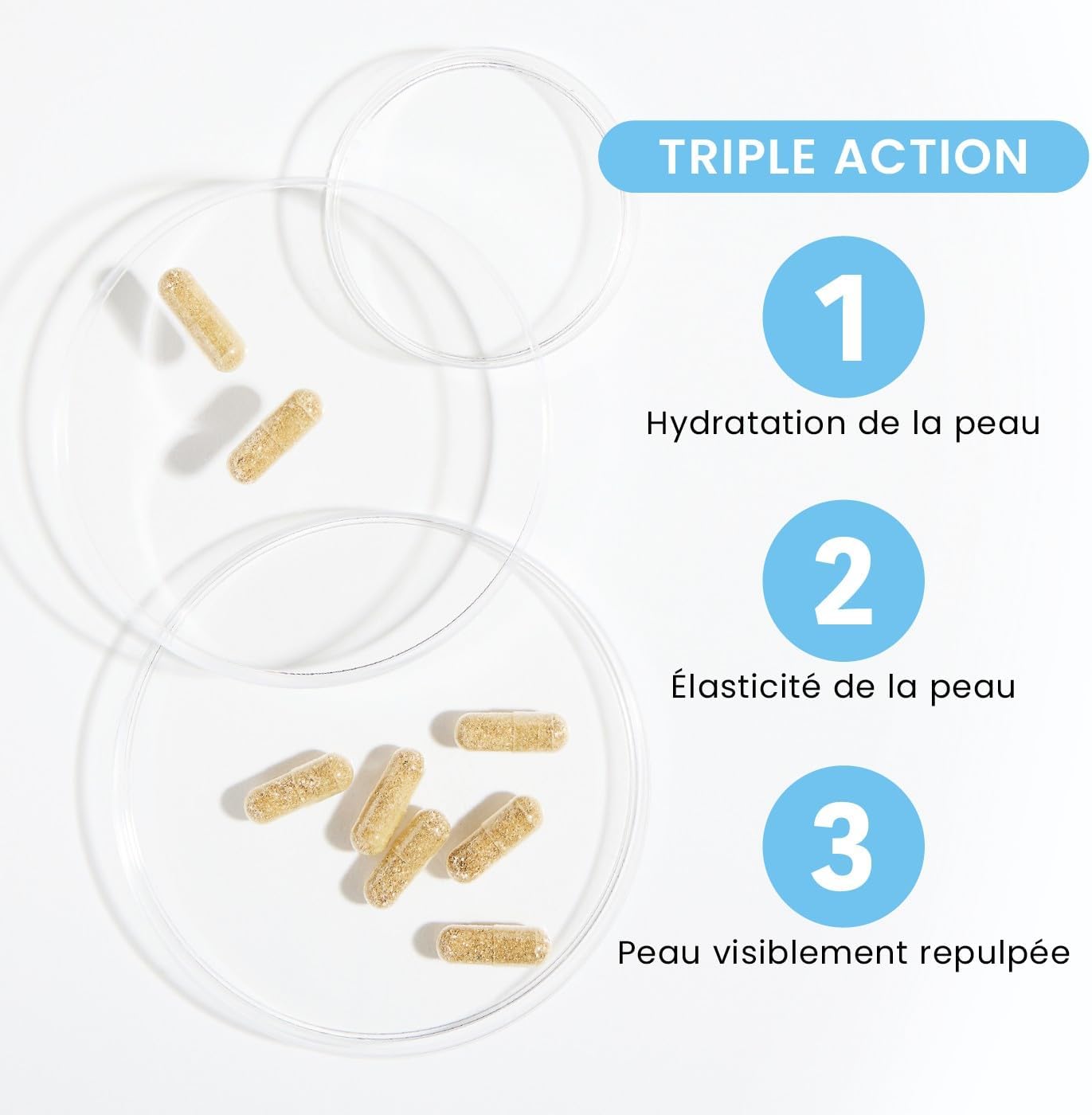 TRIPLE ACTION: Hydration of the skin, elasticity of the skin & visibly plumped skin. Our skin supplement helps to rehydrate the skin. Ideal for first wrinkles and dehydrated skin!