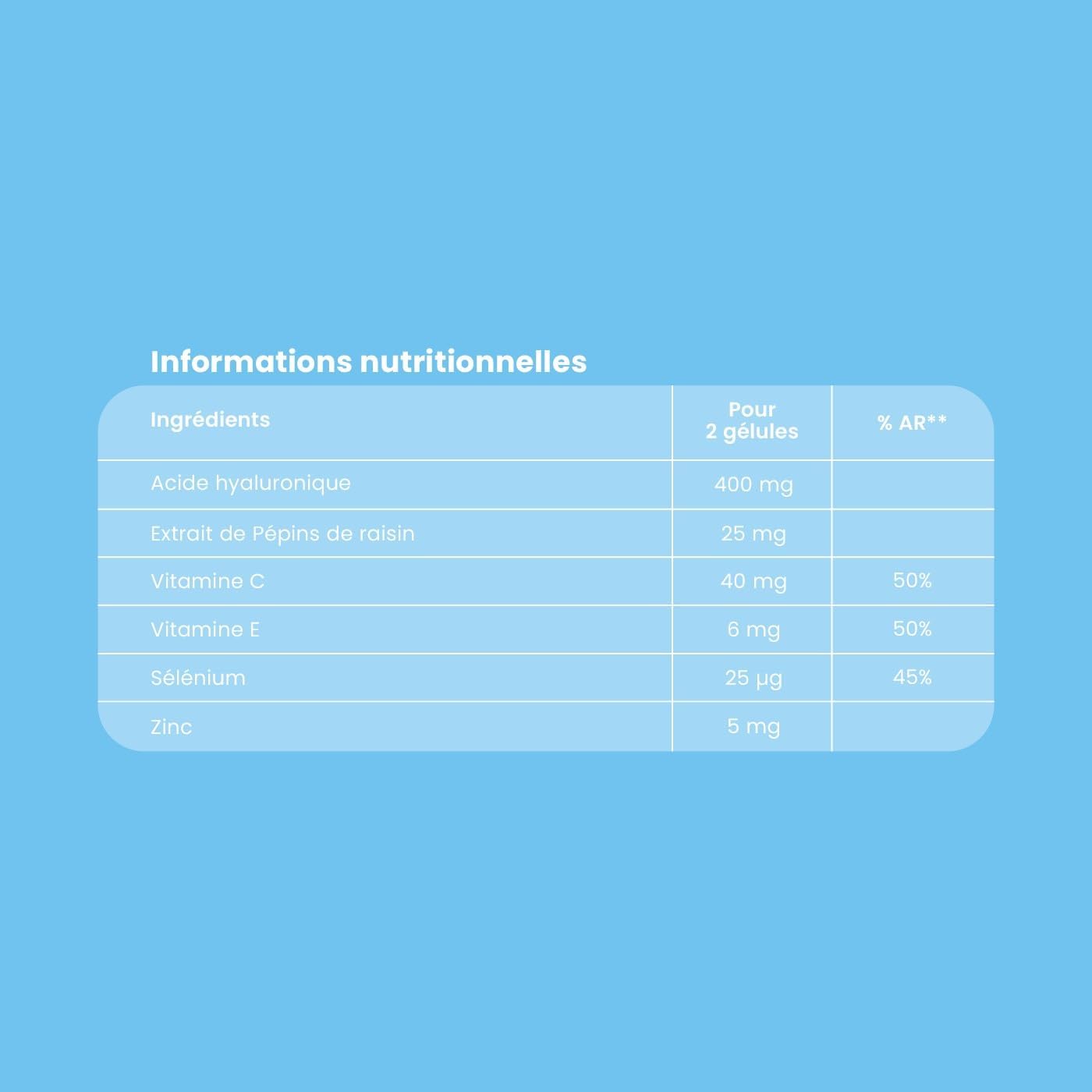 Want a beautiful moisturized, firmed and plumped skin? Discover Sublime Hyaluronic Skin 400 mg, an innovative and highly dosed formula: – Hyaluronic Acid: A molecule naturally present in our skin. Over time, its production decreases and the skin loses its flexibility. Our capsules are heavily dosed with Hyaluronic Acid (400 mg per day) to help the skin maintain its elasticity and firmness. – Vitamins and Minerals: Zinc helps maintain normal skin. Vitamin C contributes to the normal formation of collagen to ensure normal skin function. Vitamin E and Selenium help protect cells from oxidative stress. Plant: Grape seed This product is made in France!