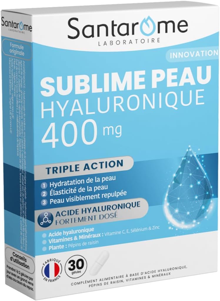Santarome – Sublime Hyaluronic Skin 400 mg – Skin Supplement – Hydration and Firming – Grape Seed – 30 Capsules – Made In France