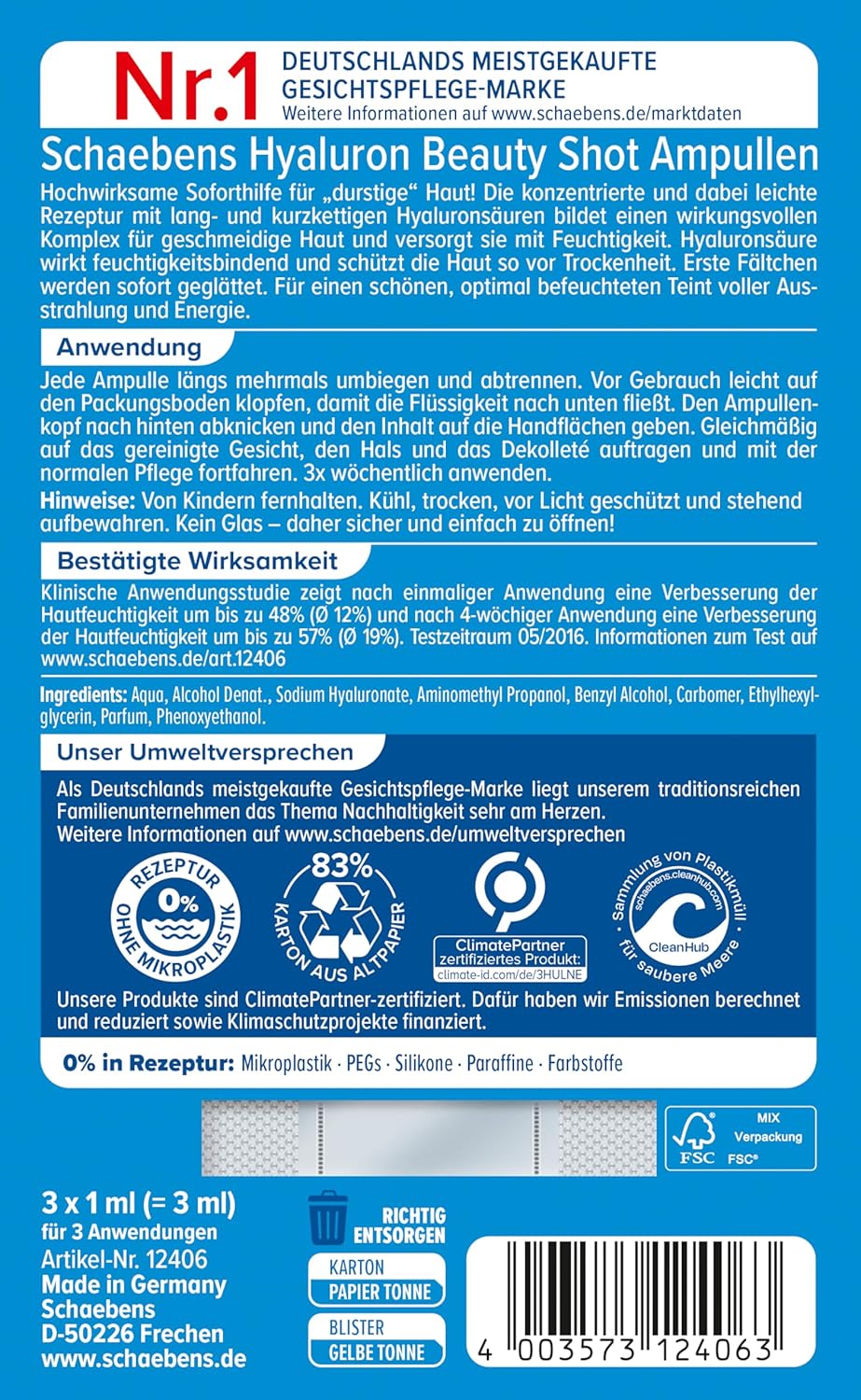 Shaebens Hyaluron Beauty Shot is free of microplastics, PEGs, silicones, paraffins and dyes.