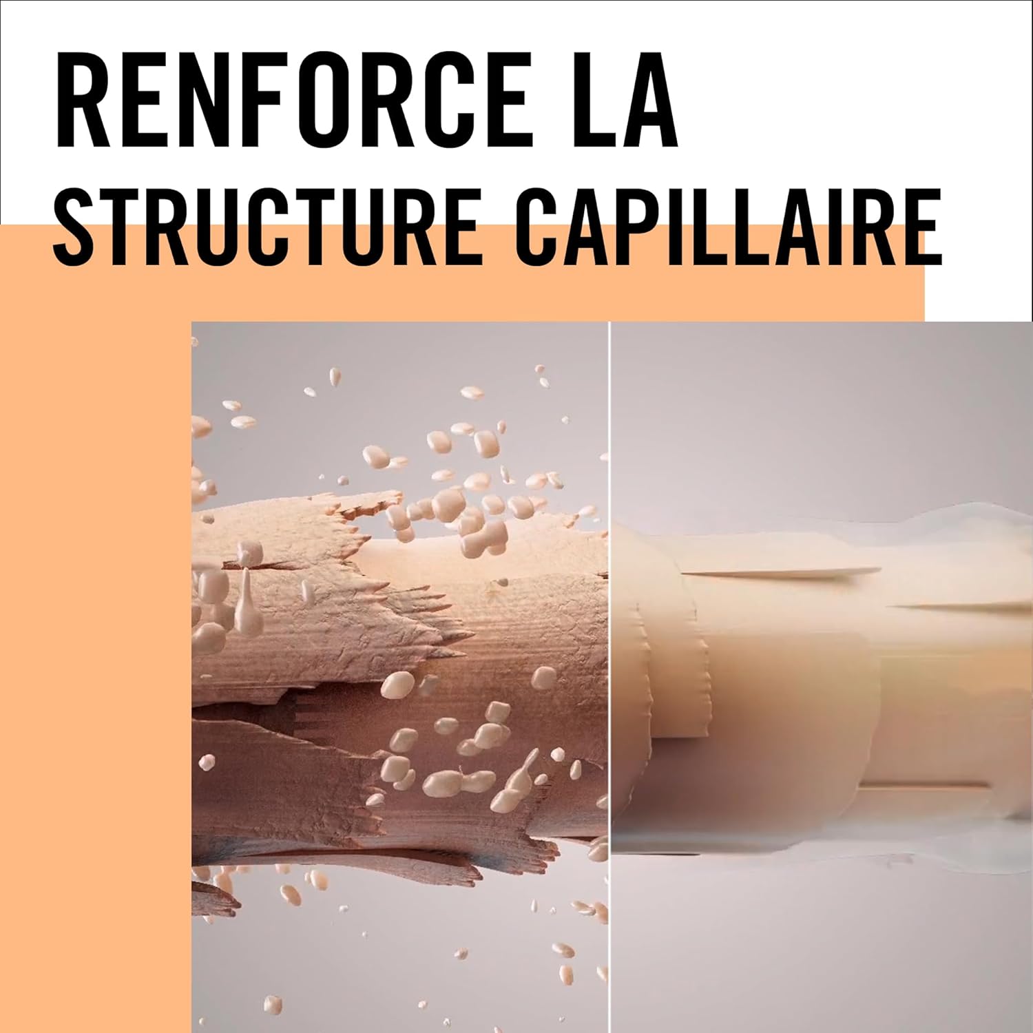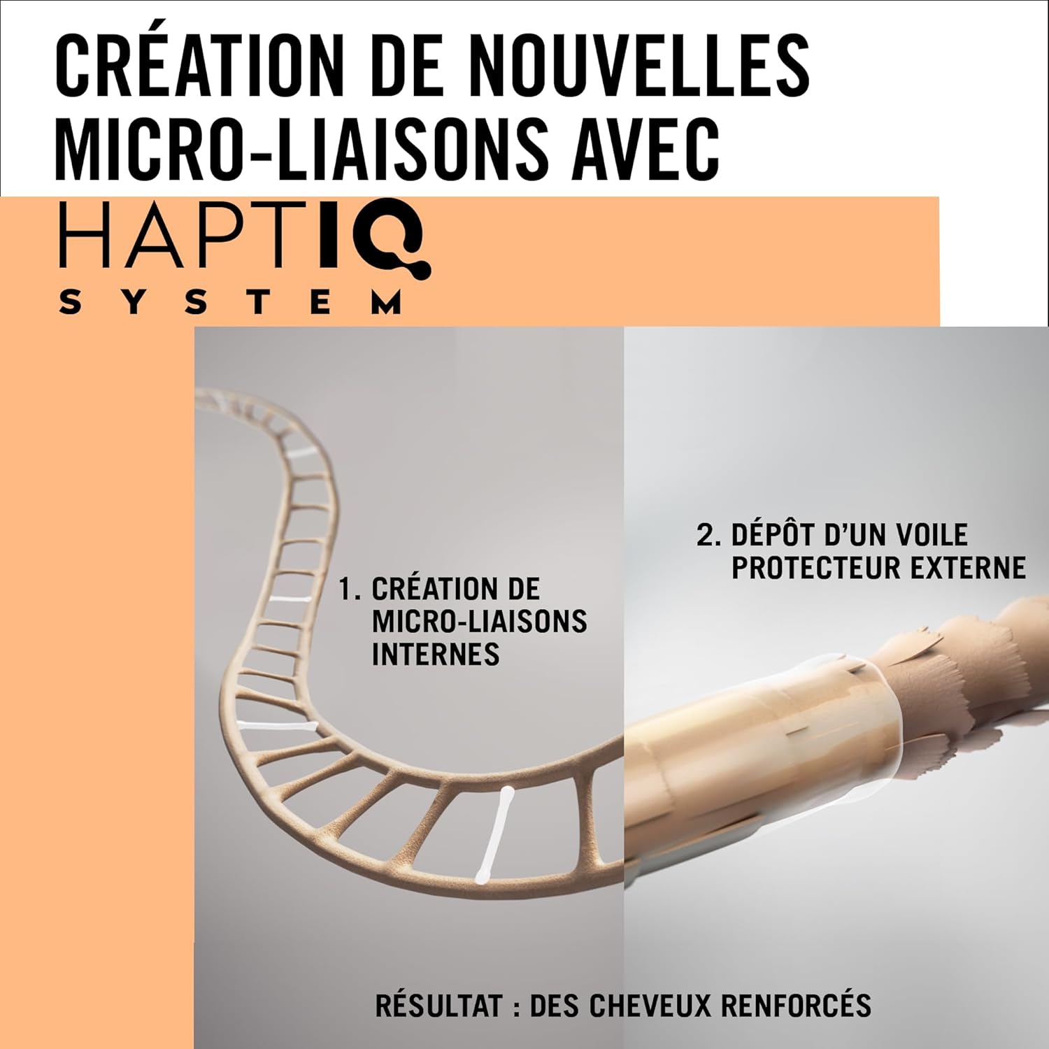 4-in-1 repair mask, strengthens the hair structure, damaged and dry hair, 100% stronger hair, creates hair micro-liasons, Haptiq system + liquid keratin, intense care, nourishes and repairs, is formulated with the Haptiq system, it creates new micro-bonds in the hair and strengthens its structure. Our expertise for sublimated hair. Hair 10 times stronger and shiny, deep reconstruction of the hair fibre, care with a sweet sensual fragrance. PETA approved, jar with 50% recycled plastic, 97% natural ingredients including water.