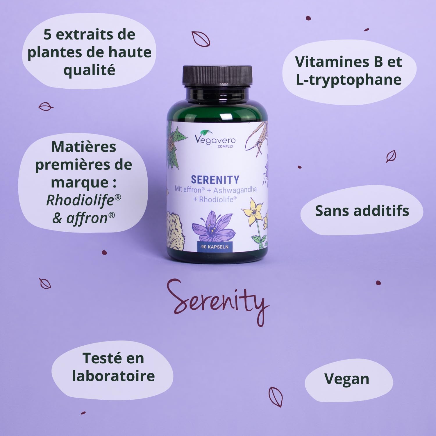 Serenity Complex | Mood + Anti Stress | St. John’s wort, Rhodiola, Saffron, Tryptophan, Vitamin B | 90 Capsules | NO ADDITIVES and VEGAN | Vegavero®