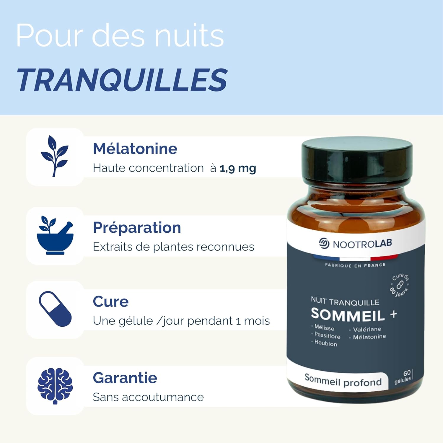 Be the first to review “Sleep + Quiet Night | 60 Nights of Deep Sleep | Melatonin 1.9 mg & Plants (Valerian, Passionflower, Lemon Balm, Hops) | Fast Sleep | Made in France | Natural”