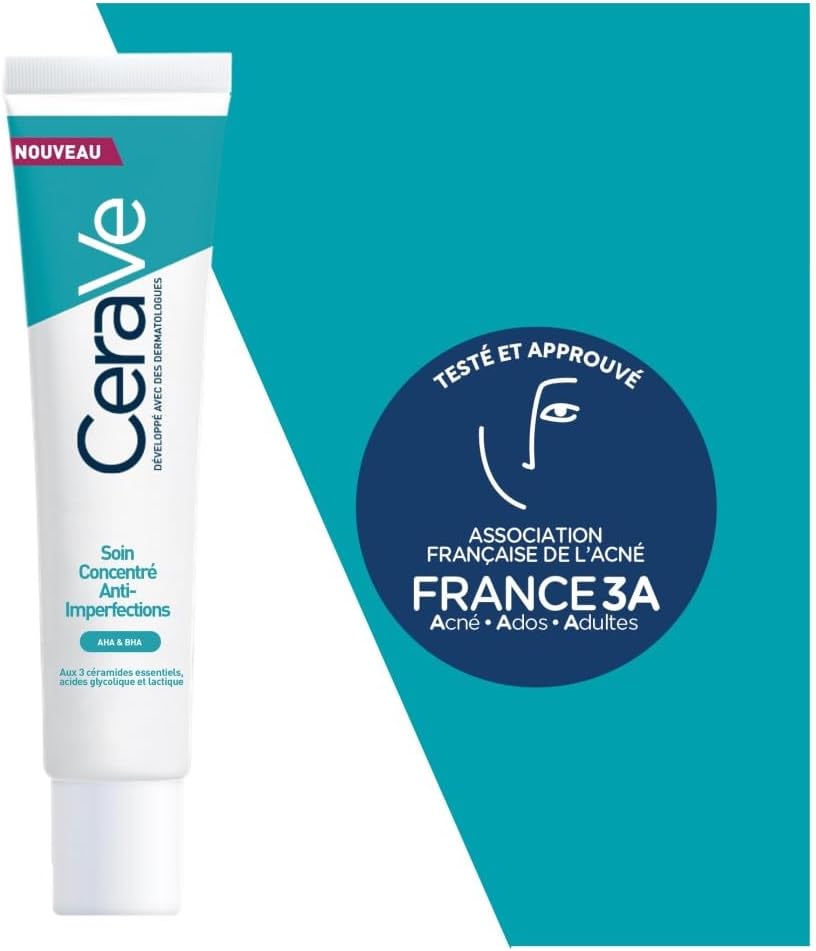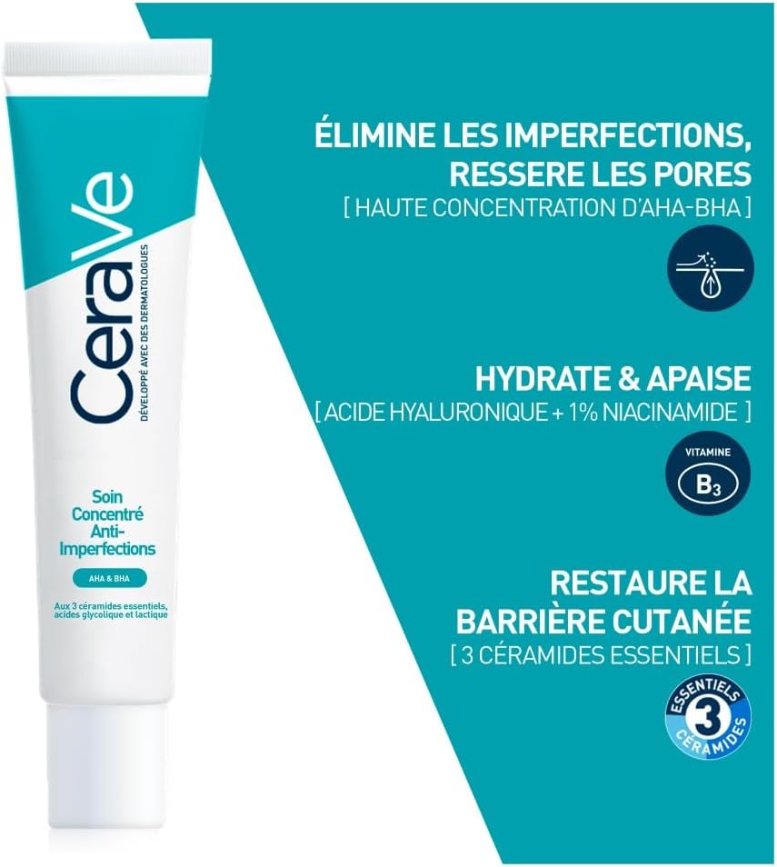 Développé avec des dermatologues, le Soin Concentré Anti-Imperfections CeraVe réduit les boutons et les imperfections des peaux à tendance acnéique tout en hydratant, apaisant et restaurant la barrière cutanée. Formulée à partir d’une concentration puissante traitante d’AHA-BHA (acides alpha hydroxylés – acides bêta hydroxylés connus pour leurs propriétés exfoliantes), il agit en profondeur et en surface pour combattre les imperfections.