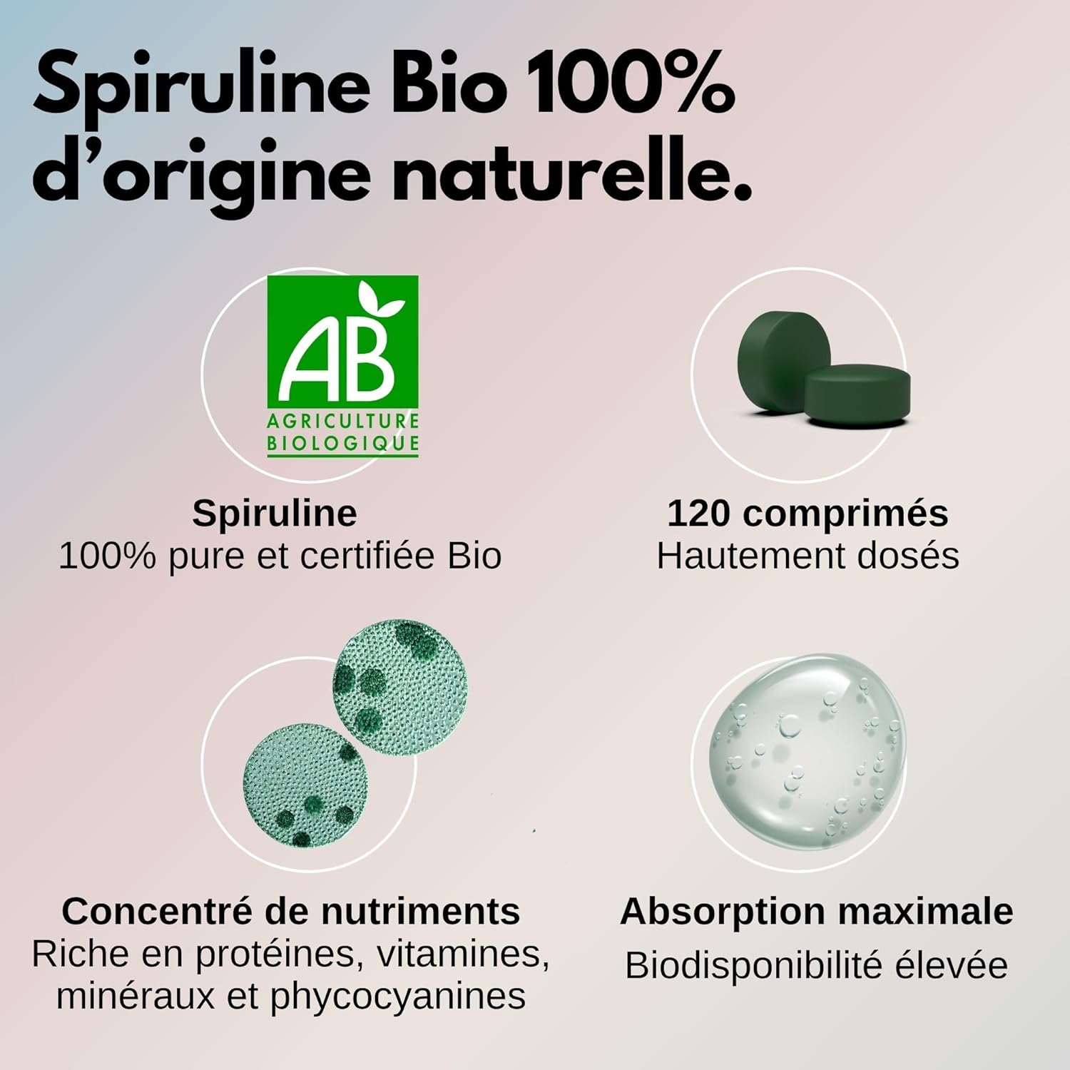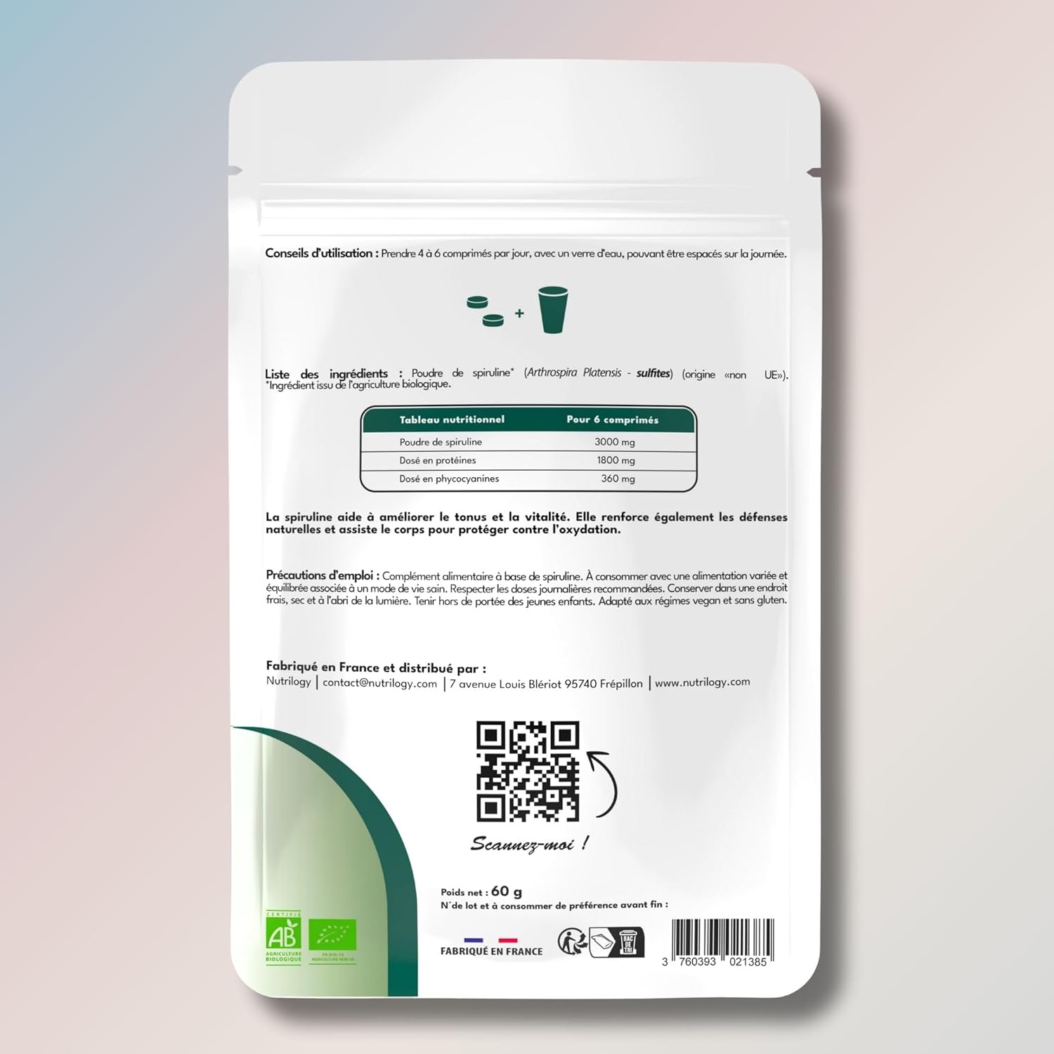 Made in France and certified organic: Our organic spirulina is produced under rigorously controlled conditions in our French and ethical laboratory. Spirulina BIO is free of additives, heavy metals or preservatives. Enriched with pure spirulina, Spirulina Bio is guaranteed vegan, lactose-free, gluten-free and non-GMO. Packaging 100% recyclable