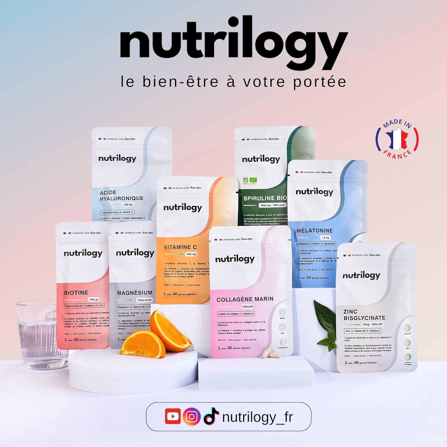 Moins d’emballages, pas d’ingrédients superflus et une production française. Chez Nutrilogy, nous croyons en un bien-être responsable, pour vous comme pour la planète.