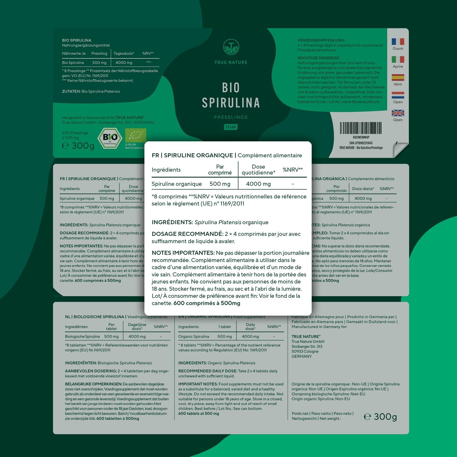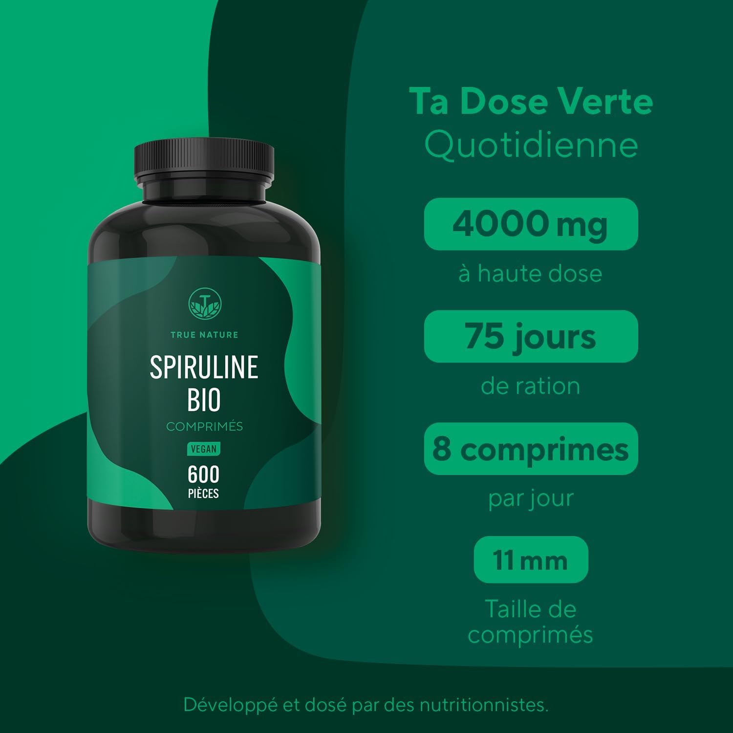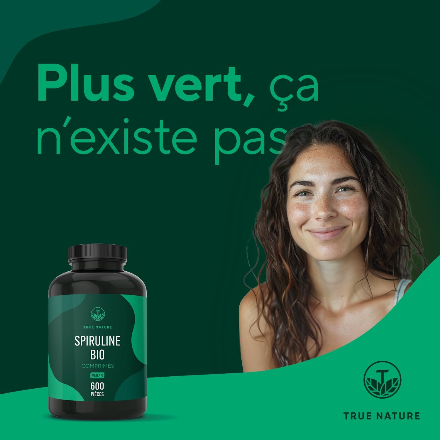 Spirulina BIO | 600 tablets of 500mg | 2.5 month cure | Antioxidants, Proteins, Vitamins & Minerals | Immunity | Vegan | Without Additives, Lactose & Gluten | TRUE NATURE
