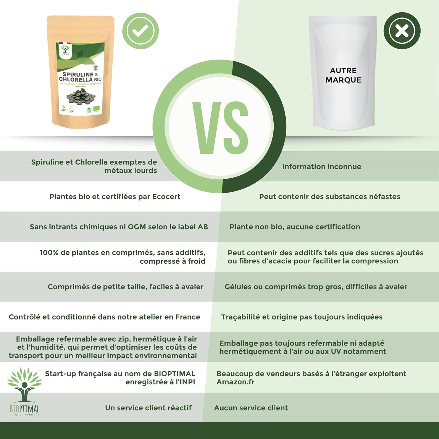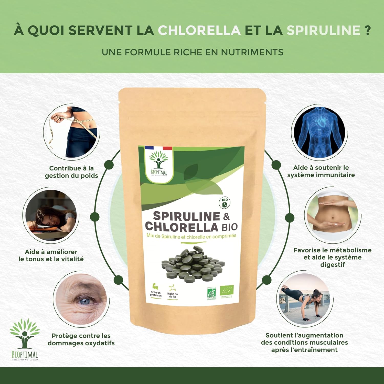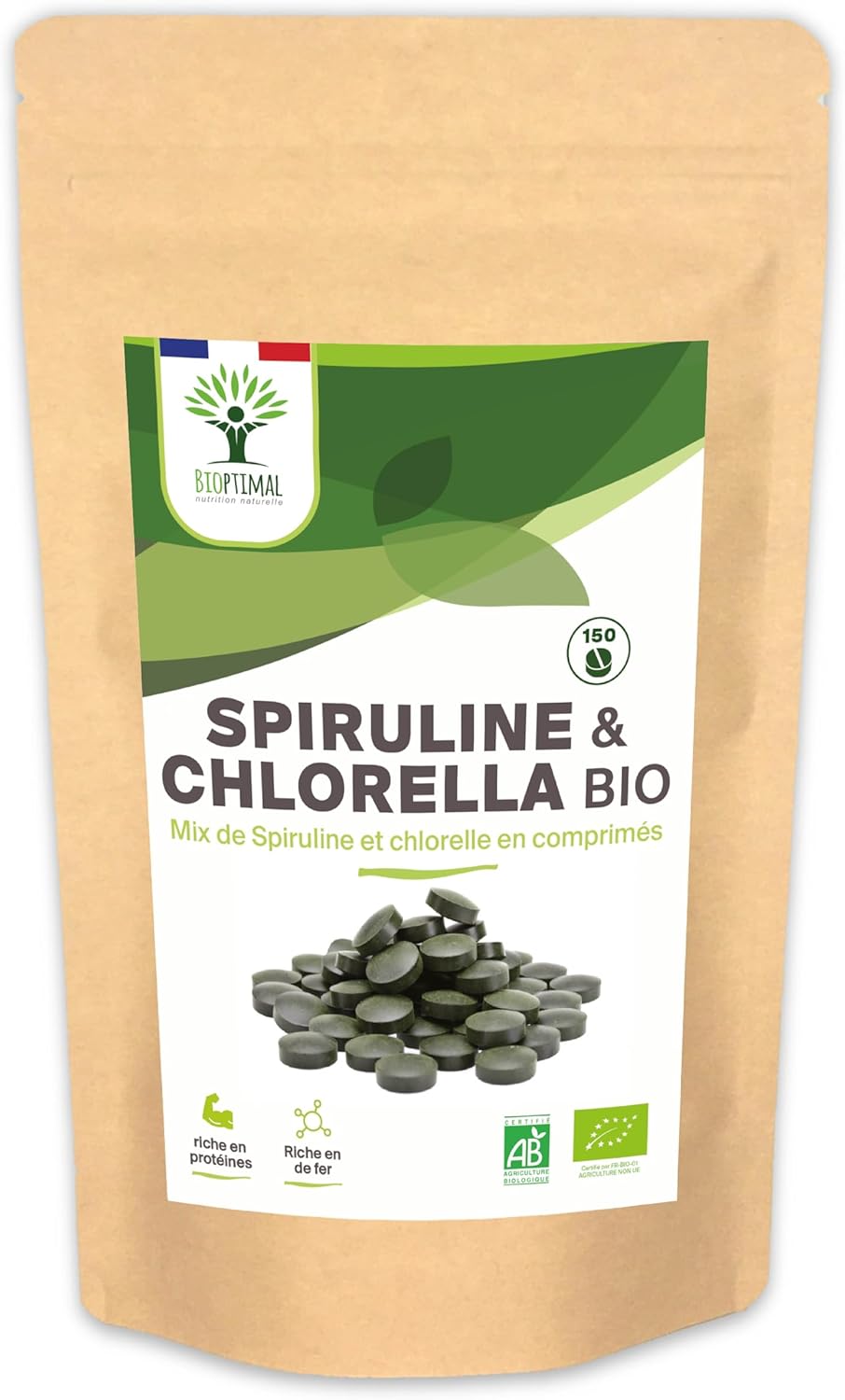 PREMIUM QUALITY + SAFETY: We have selected a chlorella and spirulina of excellent nutritional qualities, which we pack in a resealable bag. Grown in closed ponds with pure water, they are mixed and compacted cold right after harvest. Our formula is guaranteed free of excipients, heavy metals, GMOs, pesticides or gluten, it is checked in our family workshop in France and is certified organic, HACCP + and Afnor.