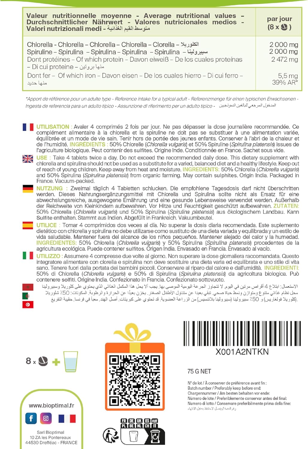Be the first to review “Spirulina + Chlorella Bio – Bioptimal – Food Supplement – Multivitamins – Protein BCAA Iron Phycocyanine Chlorophyll – 500 mg – Packaged in France – Certified by Ecocert – 150 Tablets” Cancel reply