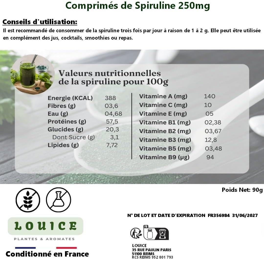 Discover Spirulina LOUICE, a natural micro-algae recognized for its exceptional richness in essential nutrients . Grown in a preserved environment, it is carefully dried and then cold compressed to retain all its natural qualities. A natural source of energy and balance Rich in plant protein, iron, and B vitamins, spirulina supports a healthy and complete diet. Ideal for active days, it fits easily into your habits – juices, smoothies, or balanced meals. Each tablet contains the power of spirulina without strong taste or transformation. A convenient and portable format, perfect for those looking for a natural source of nutrients in their routine. LOUICE – The art of natural products. Carefully packaged in France, LOUICE spirulina combines quality, authenticity and respect for nature. An essential for those who prefer a simple, plant-based and balanced diet.