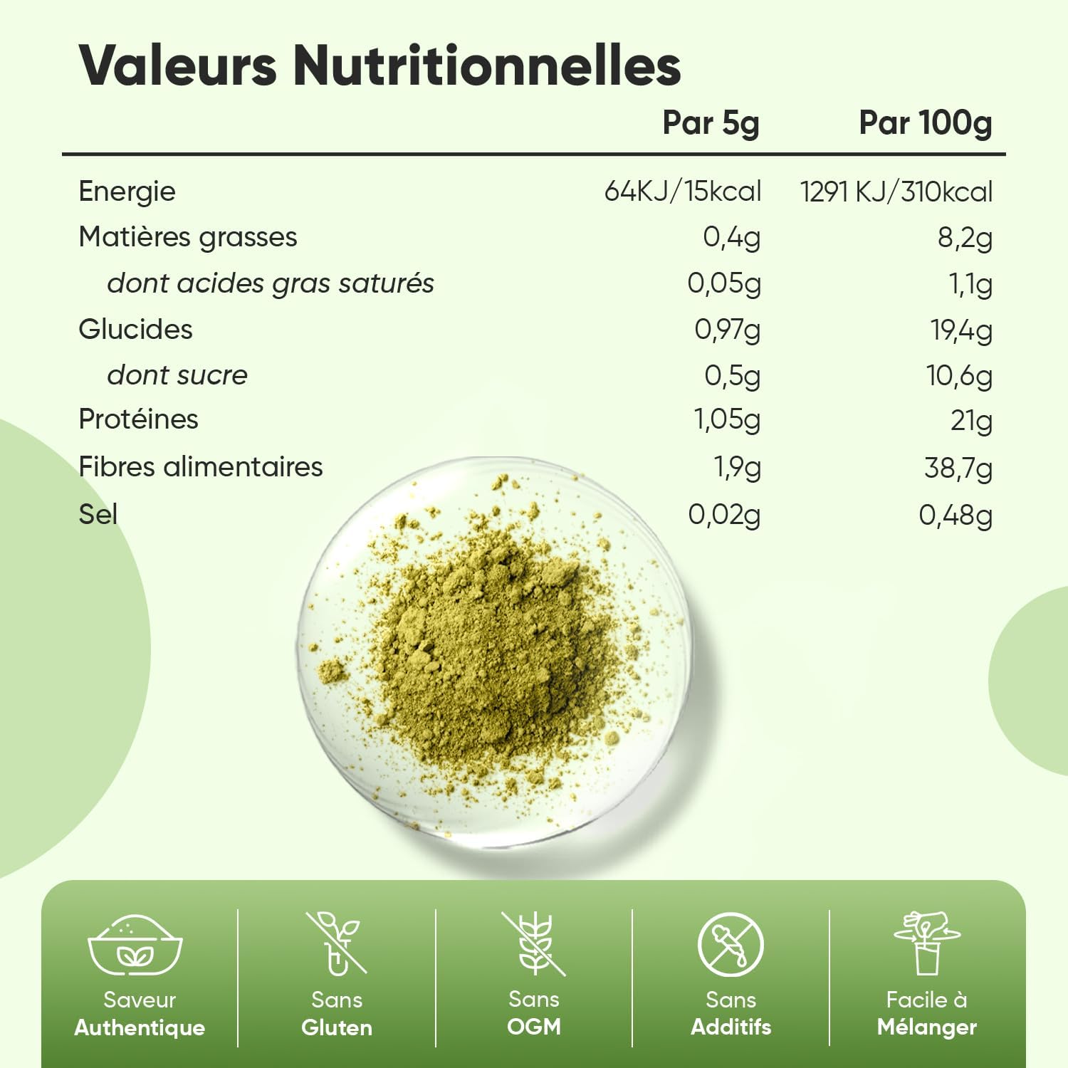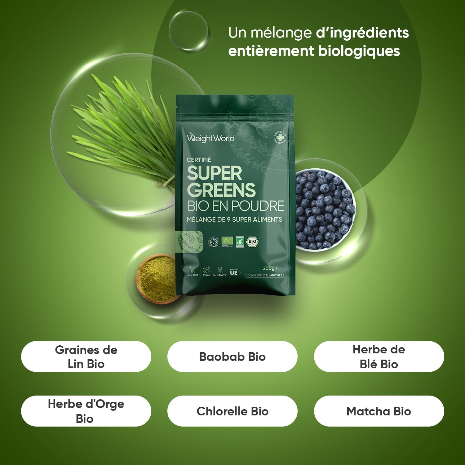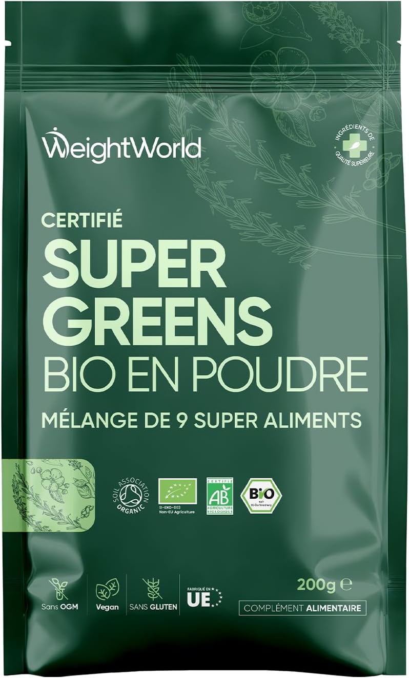 Organic and Vegan – Organic Super Greens powder is part of the routine, especially for vegans. Presented in a 200g format, gluten and GMO-free, it is enough for about 40 servings and contains no additives. It provides a natural source of vitamins and minerals, in a convenient resealable bag to take away.