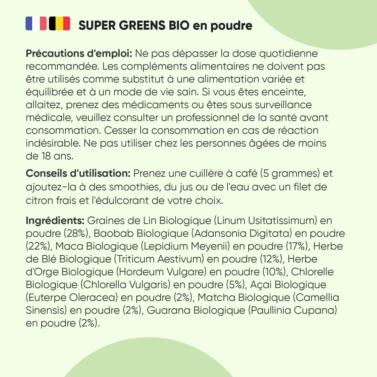 SUPER GREEN POWDER – Composed of 9 green superfoods, the super greens powder contains mainly organic maca powder, matcha, guarana powder, organic chlorella, organic baobab powder, wheat grass, organic acai powder, organic barley powder and flax that integrate into a varied food routine.