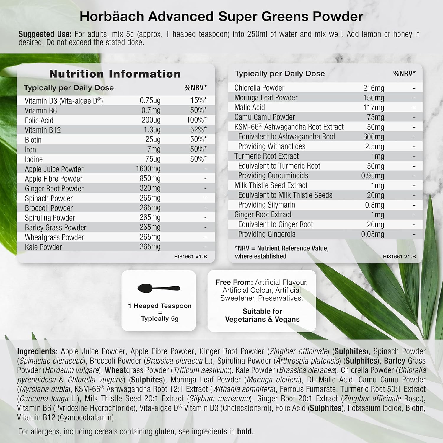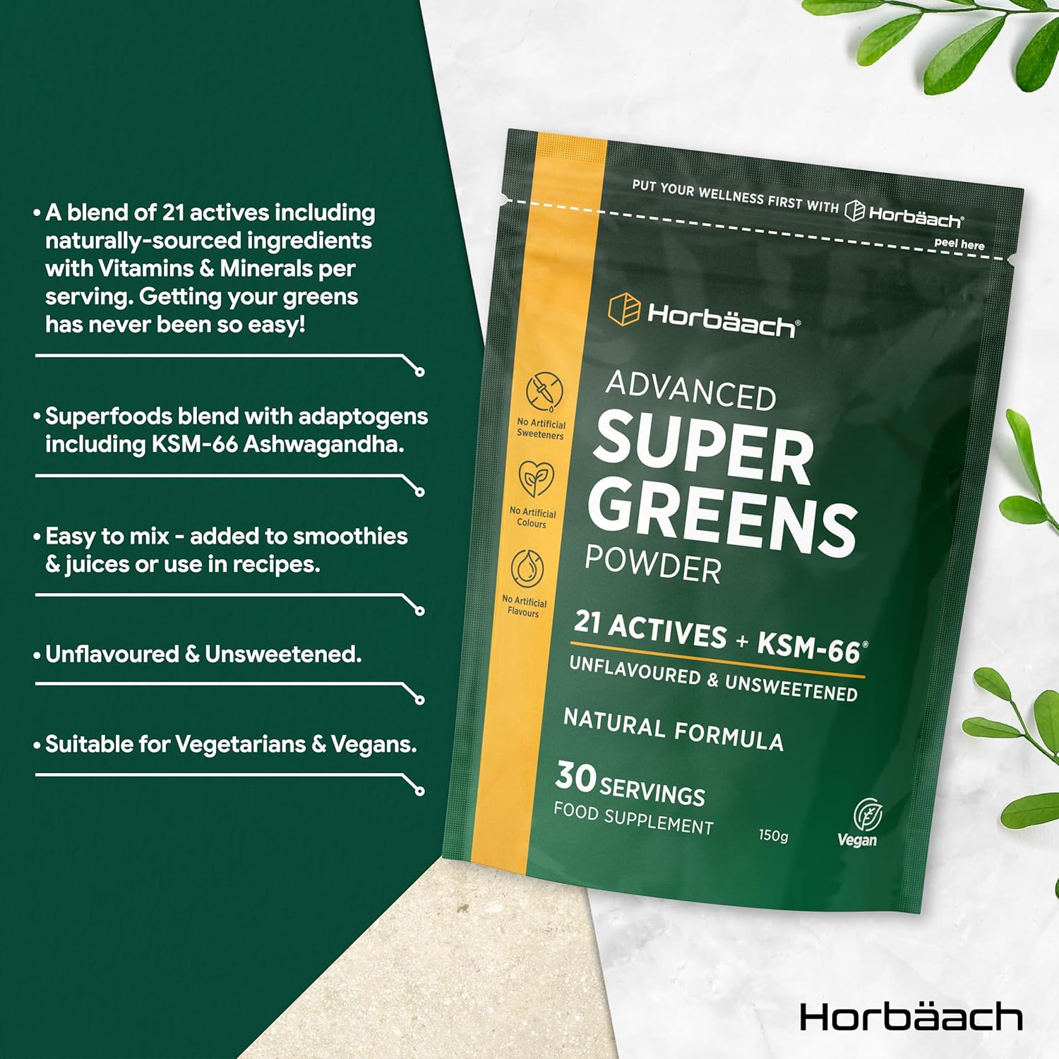 WHY HORBAACH GREENS POWDER? : Nutrient-rich green vegetable powder with 21 active ingredients and Ashwagandha root extract KSM-66.