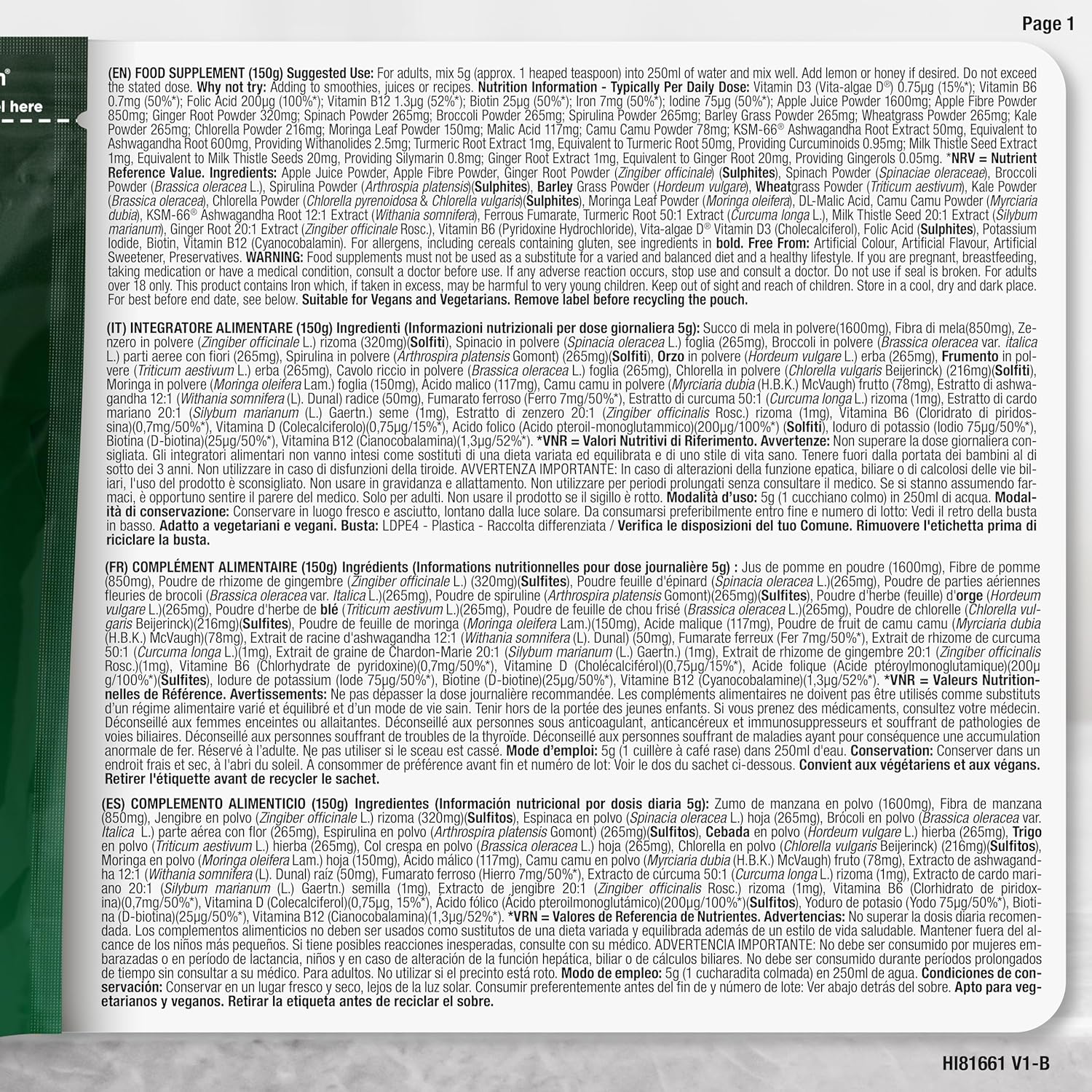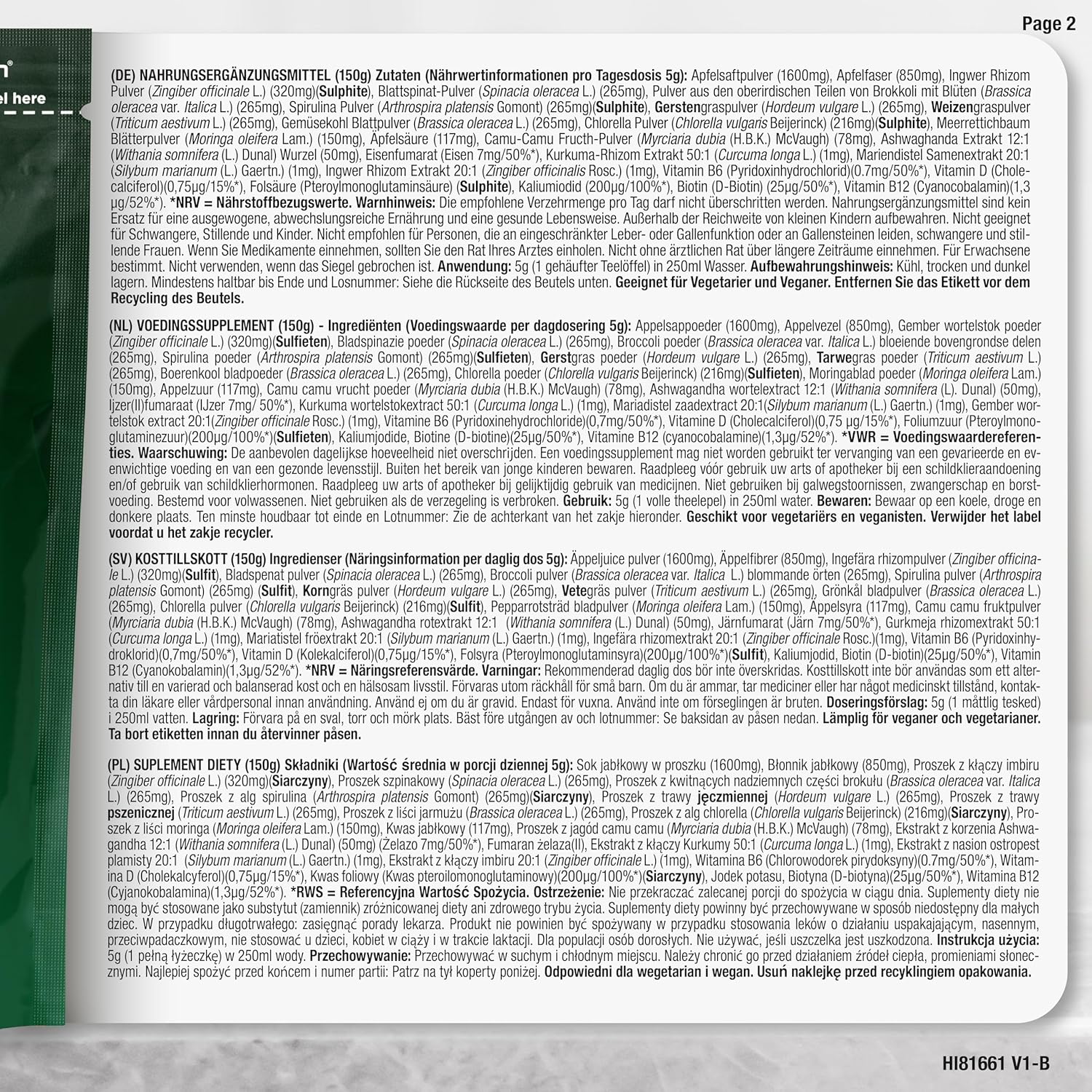 Incorporate more greens into your diet by simply mixing 5g (1 domed teaspoon) of powder into your daily drinks, smoothies, juices, water, or even sprinkling it over your salads.