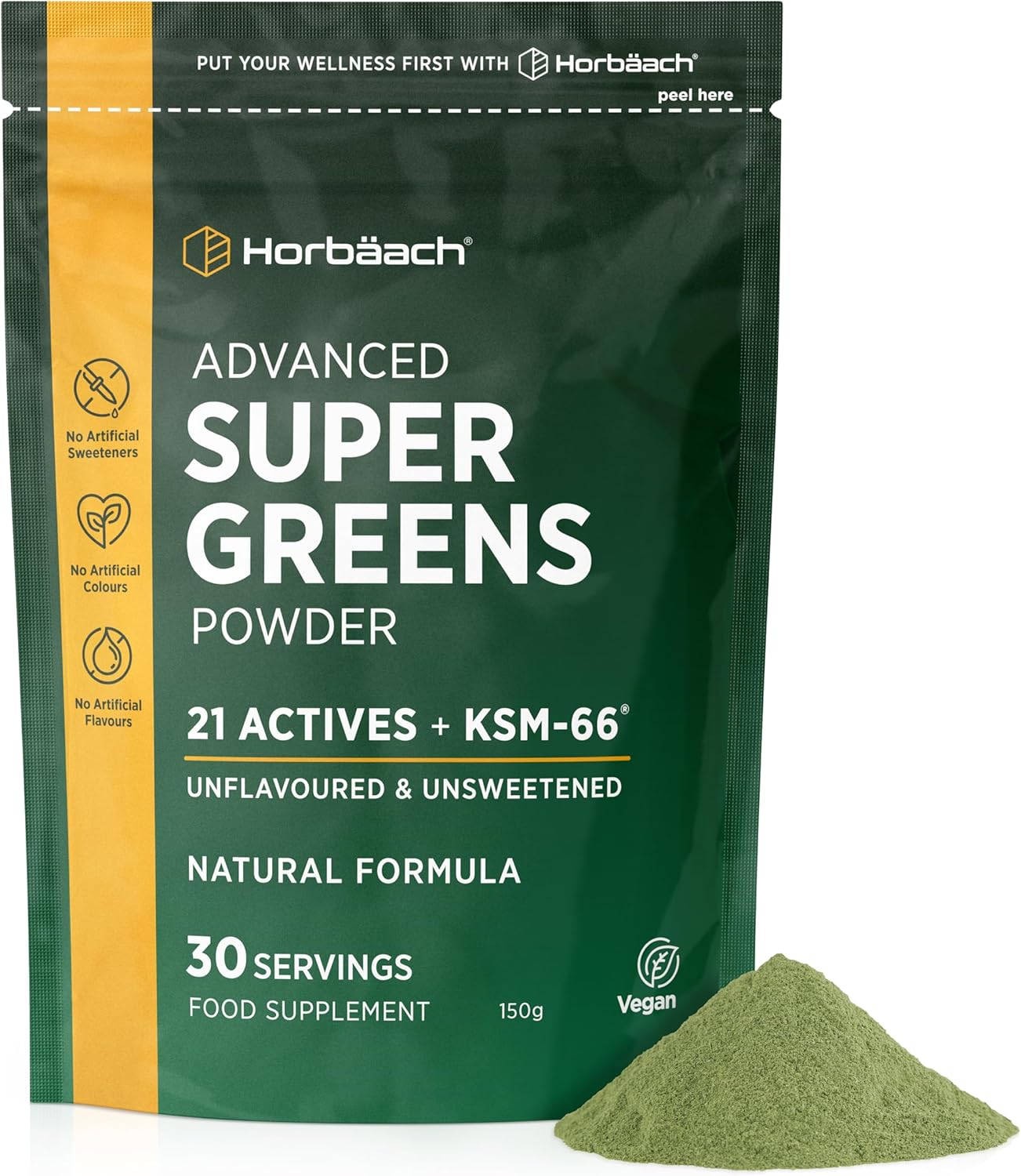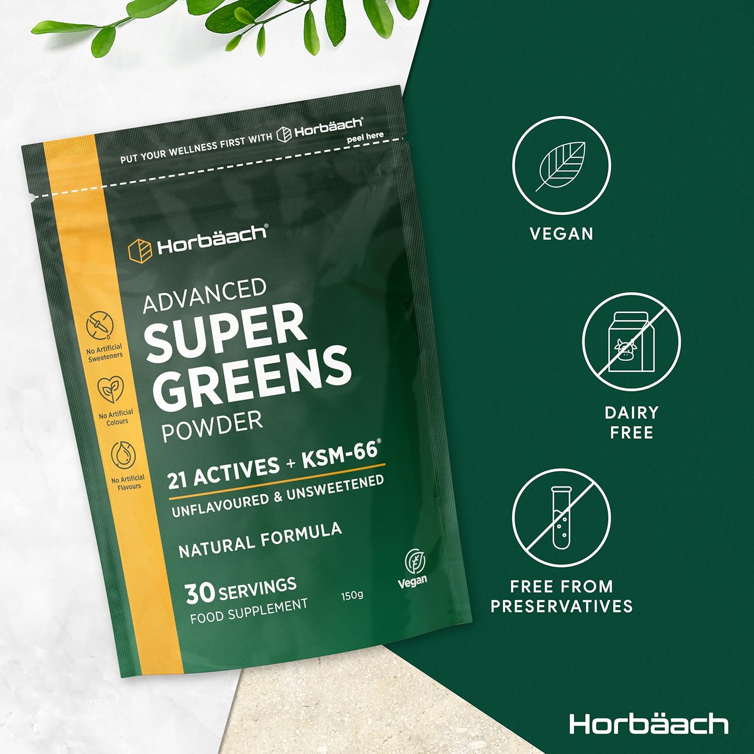 Super Greens Powder | 150g | Vegan Food Supplement Powder With Ashwagandha KSM-66 and 21 Active Ingredients – Chlorella, Spirulina, Wheat Grass, Multivitamins and Minerals and More | Horbaach