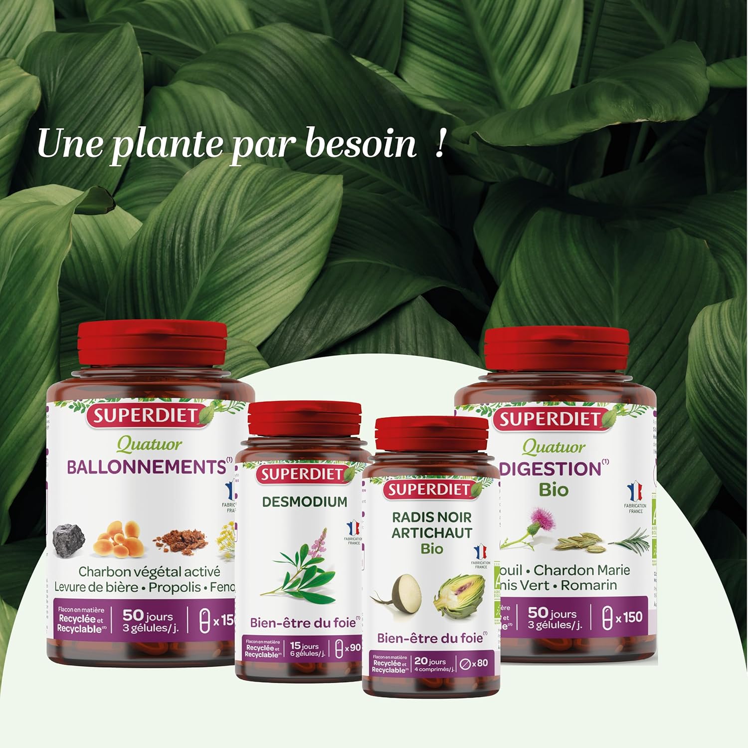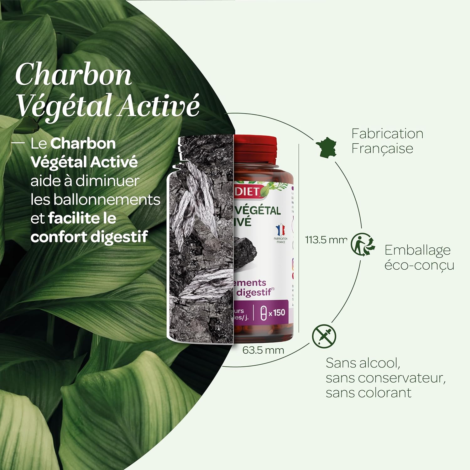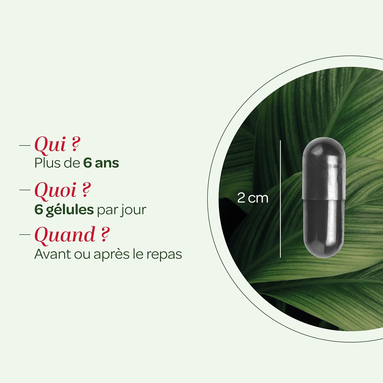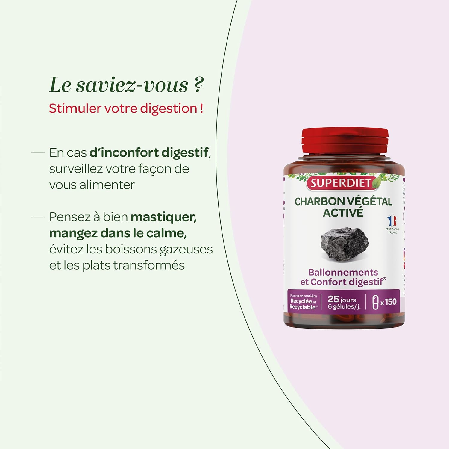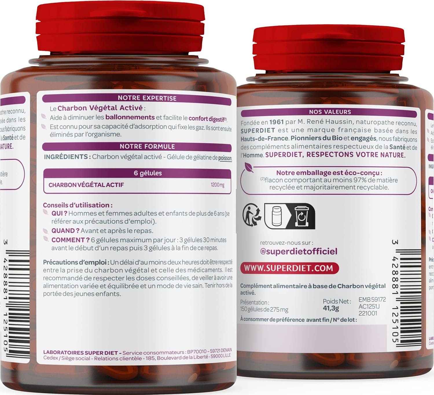 SUPERDIET – ACTIVATED VEGETAL CHARCOAL – Bloating and digestive comfort – Herbal medicine – Made in France – 150 capsules ✦ Bloating and intestinal gas? Intestinal bloating is due to the accumulation of intestinal gases that cannot be eliminated and accumulate. Our activated vegetable charcoal helps reduce bloating and facilitates digestive comfort. Activated vegetable charcoal is known for its absorption capacity which fixes gases that are then removed by the body. Activation of activated vegetable charcoal is done through combustion, followed by a thermal shock in the presence of water vapor, making it porous. These pores attract and retain liquid or gas. Activation thus makes it possible to increase the adsorbent power of the coal gases. ✦ Take a maximum of 6 capsules per day: 3 capsules 30 minutes before the start of a meal and then 3 capsules at the end of this meal. Before and after the meal. Suitable for adults and children over 6 years of age (see precautions for use). ✦Activated Vegetable Charcoal – FISH Gelatin Capsule. // Per 1 capsule, 200 mg Vegetable charcoal. ✦ A period of at least two hours must be observed between taking vegetable charcoal and medication. It is recommended to adhere to the recommended doses, to ensure that you have a varied and balanced diet and a healthy lifestyle. Keep out of reach of young children.