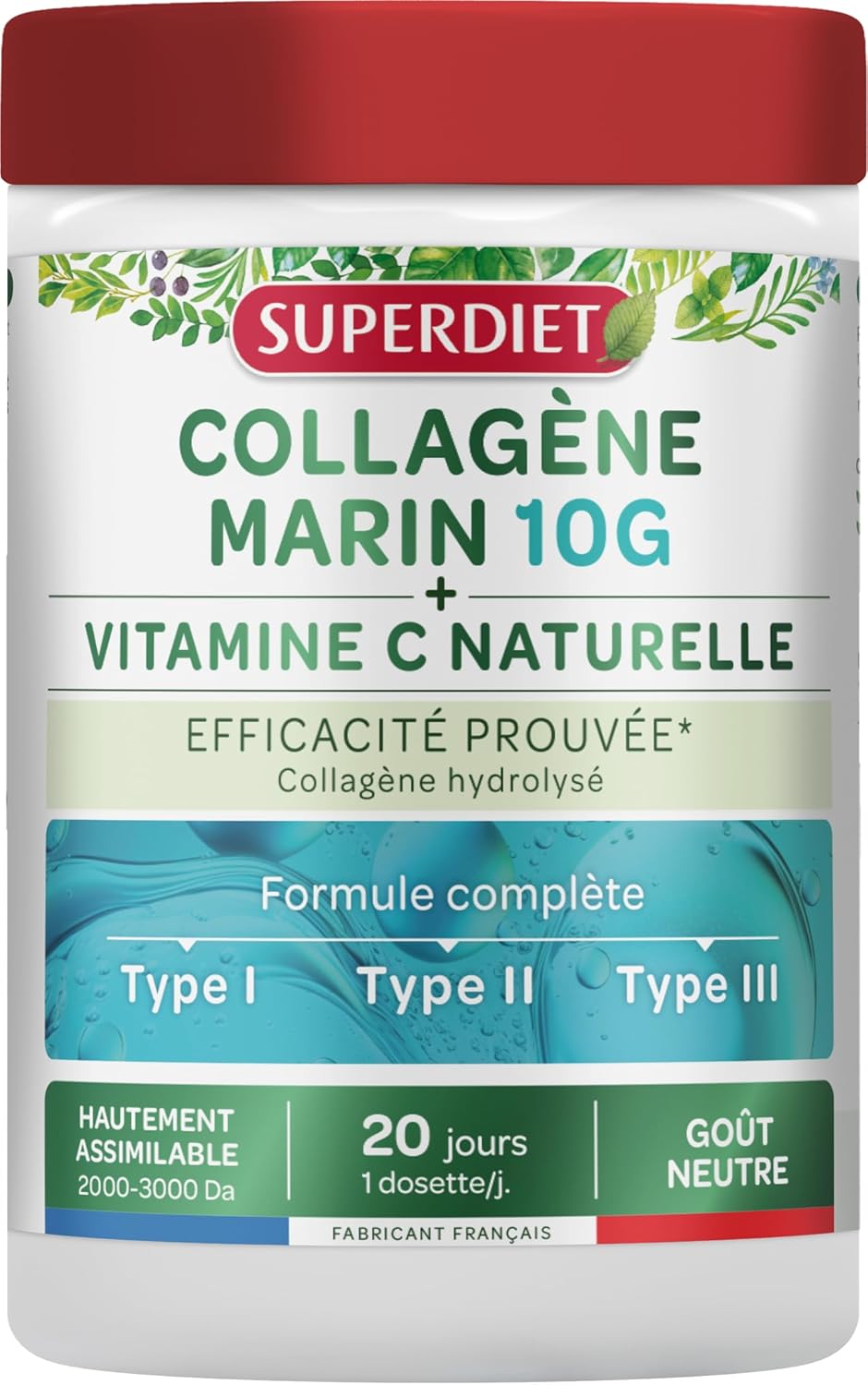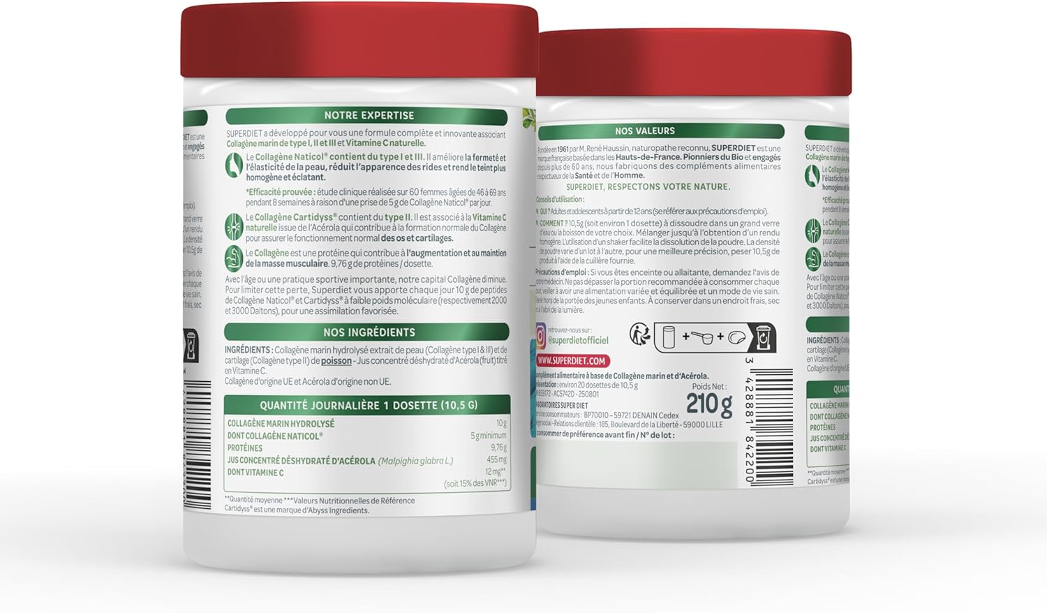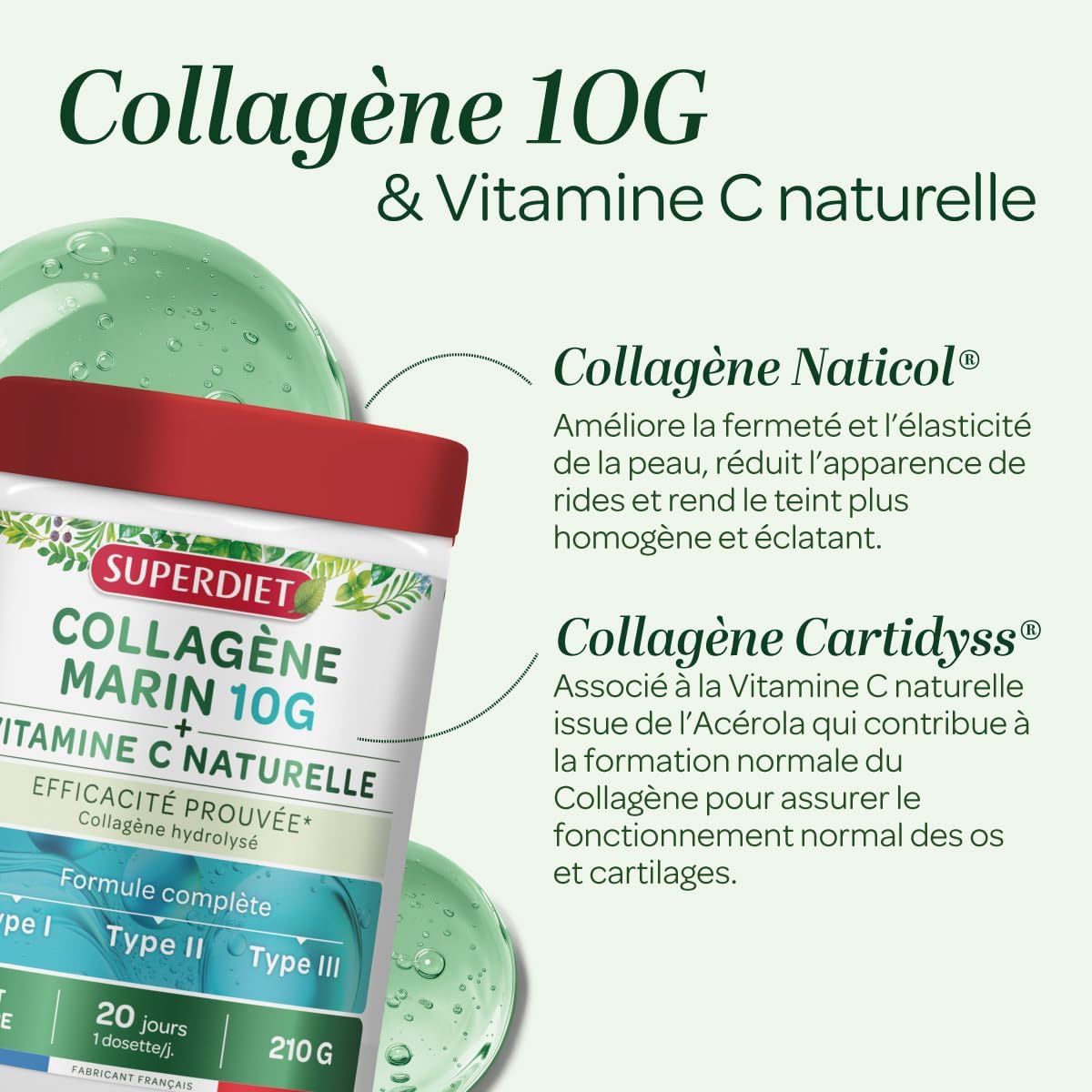 SUPERDIET – MARINE COLLAGEN + NATURAL VITAMIN C – Flavor-free – Skin, joints, muscles – Made in France – 210g Powder: SUPERDIET Marine Collagen: The effective formula for radiant skin and joints in full shape. Collagen is an abundant fibrous protein found in the human body. It is an essential part of the structure and function of various tissues, including skin, bones, tendons, ligaments, and cartilages.There are several types of collagen, each of which has a specific function in the body: Type I Collagen is present in skin tissues. Type II Collagen is localized in the tendons and cartilage of our joints.Type III collagen is present in connective tissues, especially in the walls of blood vessels and in smooth muscles.Collagen is produced naturally by the body, but its production decreases with age or due to important sports practice. SUPERDIET has developed for you a complete and innovative formula with proven effectiveness combining marine collagen of TYPE I, II and III and natural vitamin C, to adapt to all your needs. Naticol Collagen contains type I and III. It improves the firmness and elasticity of the skin, reduces the appearance of wrinkles and makes the complexion more even and radiant. Proven efficacy: clinical study carried out on 60 women aged 46 to 69 years for 8 weeks with a dose of 5 g of Naticol Collagen per day. Cartidyss Collagen contains type II. It is combined with natural Vitamin C from Acerola which contributes to the normal formation of Collagen to ensure the normal functioning of bones and cartilage. Collagen is a protein that contributes to the increase and maintenance of muscle mass. 9.5 g protein / pod. Supediet brings you 10 g of hydrolyzed collagen peptides Naticol and Cartidyss at low molecular weight (4000 Da) every day for a favored assimilation. Find our Marine Collagen in an ultra practical powder format: 1 pod per day to dissolve in the drink of your choice. WHO? Adults and adolescents from 12 years old (refer to precautions for use). HOW? 1 pod (10.5 g) to dissolve in a large glass of water or the beverage of your choice. Mix until a homogeneous rendering is obtained. The use of a shaker facilitates the dissolution of the powder.Hydrolyzed marine collagen extracted from skin (collagen type I & III) and cartilage (collagen type II) of FISSE; Dehydrated concentrated Acerola juice titrated in vitamin C (fruit)✦1 pod (i.e. 10.5 g) to dissolve in a large glass of water or the drink of your choice. x.✦ Mix until a homogeneous rendering is obtained. Using a shaker makes it easier to dissolve the powder.If you are pregnant or breastfeeding, seek advice from your doctor. Do not exceed the recommended portion to be consumed every day, be sure to have a varied and balanced diet and a healthy lifestyle. Keep out of the reach of young children. ✦OUR VALUES ✦ By choosing SUPERDIET, you support a French manufacturer laboratory, committed to your well-being. Since our creation in 1961, we have continued the know-how of our founder M. Haussin, naturopath and pioneer of the Bio.