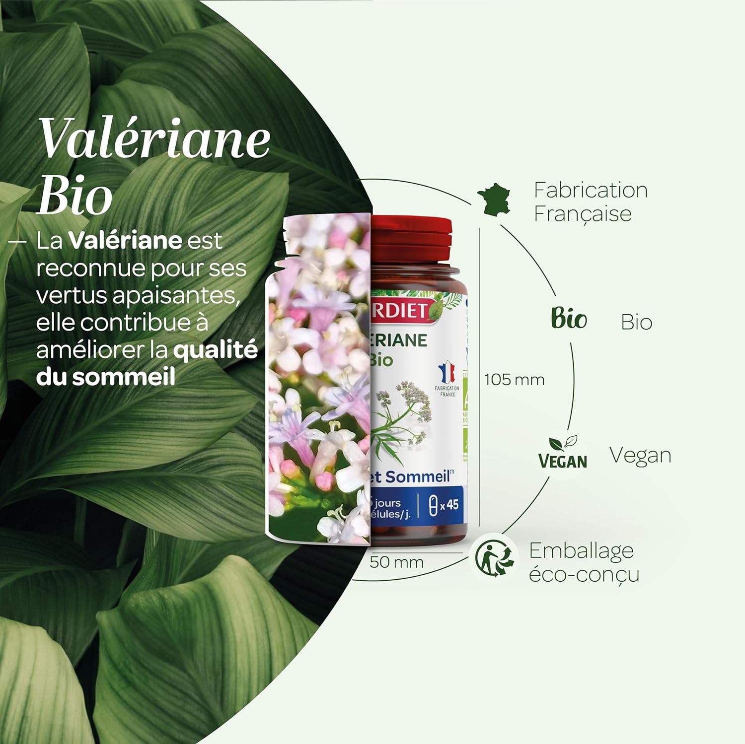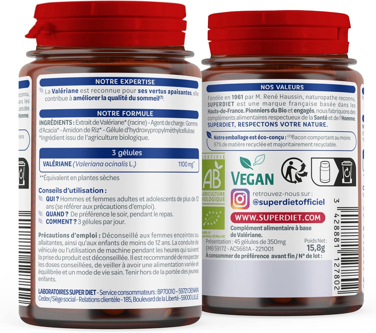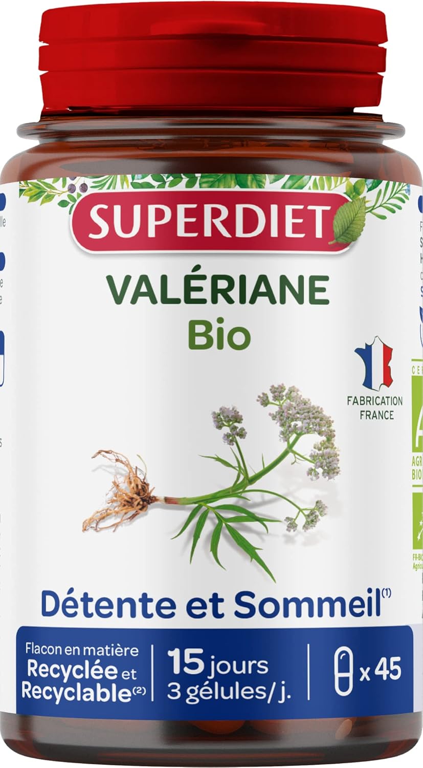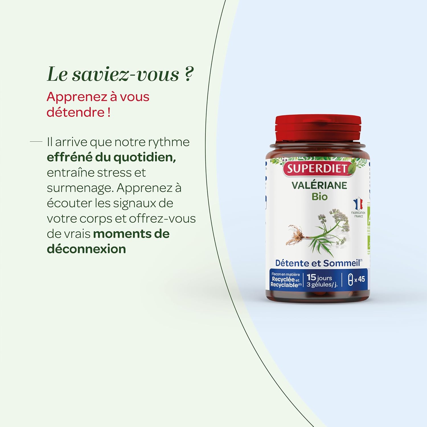 SUPERDIET – VALÉRIANE ORGANIC – Relaxation and Sleep – Phytotherapy – Made in France – 45 capsules ✦You want to enjoy a serene sleep? Discover the Valerian Bio Superdiet, which contributes to calming and relaxation. Format 45 capsules for 15 days of treatment. Valerian, originally from Europe, has been used since ancient times. It is its roots that are recognized for their soothing and calming properties. Valerian helps to improve sleep quality. Did you know?Work is good… rest too! It happens that our frantic pace of everyday life leads to stress and overwork. Learn to listen to your body’s signals and give yourself real moments of disconnection. Give yourself a few days of vacation, moments of meditation or relaxation. Forget about your screens and observe the results on your sleep.✦ Take 3 capsules a day preferably in the evening, during the meal with a large glass of water. Intended for adults and adolescents of pus 12 years old (see precautions for use). ✦Valerian extract BIO (root) – Filling agent: AcaciaBIO gum – Organic rice starch – Hydroxypropyl methylcellulose capsule // For 3 capsules: 1100mg of Valerian (Valeriana officinalis L.) ✦Not recommended for pregnant or lactating women, as well as children under 12 years of age. ✦ Driving or using machines during the hours after taking the product is not recommended. It is recommended to adhere to the recommended doses, to ensure that you have a varied and balanced diet and a healthy lifestyle. Keep out of reach of young children. ✦OUR VALUES ✦ Founded in 1961 by M.René Haussin, a renowned naturopath, SUPERDIET is a French brand based in Hauts-de-France. Pioneers of organic and committed, we manufacture food supplements respectful of Health and Man.