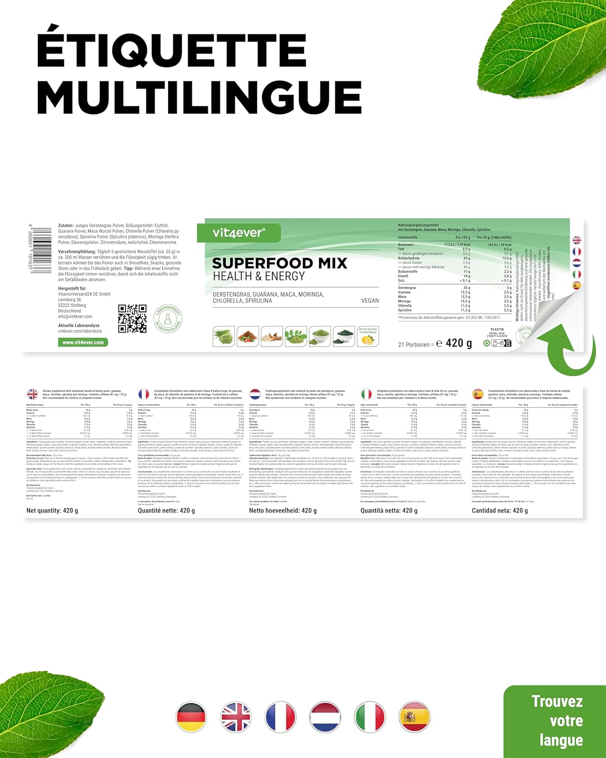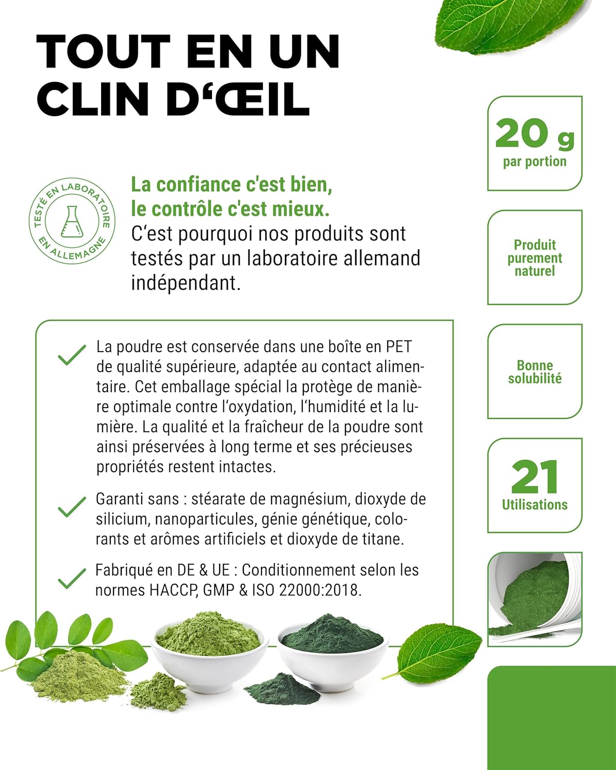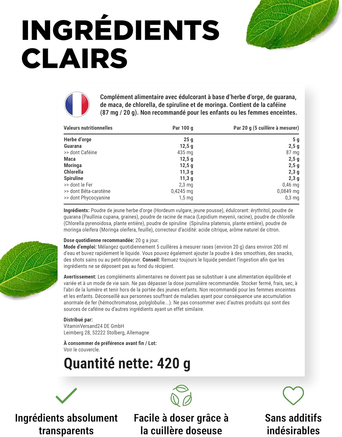 HIGHLY DOSED AND CONVENIENT FOR 6 MONTHS: Each box contains 420g of highly concentrated superfood powder with a unique blend of barley grass, guarana, maca root, chlorella, spirulina and moringa. Thanks to its high-quality plant ingredients, the product is particularly rich and versatile.