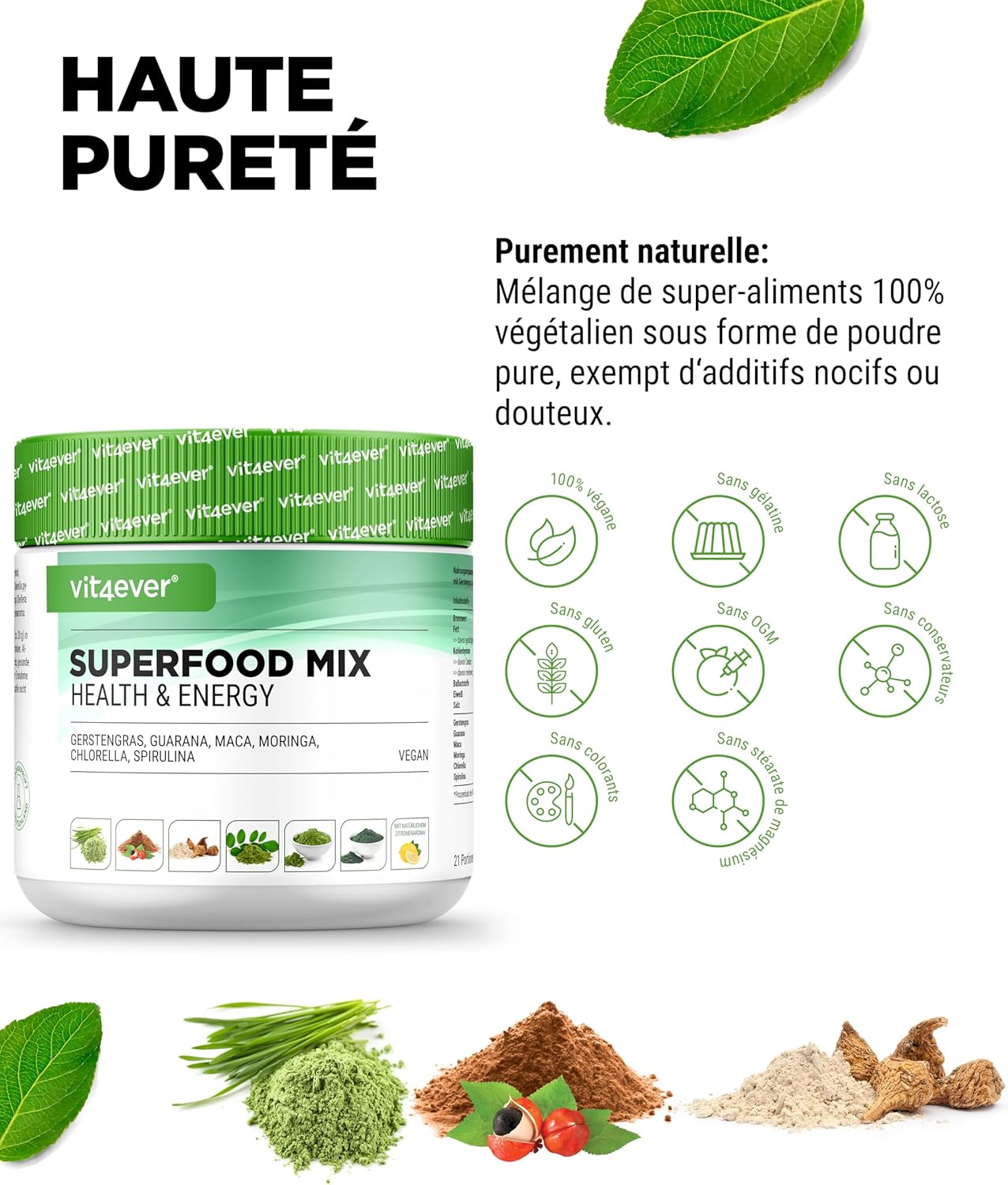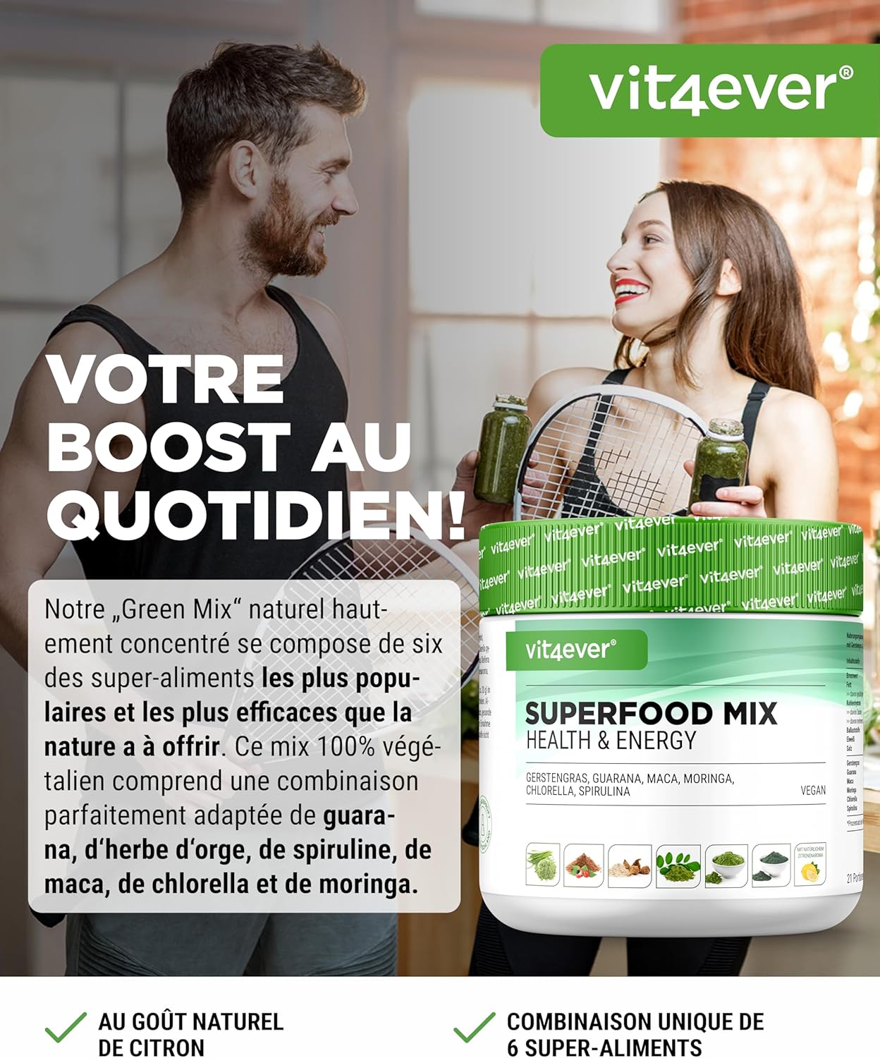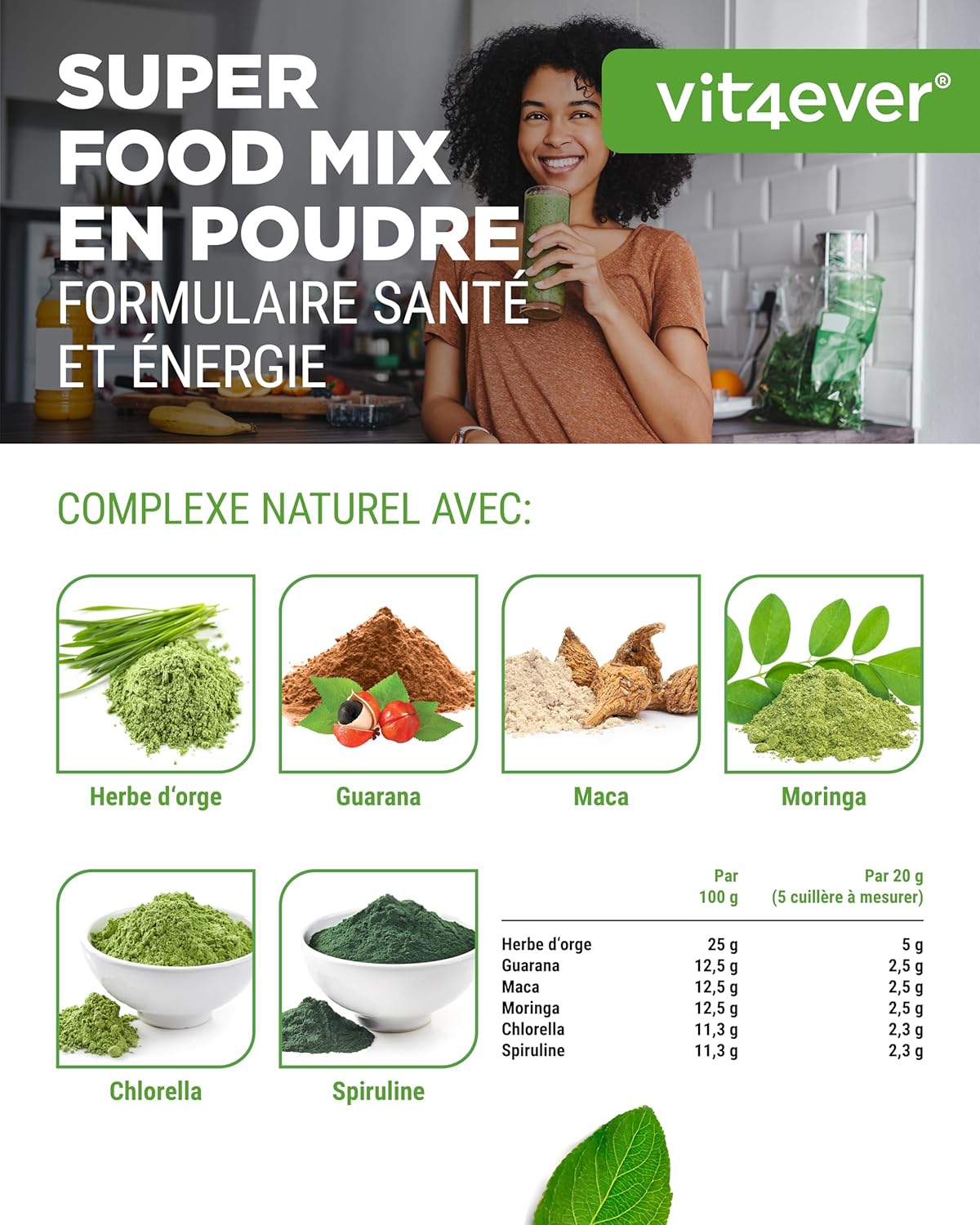 HIGHLY DOSED AND CONVENIENT FOR 6 MONTHS: Each box contains 420g of highly concentrated superfood powder with a unique blend of barley grass, guarana, maca root, chlorella, spirulina and moringa. Thanks to its high-quality plant ingredients, the product is particularly rich and versatile.