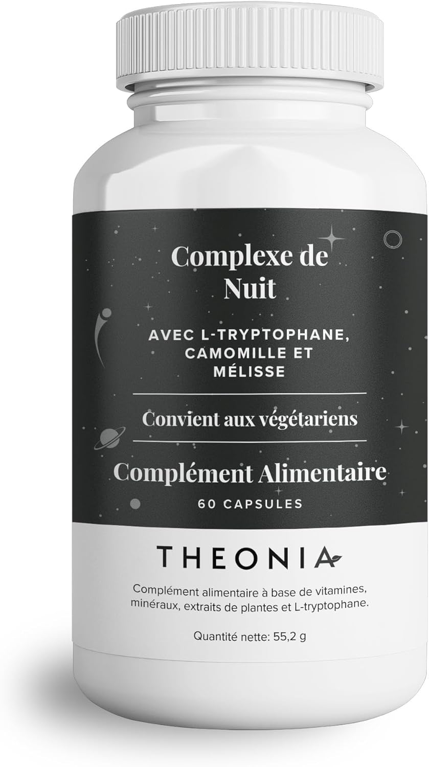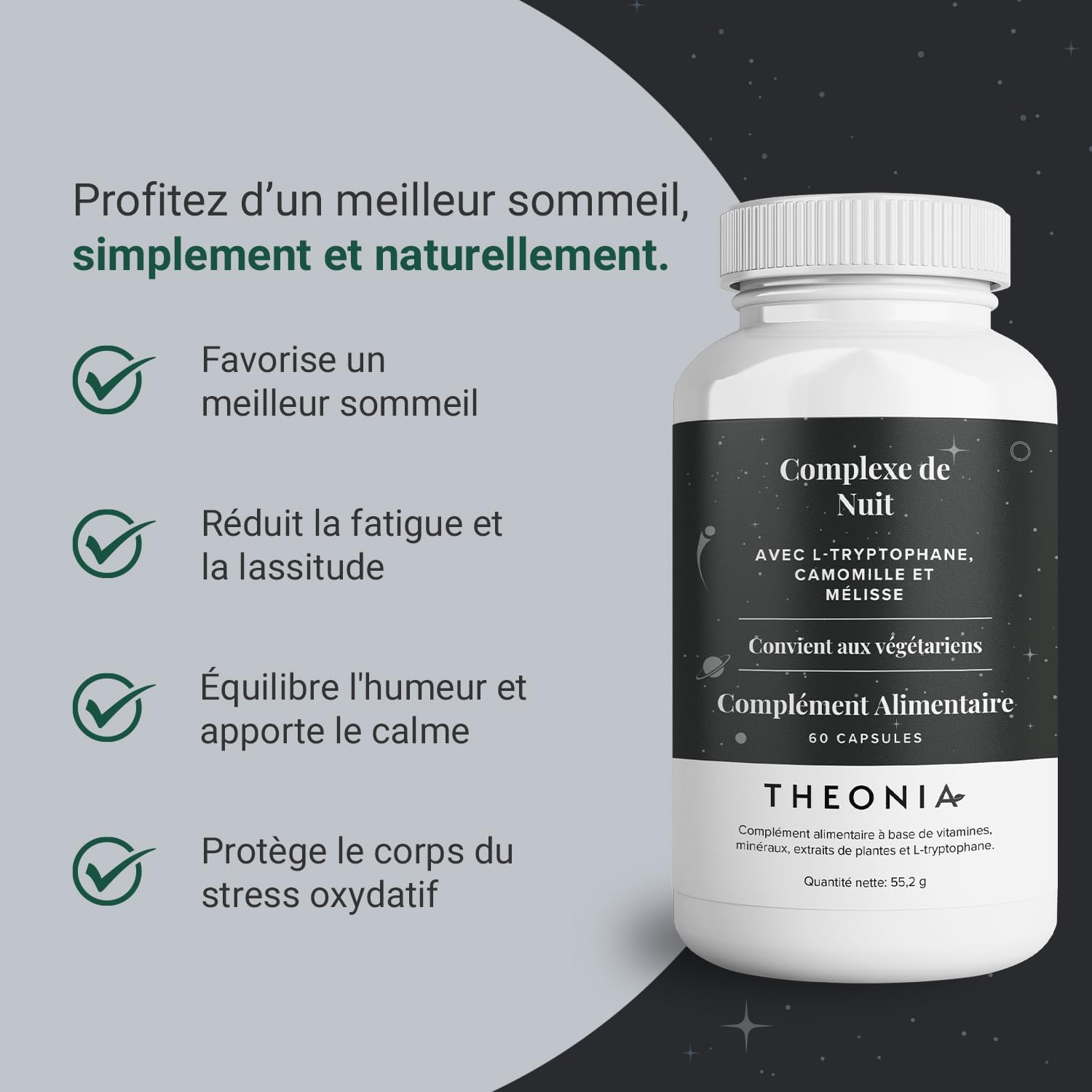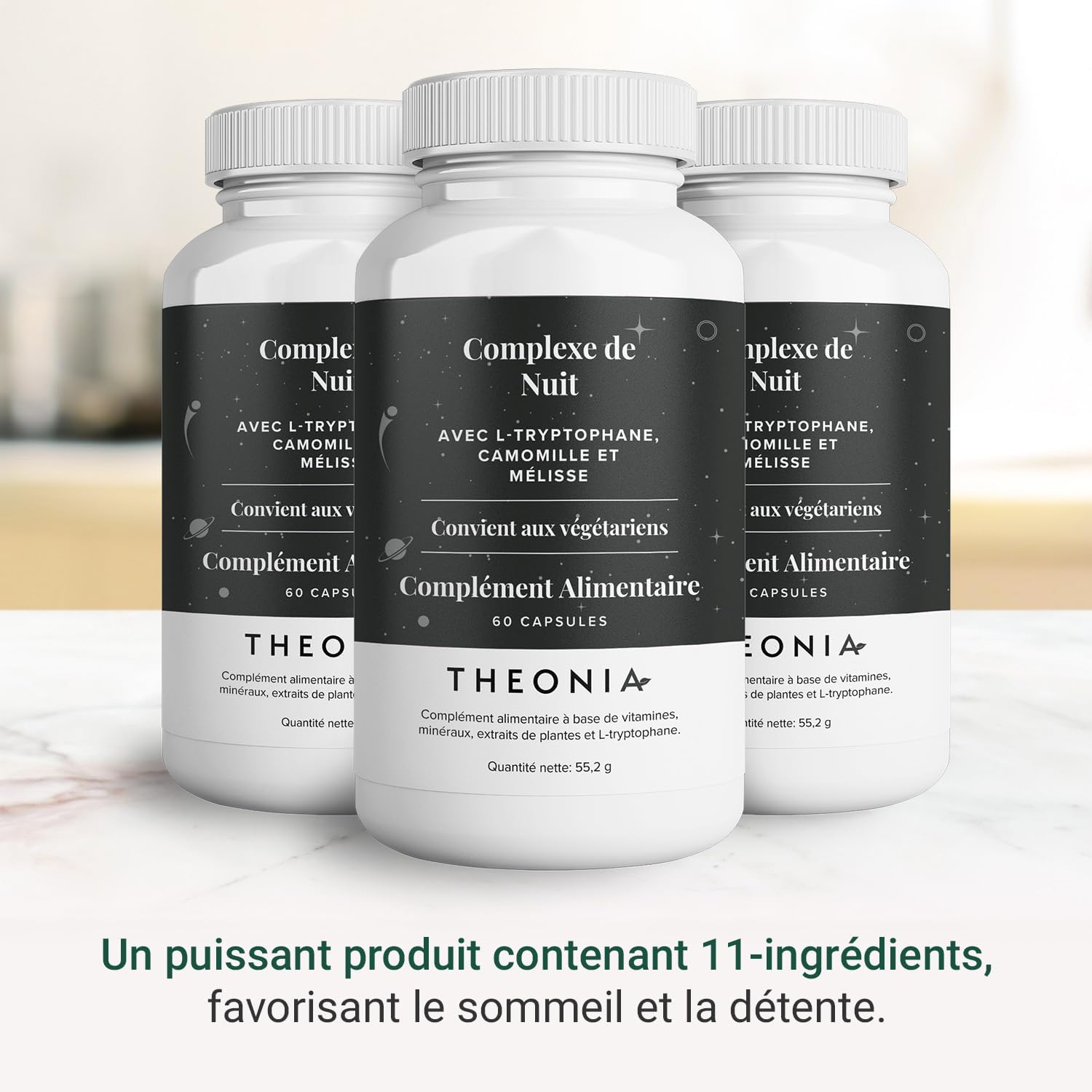 Theonia Night Complex with 100mg L-Tryptophan, Chamomile and Lemon Balm Natural Supplement for Sleep and Relaxation – 60 Capsules, Non-GMO, Vegetarian