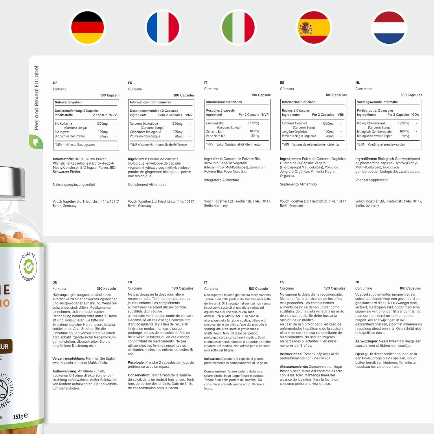 Turmeric Ginger Black Pepper 1440 mg, 180 Capsules Organic Turmeric Powder (Organic Curcumin) Food Supplement Turmeric Piperine and Ginger Gelula, Turmeric Turmeric Capsules VitaBright