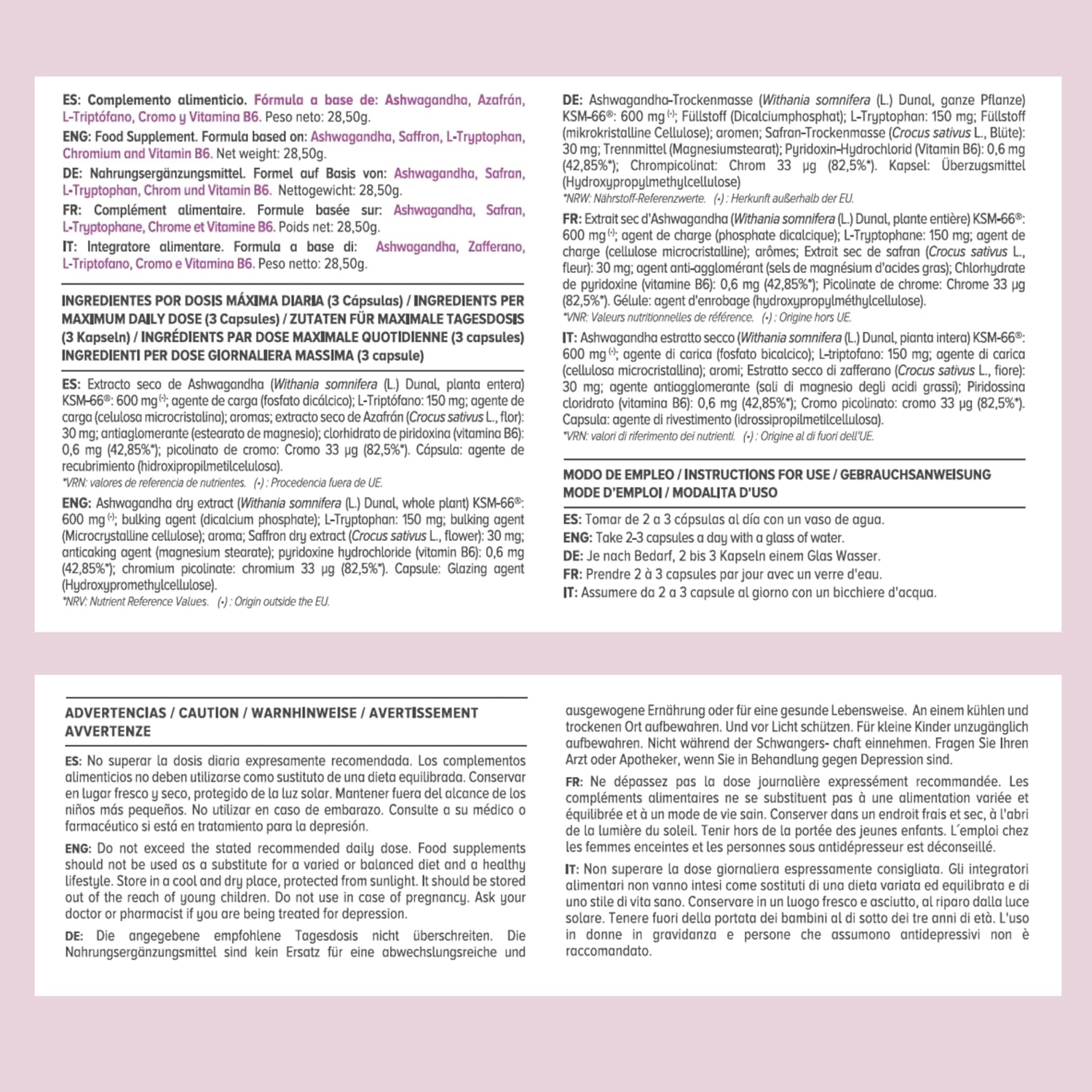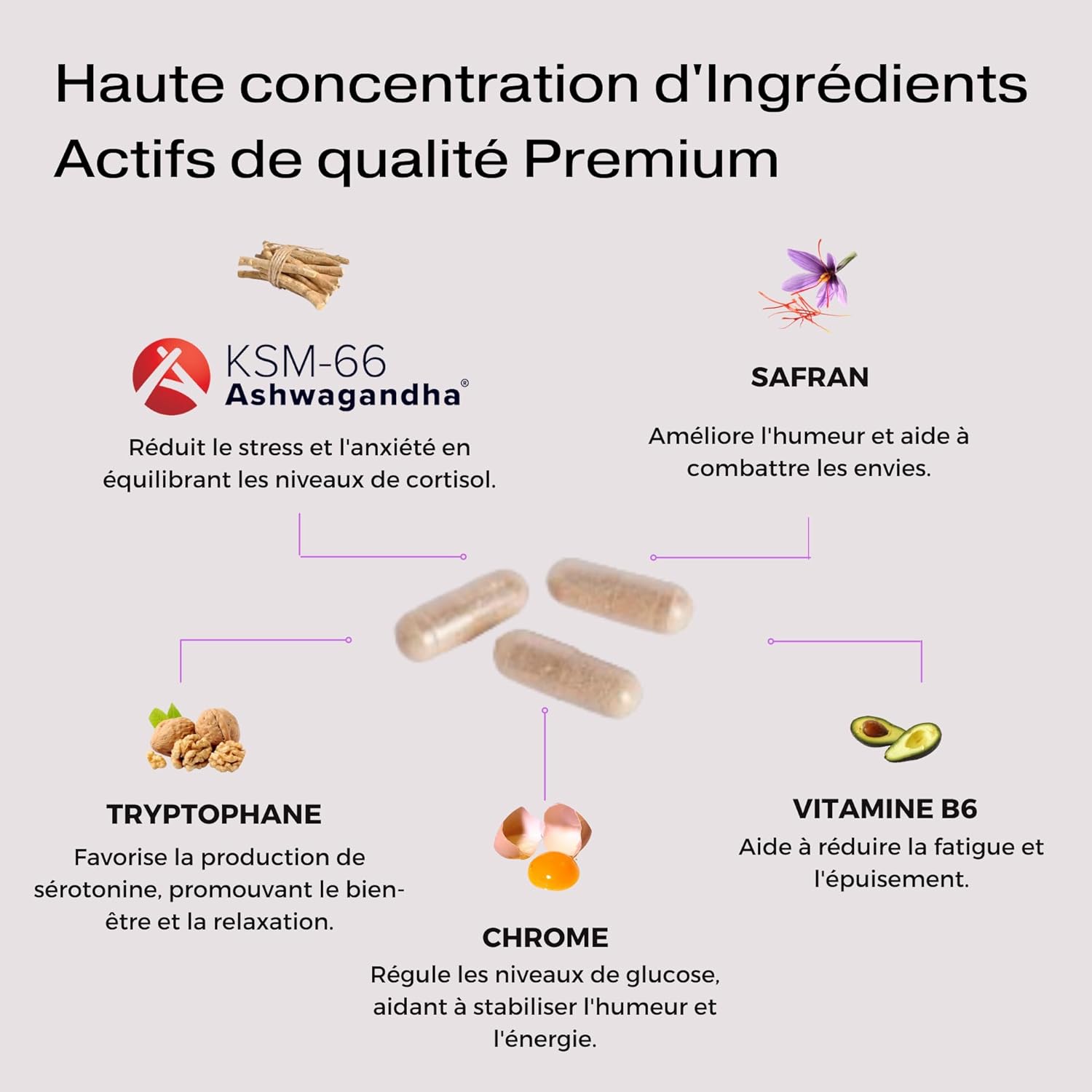 Sa formule comprend de l’extrait sec d’Ashwagandha KSM-66 (Withania somnifera), de l’extrait sec de safran, du tryptophane, du picolinate de chrome et de la vitamine B6.
