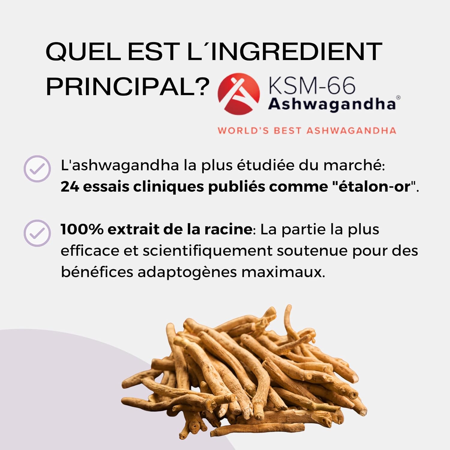 Propriétés adaptogènes aidant à maintenir l’équilibre émotionnel: réduction du stress, amélioration de la qualité du sommeil, relaxation et amélioration de l’énergie. KSM66 scientifiquement prouvé.