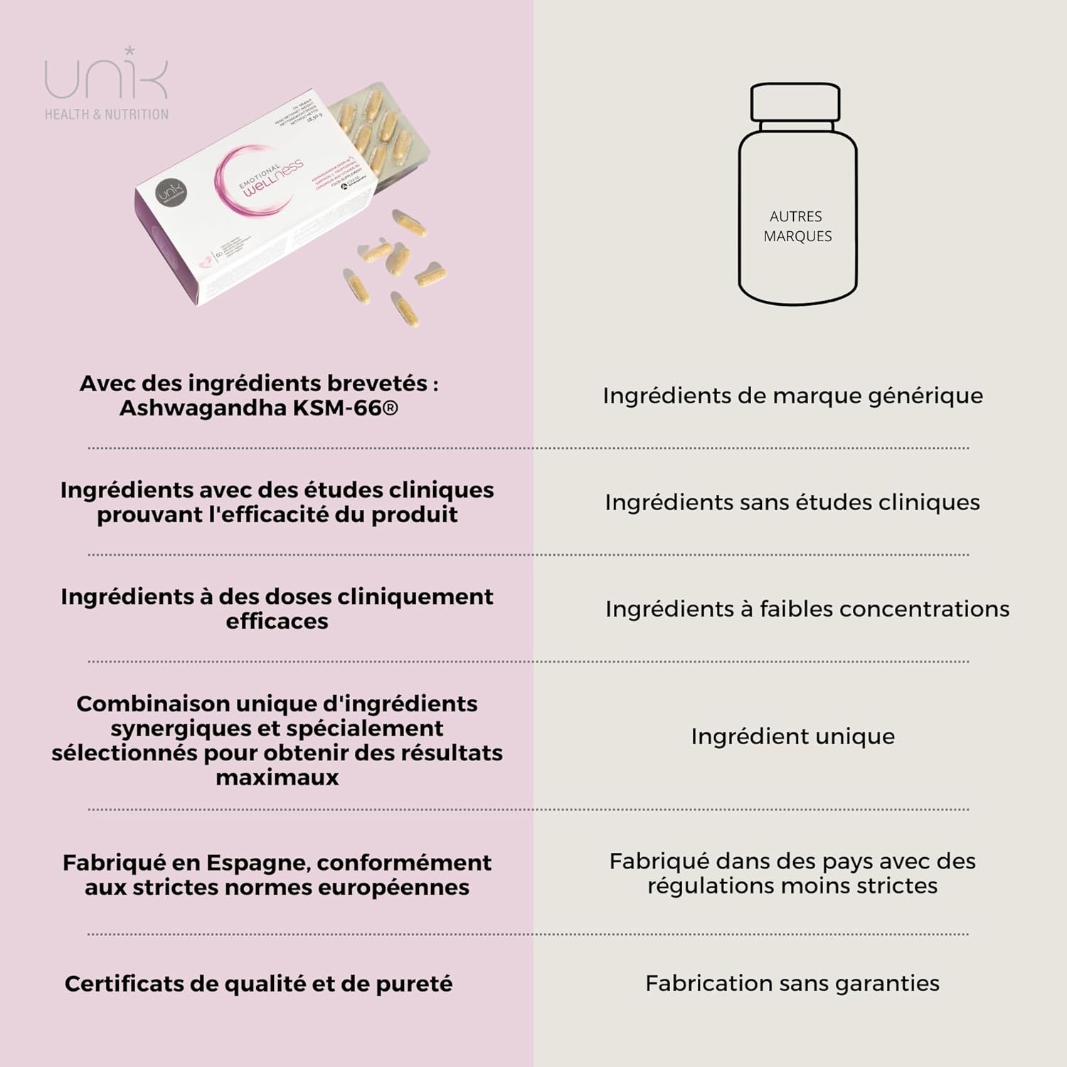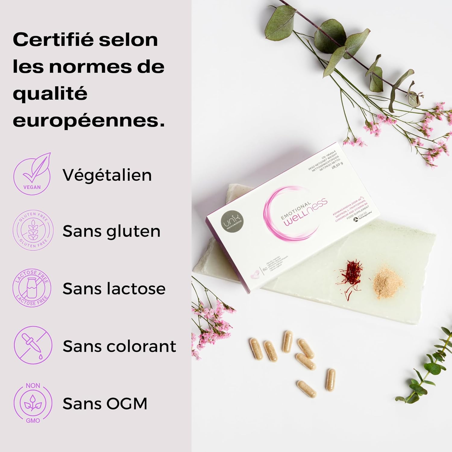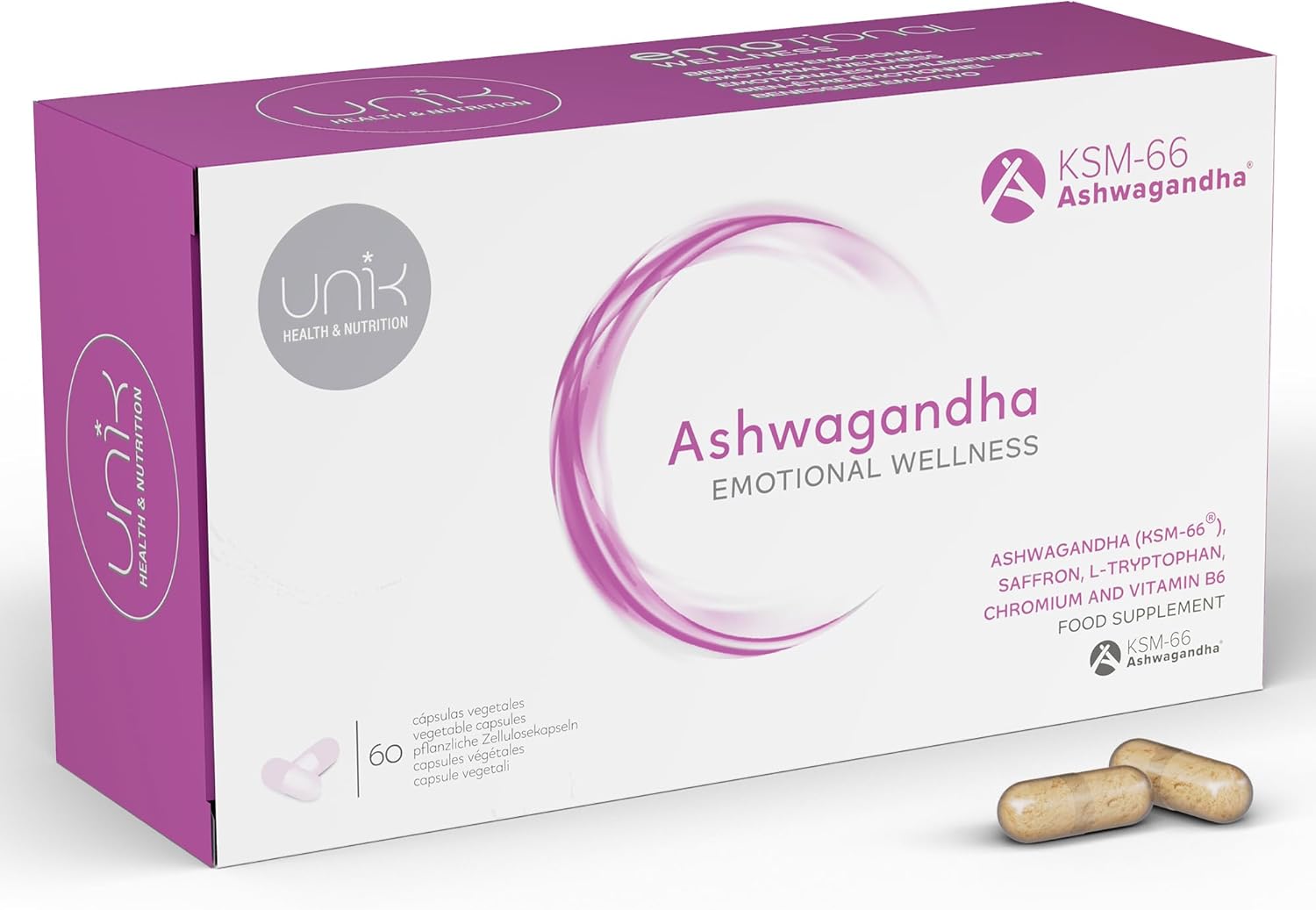 SUPERIOR QUALITY INGREDIENTS: Ashwagandha KSM-66, saffron extract, tryptophan, vitamin B6 and chromium. Unik Emotional Wellness Dietary Supplement.