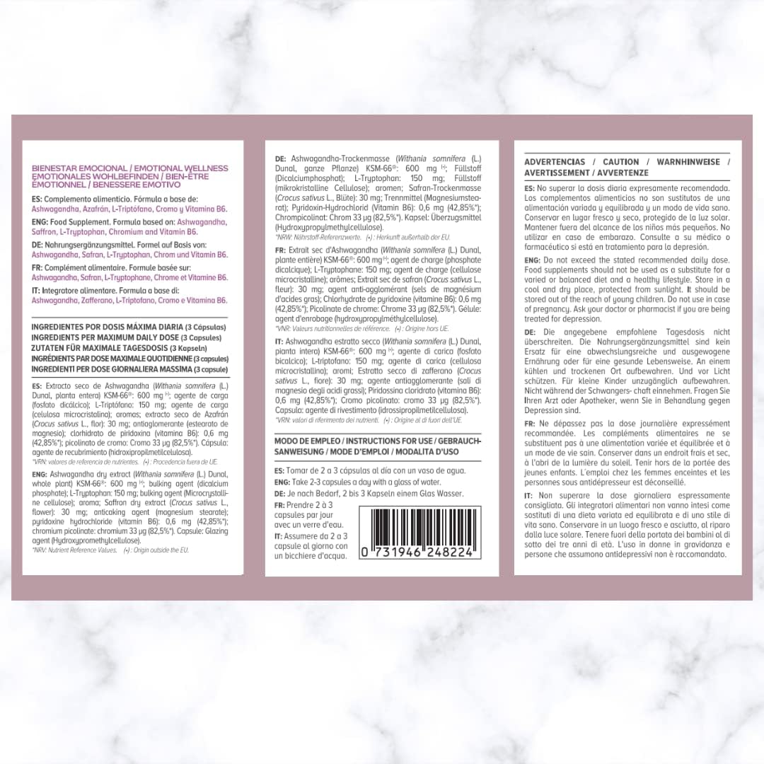 BENEFITS: Its formula includes natural ingredients specially selected to help maintain emotional balance. STRESS, ANXIETY, MOOD, IRRITABILITY, INSOMNIA, FOOD SHRINKING ANXIETY, FATIGUE and SPRING ASTENIA. Ashwagandha has been shown to improve stress resistance, bring tranquility and energy in a natural way, helps improve the quality of sleep and relaxation.