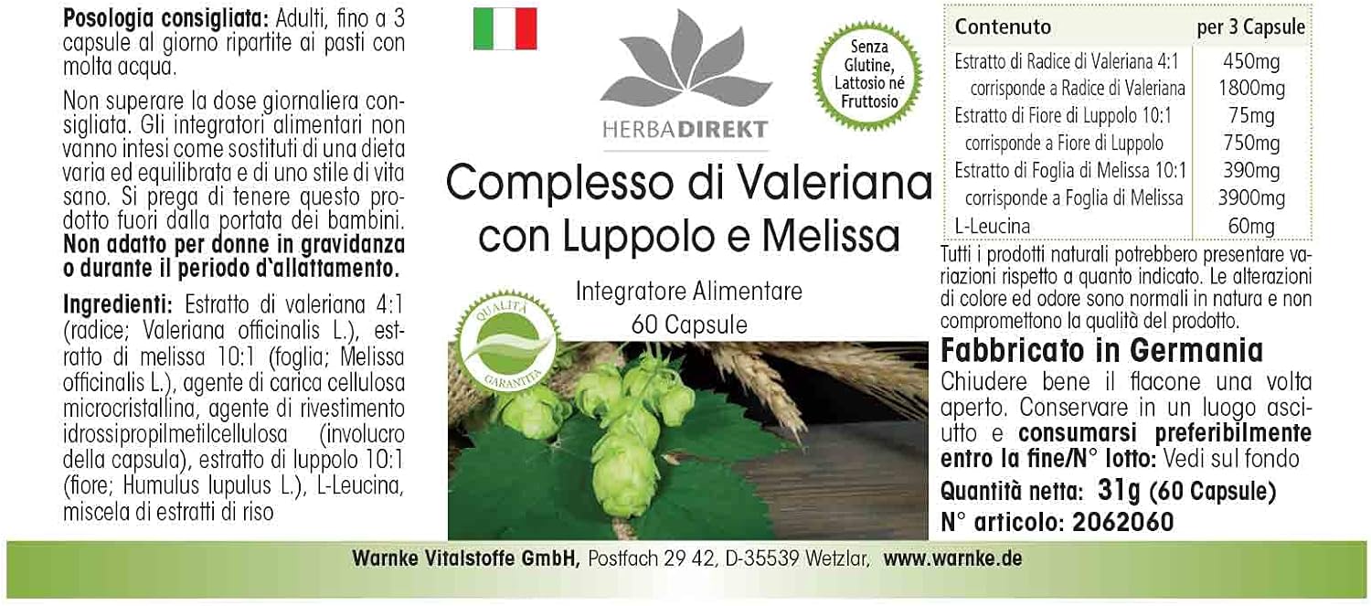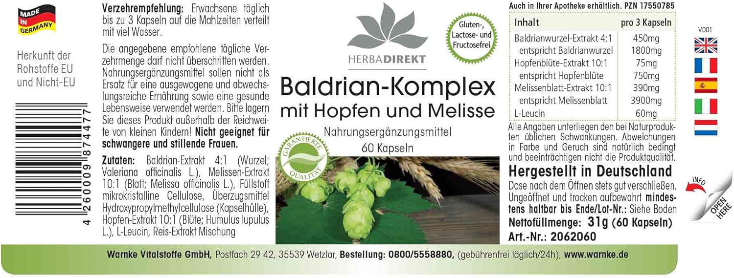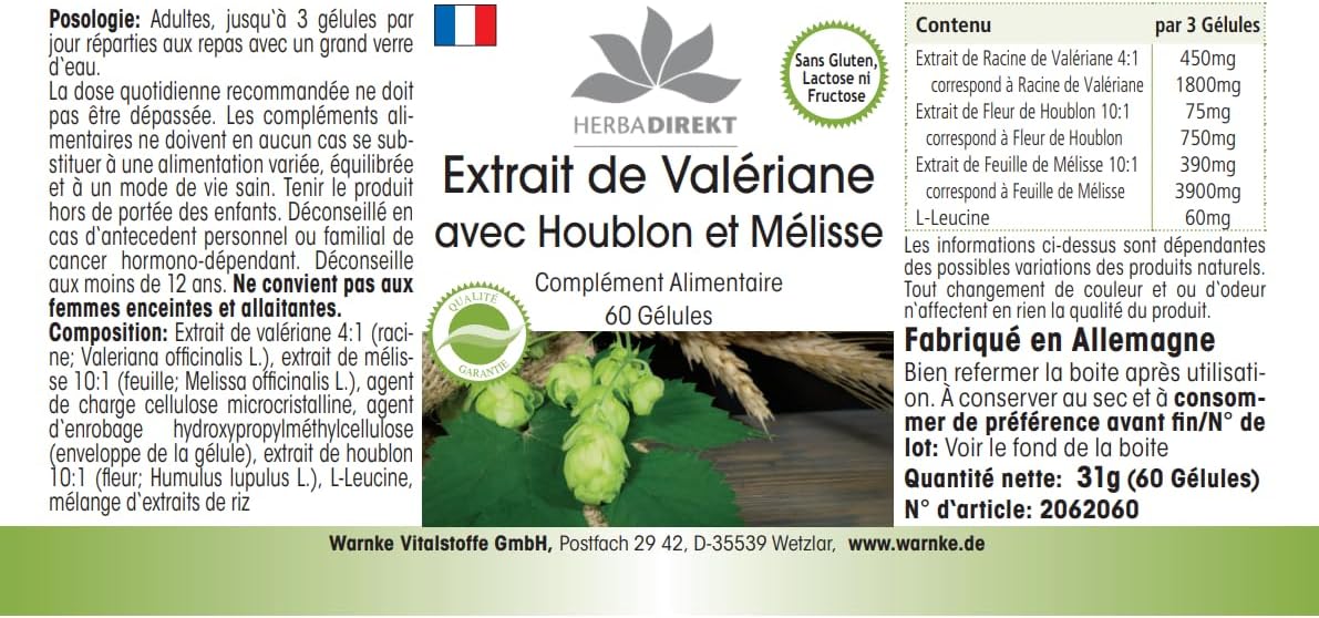 Herbadirekt Valerian Extract with Hops & Melissa, Vegan, Gluten Free, Lactose Free, Fructose Free, Yeast Free, Gelatin Free, Vegan. Directions for use: adults up to 3 capsules per day spread over meals with plenty of water. Note: Not suitable for pregnant and lactating women. Three capsules contain: valerian root extract (4:1) 450 mg corresponds to valerian root 1800 mg hop cone extract (10:1) 75 mg corresponds to 750 mg lemon balm extract (10:1) 390 mg corresponds to 3900 mg ingredients: valerian root extract T (4:1), lemon balm extract (10:1), microcrystalline cellulose filler, hydroxypropyl methylcellulose coating agent (capsule shell), hop cone extract (10:1), release agent, magnesium salts of food fatty acids, net capacity: 30 g/60 capsules