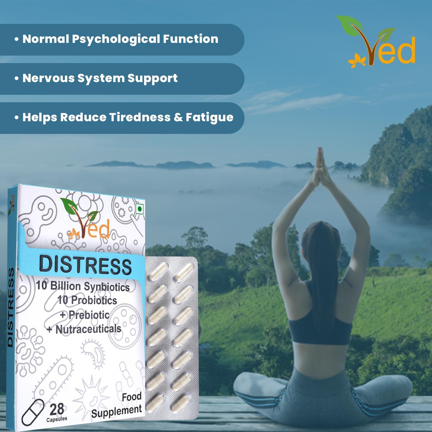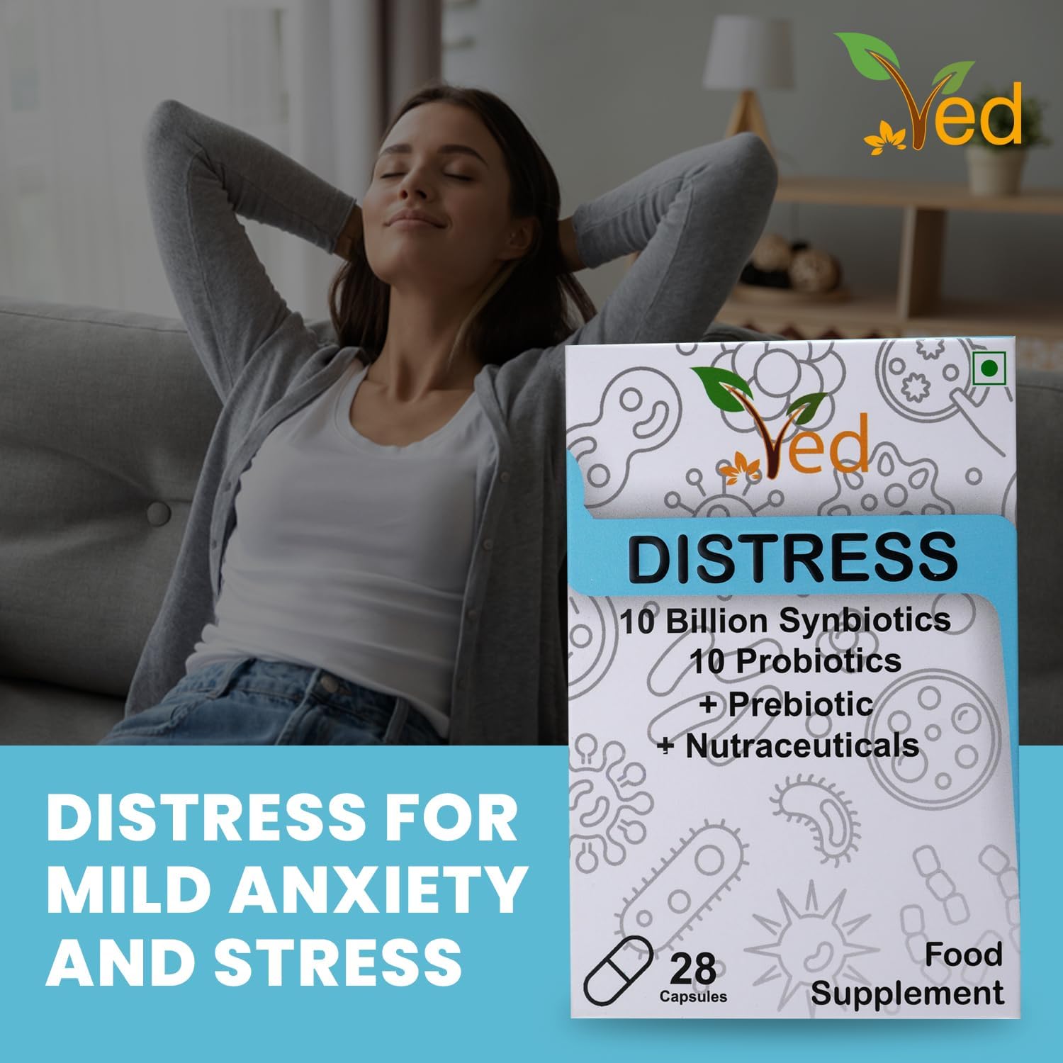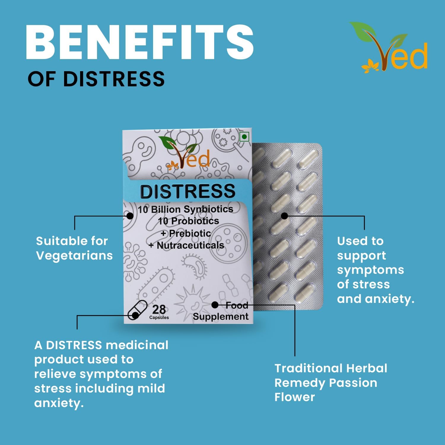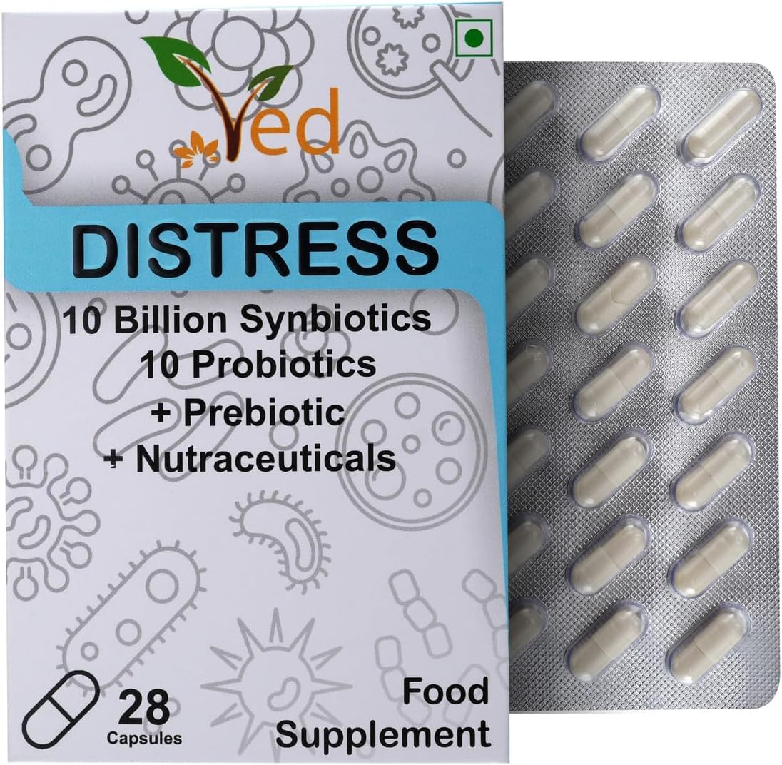 VED Distress Complex Probiotic and Prebiotic Complex – 10 Billion CFU – 28 Probiotic Capsules for Women and Men – Lactobacillus Piantarum, Casei, Rhamnosus, 28 Day Supply