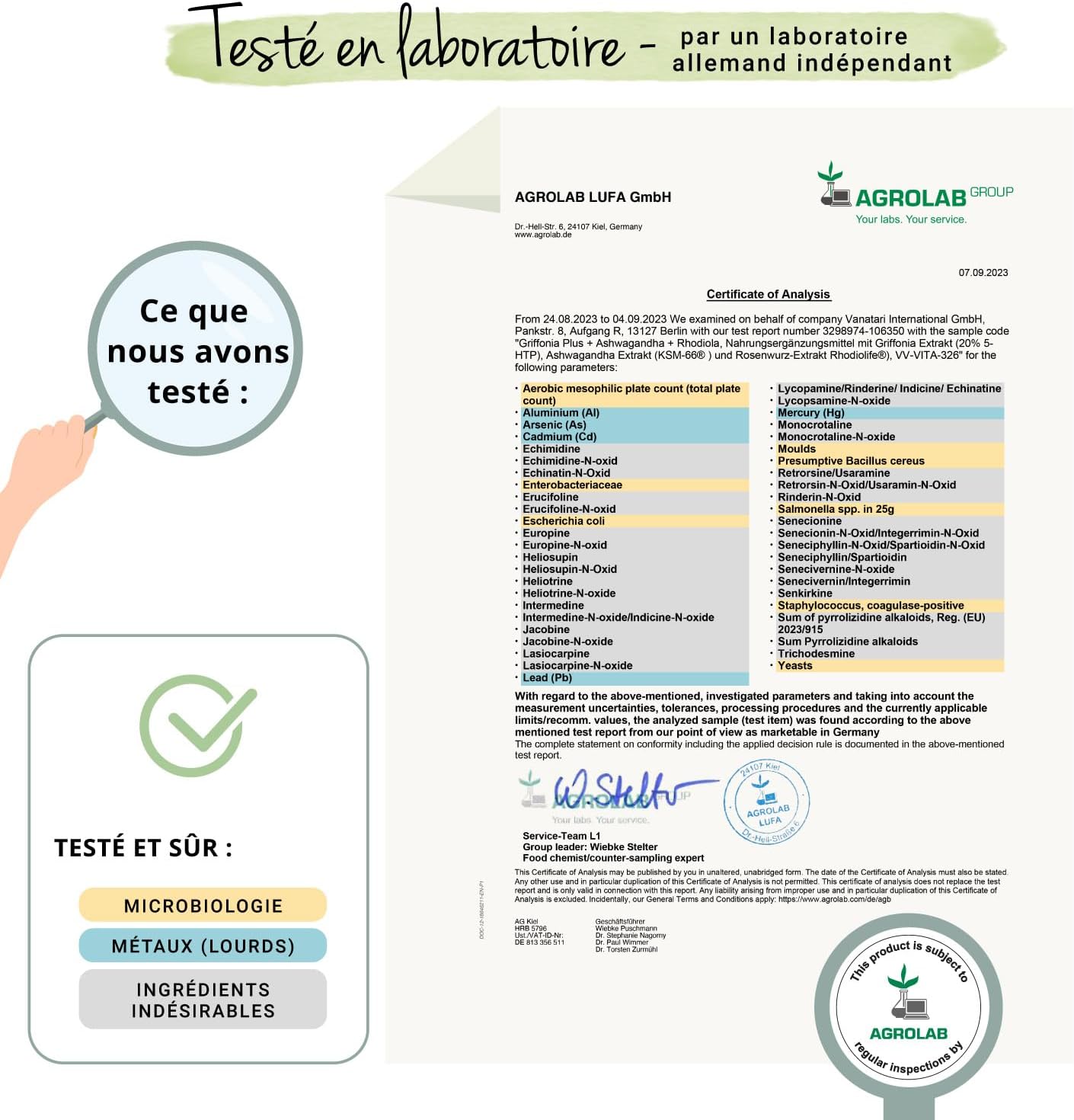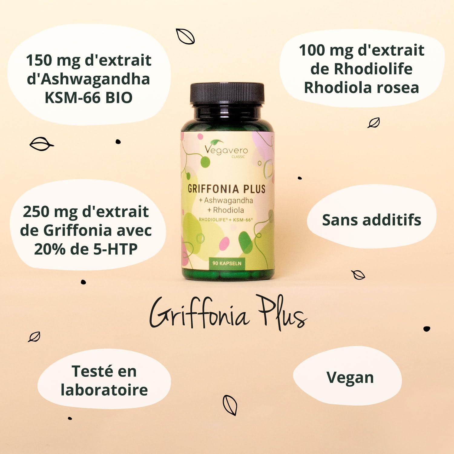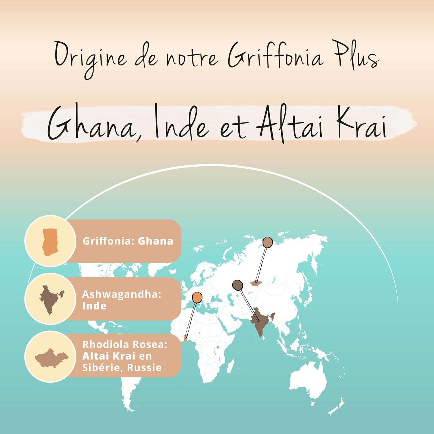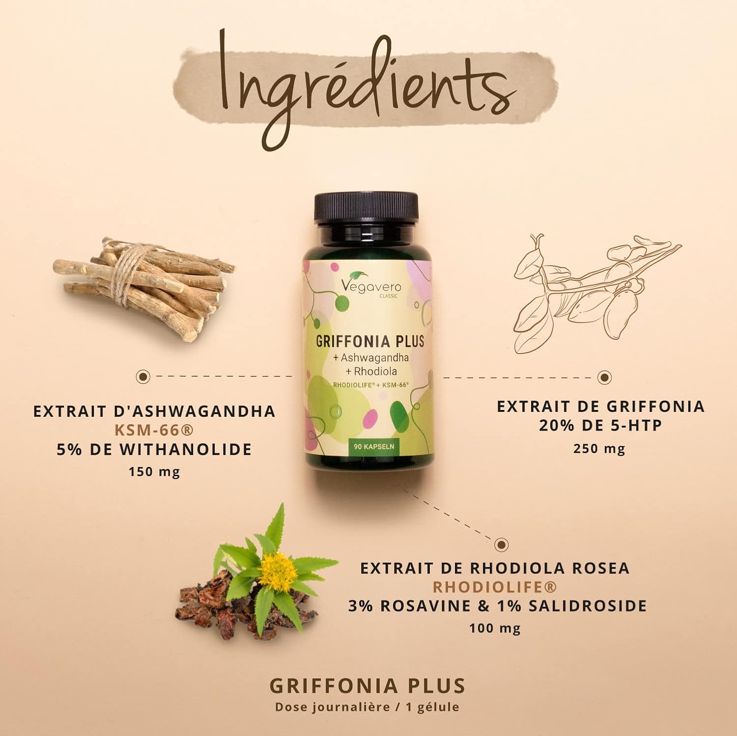 The properties of rhodiola, an adaptogen, have long been known and that is why ashwagandha is called “king of Ayurvedic herbs” in Ayurvedic medicine. For 5htp griffonia, a natural anxiolytic, we rely on a non-selective extract containing 20% of 5-htp (5-hydroxytryptophan) to avoid any risk of overdose. It would improve sleep and have anti-stress properties.