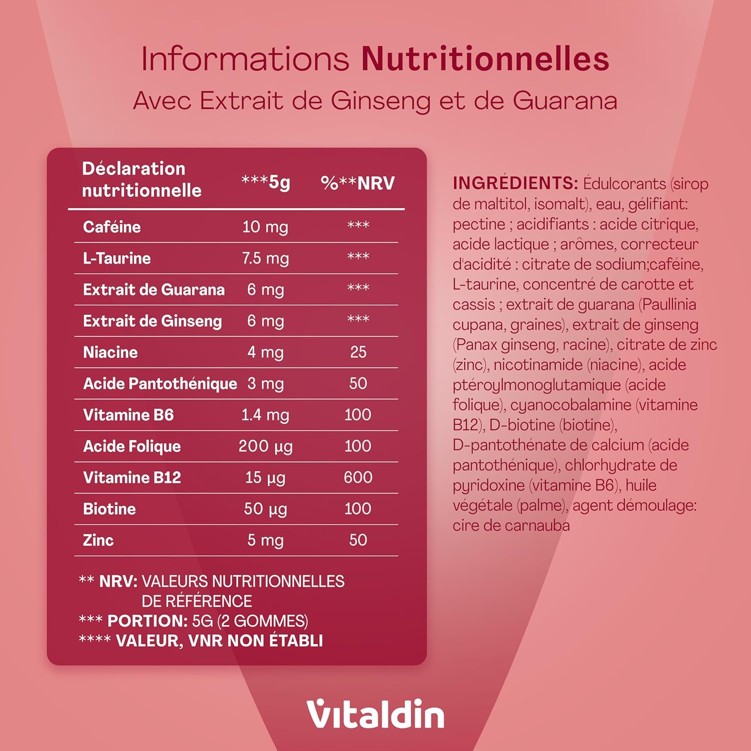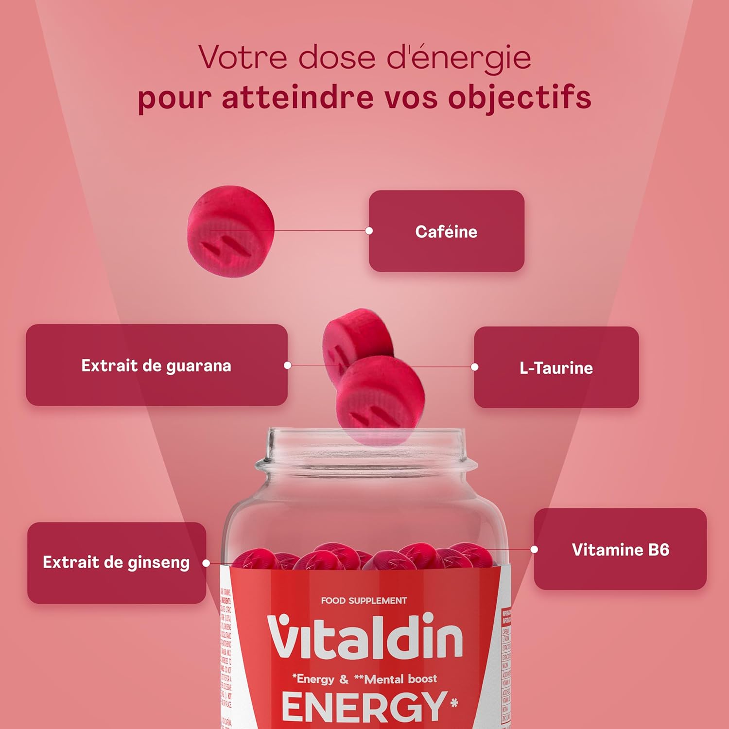 Vitaldin Energy contient vitamine B12 et zinc, contribuant au fonctionnement normal du système nerveux et à la fonction cognitive. Aide à réduire la fatigue, favorise clarté mentale et concentration, sans sucre, végan.